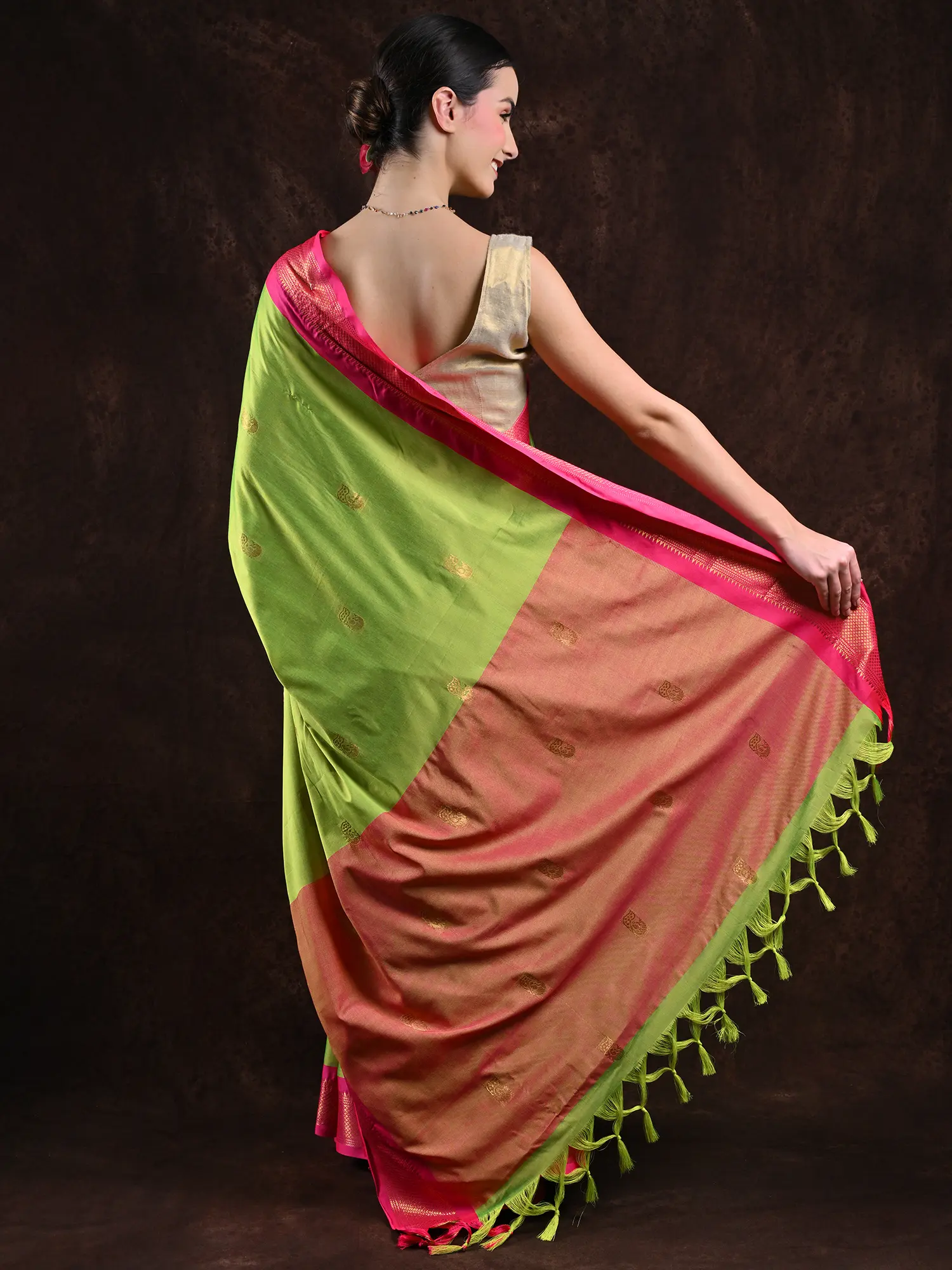 The striking contrast between the vibrant green hue and the minimal Zari woven peacock motifs creates a visually captivating drape in this art silk saree.