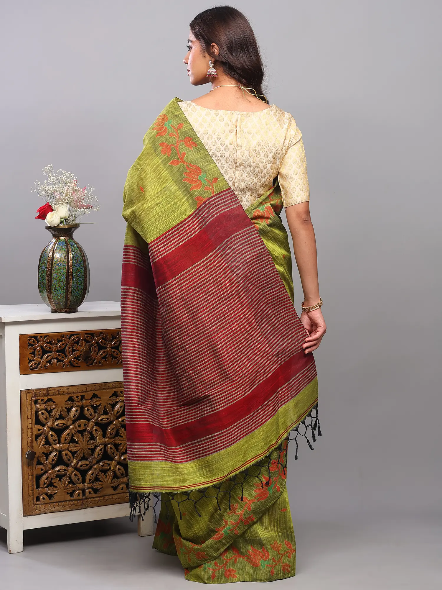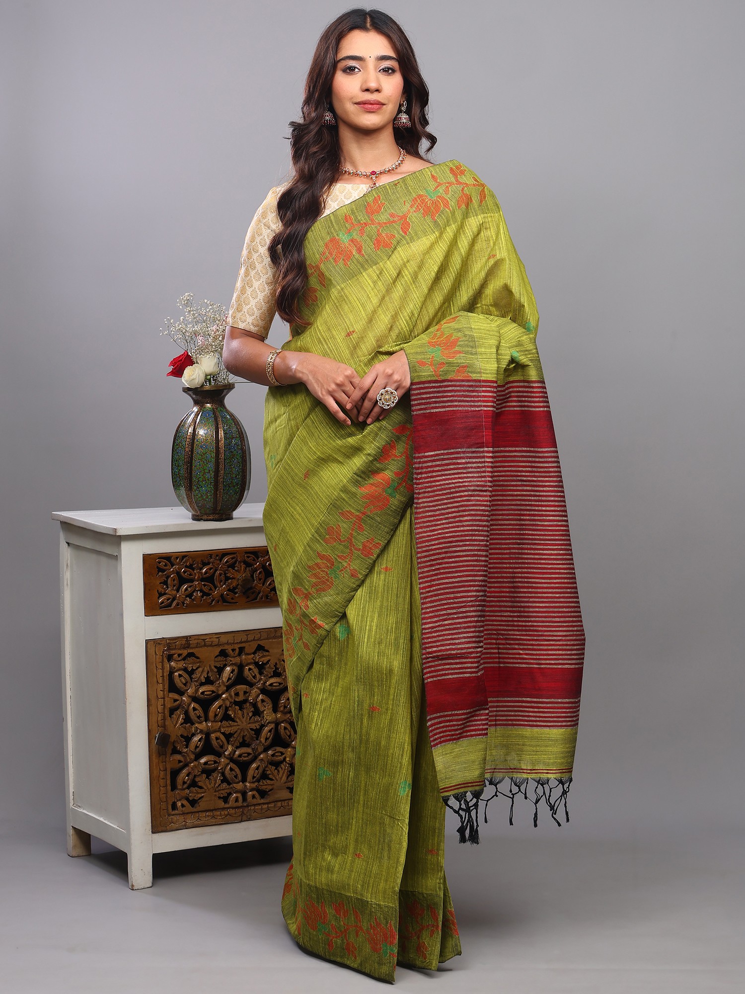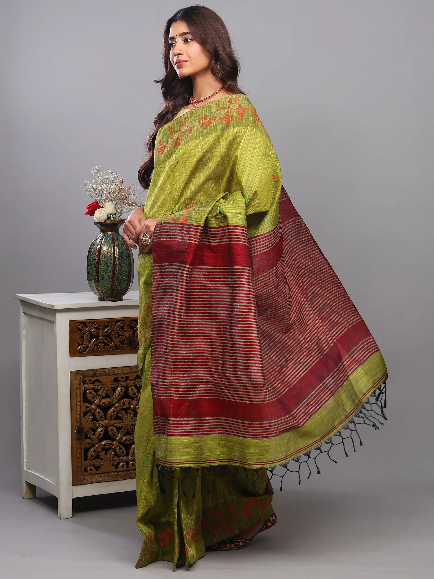 Adorning the body of the saree are delicate, scattered floral motifs in warm orange and red. These charming embellishments are woven with precision, appearing as if they've bloomed organically across the fabric. The true showstopper, however, is the striking border. A broad band of rich red stripes, interspersed with fine metallic threads, creates a dynamic contrast against the green. This bold yet sophisticated border is further accentuated by a generous fringe of black tassels, lending a touch of playful sophistication.