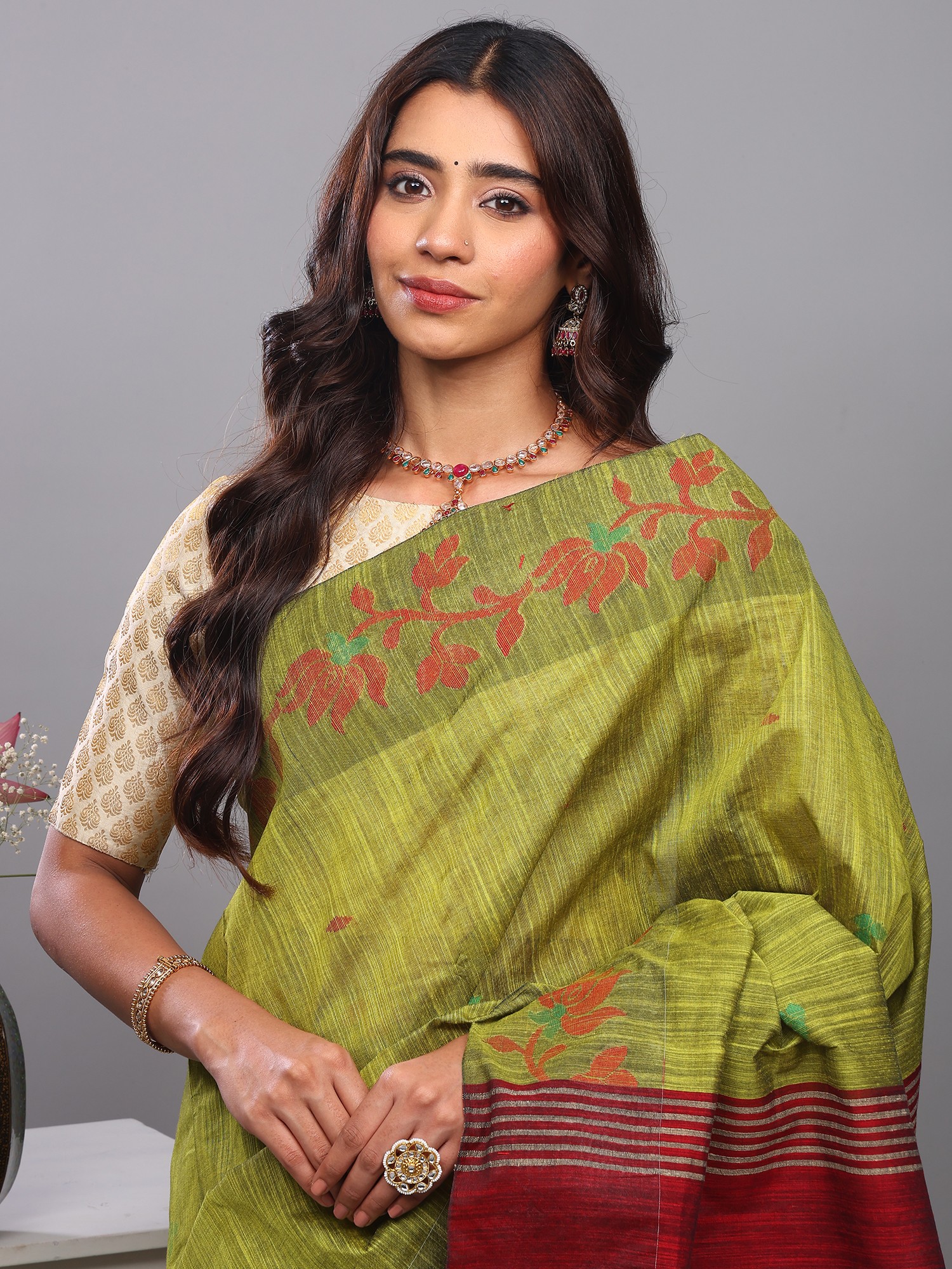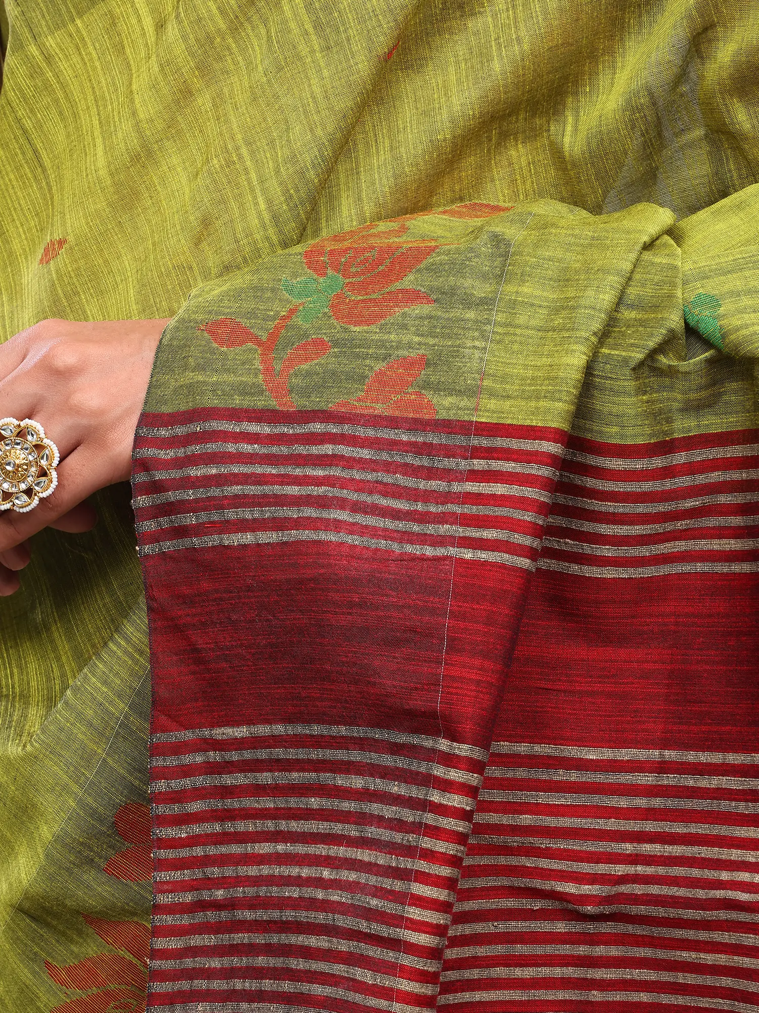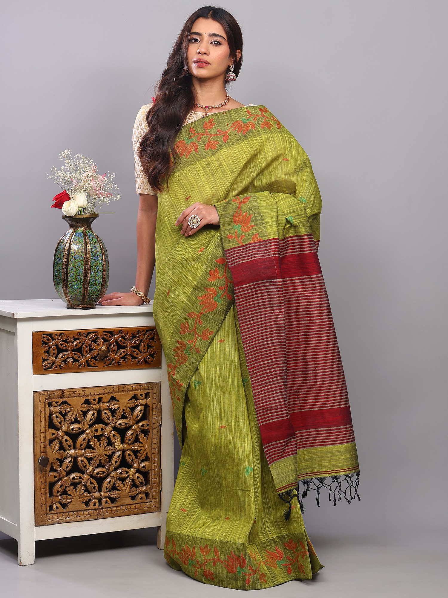 Adorning the body of the saree are delicate, scattered floral motifs in warm orange and red. These charming embellishments are woven with precision, appearing as if they've bloomed organically across the fabric. The true showstopper, however, is the striking border. A broad band of rich red stripes, interspersed with fine metallic threads, creates a dynamic contrast against the green. This bold yet sophisticated border is further accentuated by a generous fringe of black tassels, lending a touch of playful sophistication.