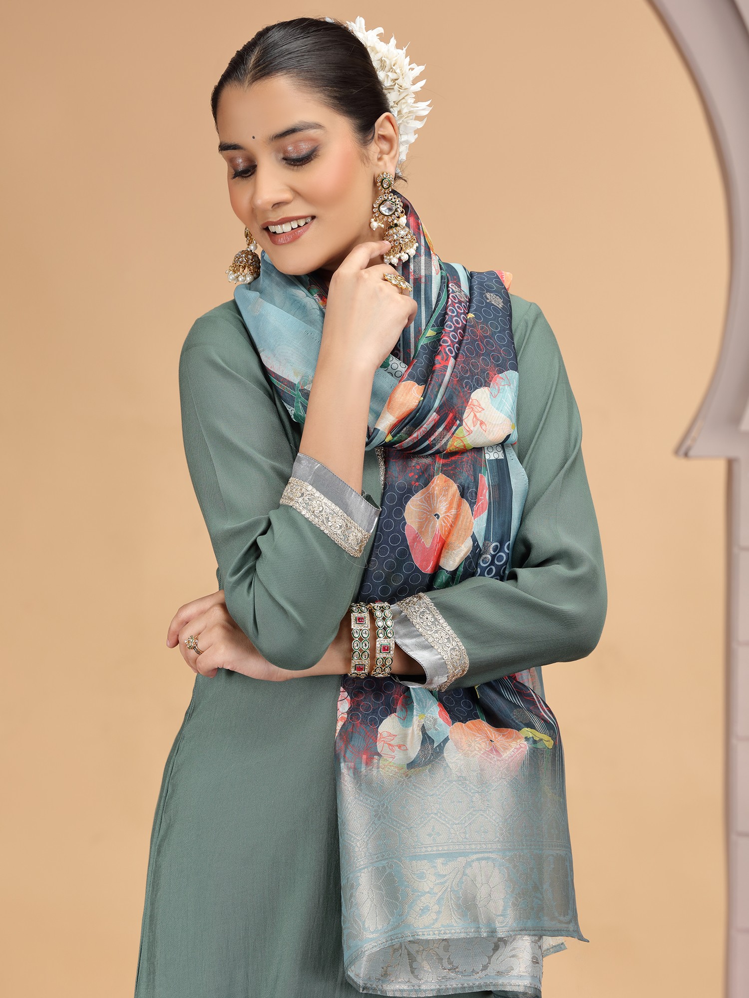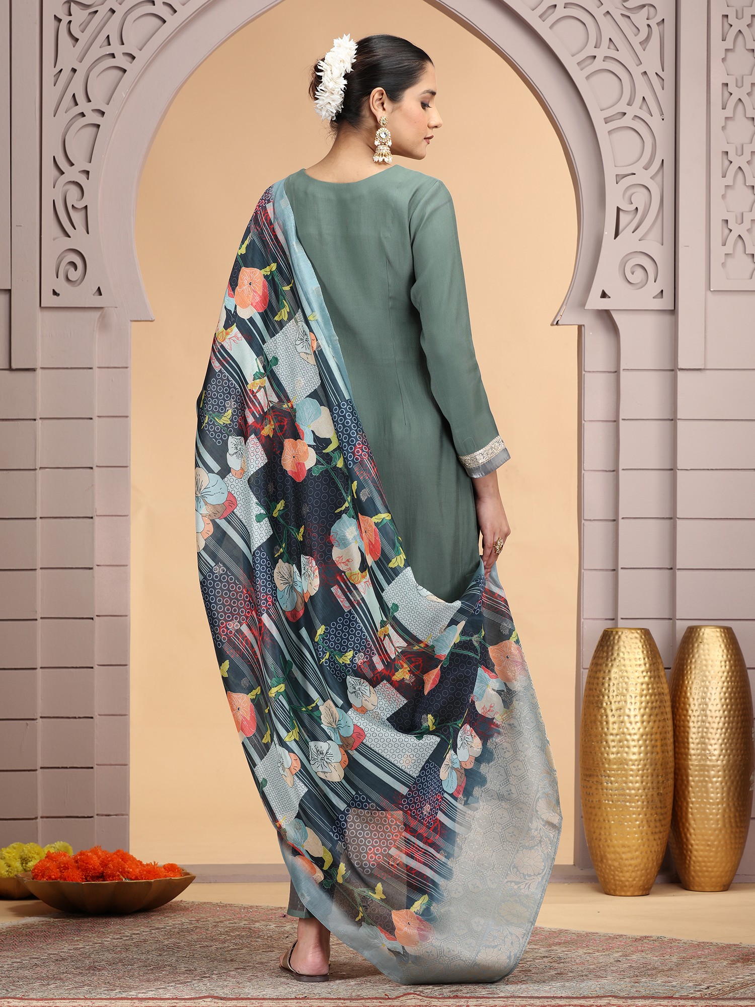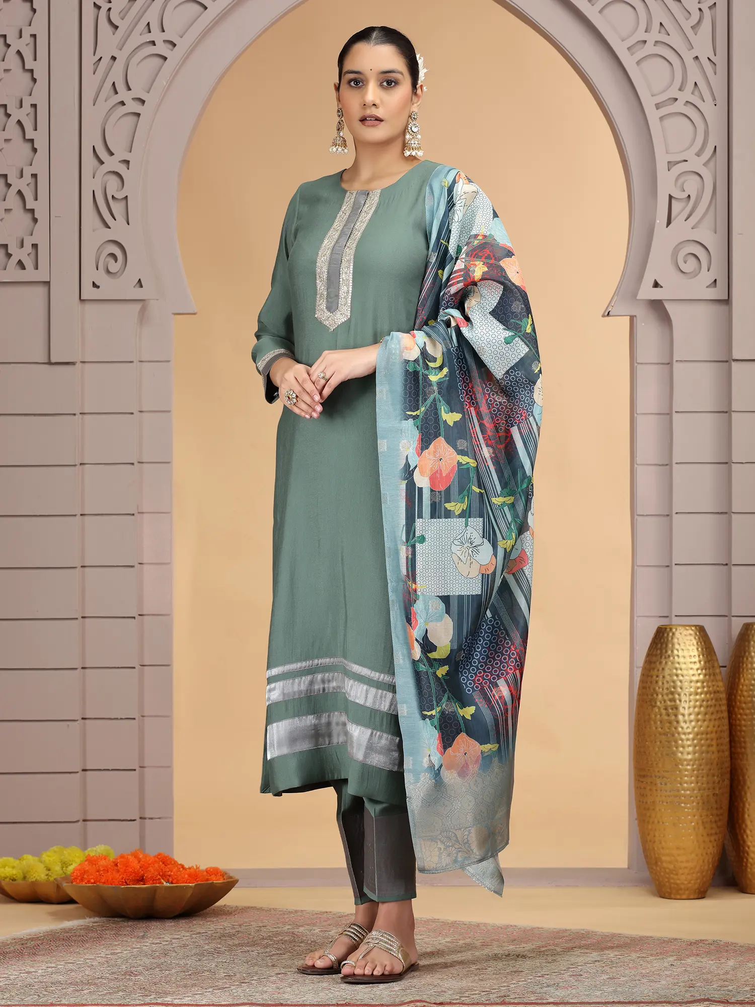 The soft grey-green hue of the chiffon is both calming and elegant, making it a versatile choice. Contrasting bands of subtle silver detailing are strategically placed along the hem and sleeves, offering a contemporary flourish. The richly patterned Chanderi jacquard dupatta provides a vibrant focal point, its artistic floral motif and intricate geometric borders adding depth and visual interest. You'll appreciate the thoughtful design that balances traditional elegance with modern sensibilities.