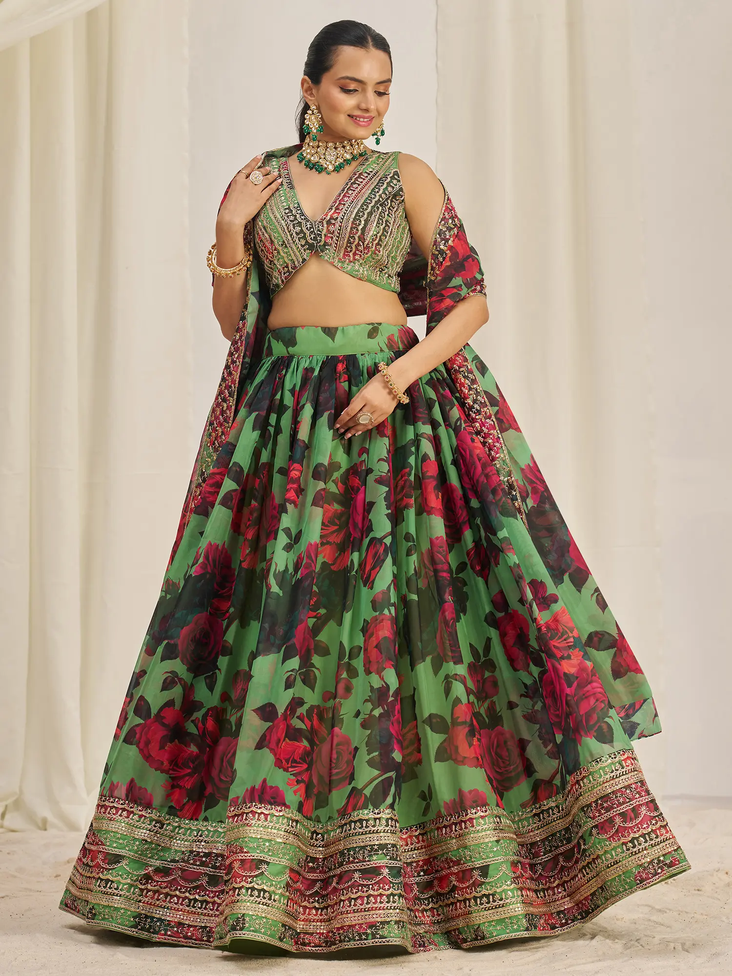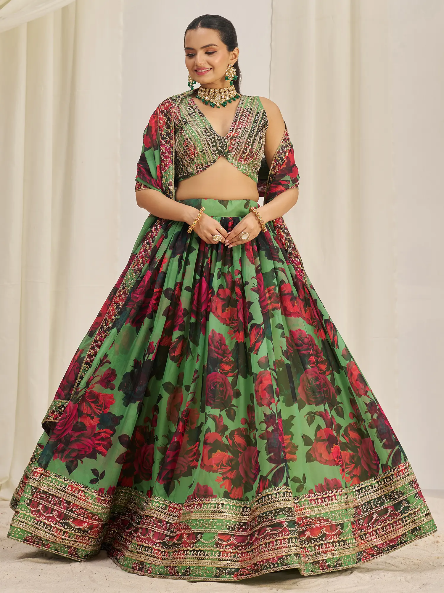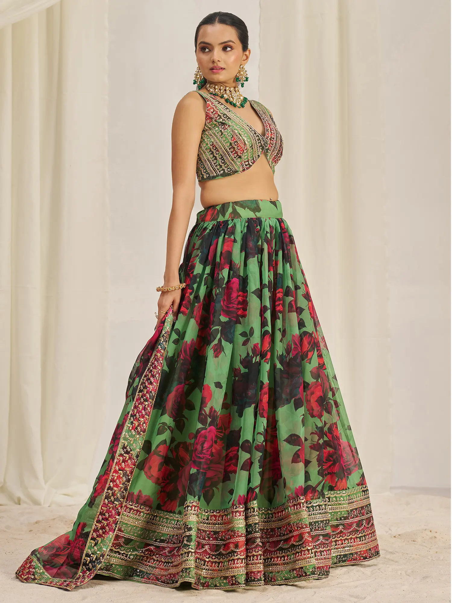 Embrace timeless beauty with this breathtaking lehenga set, a harmonious blend of vibrant floral artistry and sophisticated design. The soft, ethereal organza fabric forms the foundation of this exquisite ensemble, offering a graceful drape that moves with every step. The lehenga itself is a canvas of deep, lush green, brought to life by a profusion of richly rendered roses in bold shades of crimson and burgundy. These captivating floral motifs are scattered across the expanse of the skirt, creating a visually stunning and romantic appeal.
