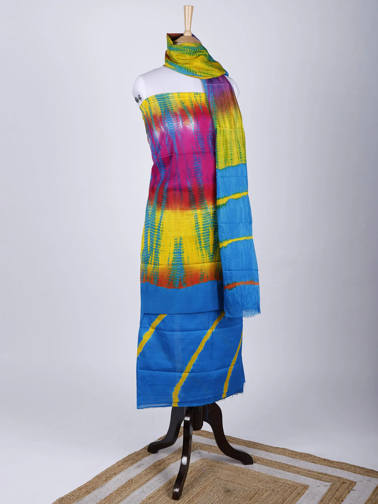 The fabric is a breathtaking canvas of contrasting and harmonious colors. Bold strokes of hot pink, vibrant yellow, and deep blue are interspersed with subtle green and orange accents. The tie-dye process creates a beautiful gradation and organic flow of color, ensuring that each piece is unique. The patterns, while distinct, blend seamlessly to create a cohesive and eye-catching masterpiece. The included dupatta mirrors this stunning color palette and design, offering a complete and polished look.