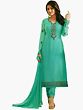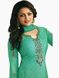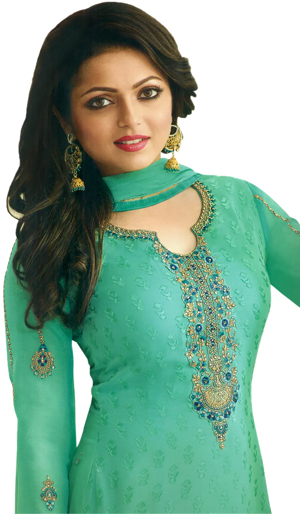 Embrace a sophisticated and refreshing aesthetic with this exquisite salwar kameez set, rendered in a captivating gumdrop green hue. The georgette fabric drapes beautifully, offering a light and airy feel that's perfect for a variety of occasions. The subtle yet intricate self-weave pattern woven into the georgette adds a layer of textural depth and visual interest, preventing the vibrant color from becoming overwhelming and instead, lending it a refined and luxurious quality.