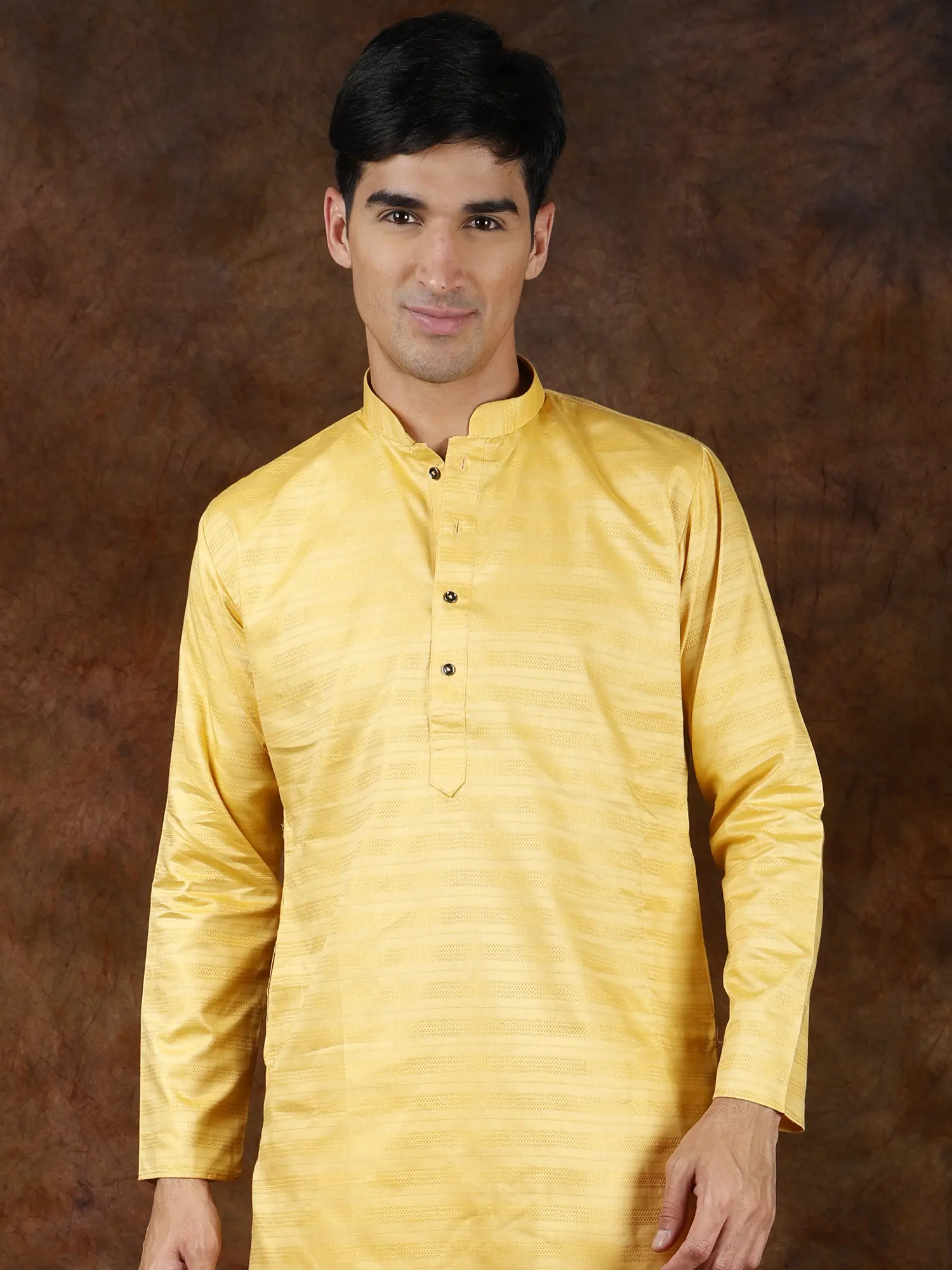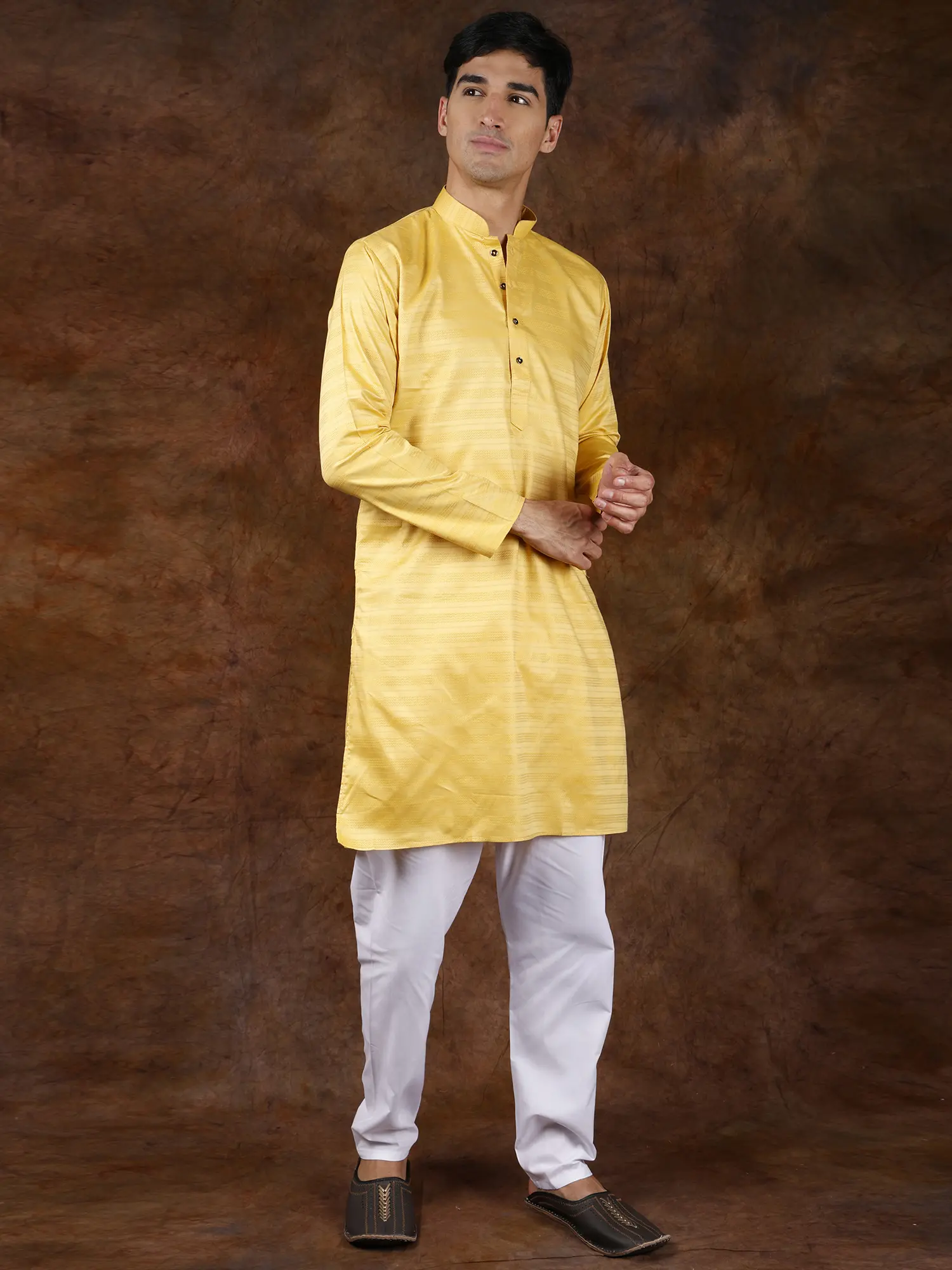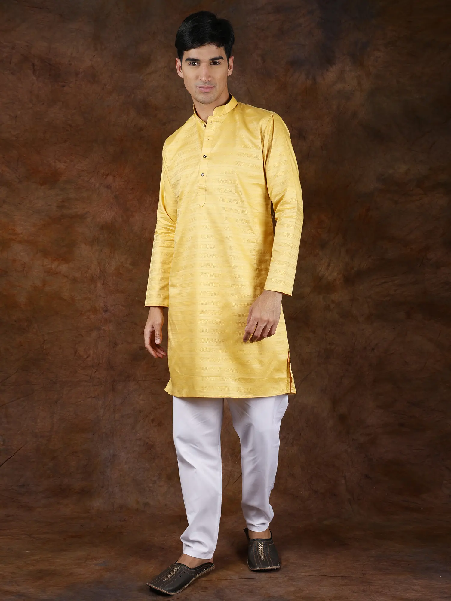 Paired with a crisp, white pajama, this ensemble creates a striking contrast that highlights the richness of the yellow kurta. The pajama's relaxed fit and drawstring waist ensure a comfortable and personalized wear. This kurta pajama set is a testament to traditional Indian craftsmanship, reinterpreted for the contemporary wardrobe. It’s a piece that speaks of cultural pride and a refined sense of style. Effortlessly elevate your ethnic wear collection with this timeless and comfortable Haldi-yellow kurta pajama.