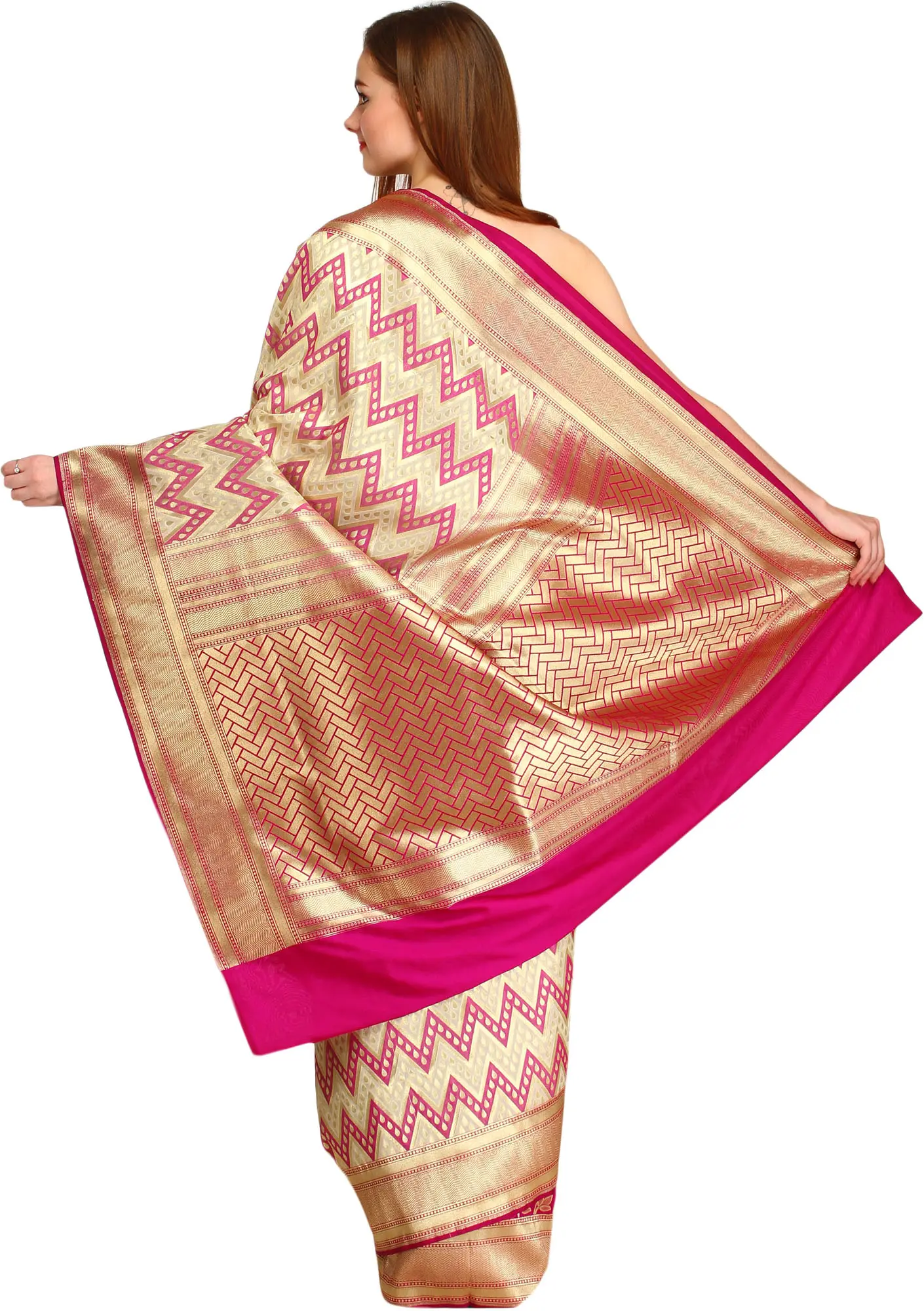 What sets this saree apart is its captivating "half and half" design, showcasing two distinct yet harmonious patterns. The upper portion of the saree is adorned with a bold zigzag weave in a vibrant pink against a sophisticated cream background. This geometric motif adds a modern edge, creating a visually dynamic effect. This striking pattern is framed by a rich gold border, further enhancing its intricate beauty and adding a touch of regal splendor.