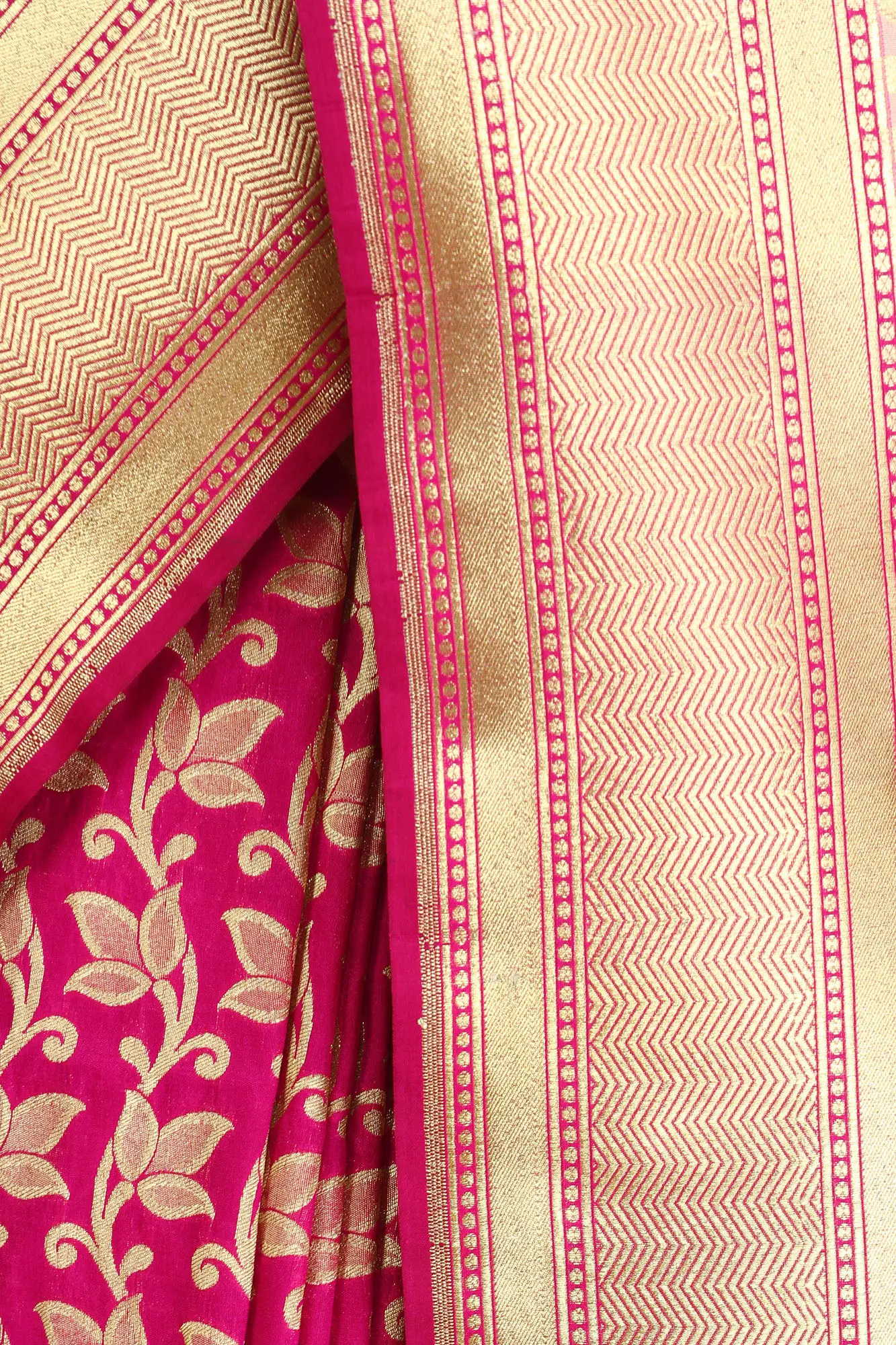 Transitioning seamlessly, the lower half of the saree reveals a denser, more traditional brocade pattern. Here, delicate golden floral motifs are meticulously woven onto a deep, alluring magenta silk. This classic jaal design evokes a sense of timeless romance and grace, offering a beautiful contrast to the modern zigzag on the upper half. The interplay between these two distinct patterns creates a unique and unforgettable aesthetic, ensuring you'll make a statement at any occasion.