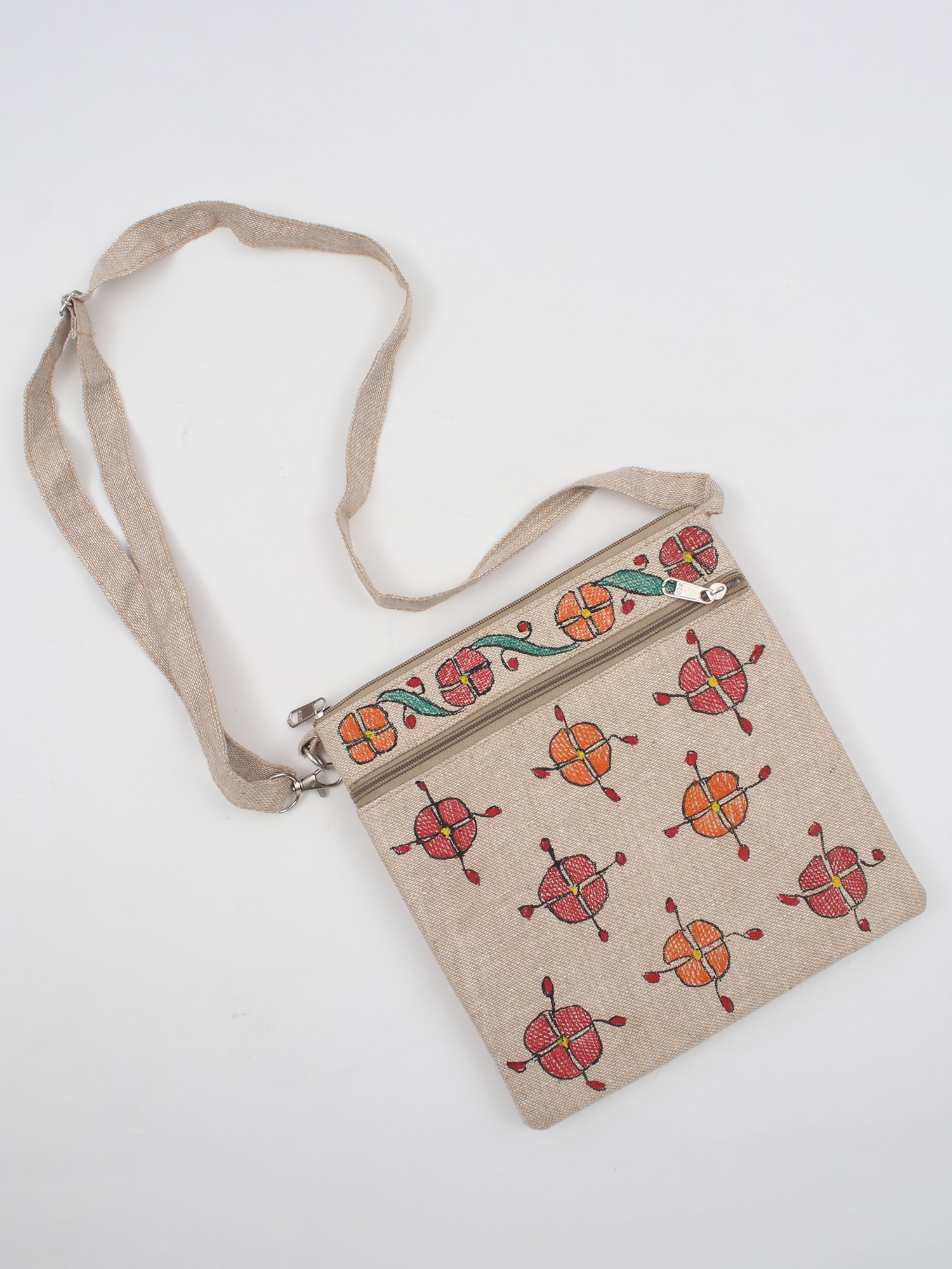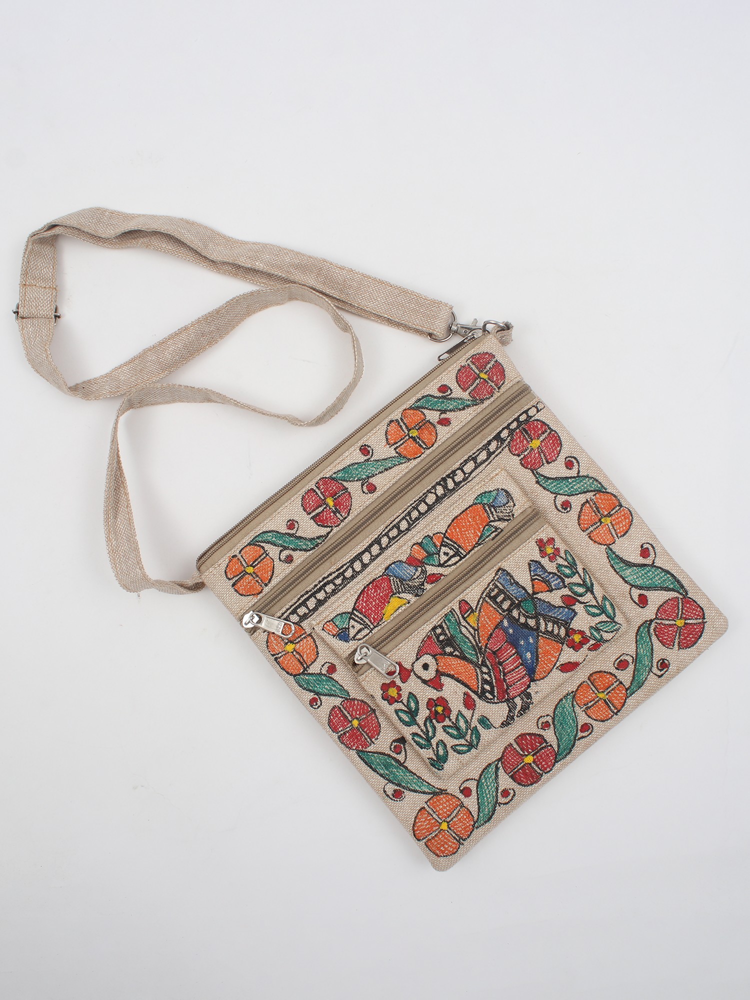In Madhubani art, the images of fishes and peacocks carry sacred significance. Fishes symbolize fertility and prosperity, while peacocks represent grace and beauty, often associated with divinity. This Hand-Painted Jute Sling Bag from Jharkhand skillfully incorporates these sacred symbols, enhancing the bag's aesthetic appeal. The intricate Madhubani art on the jute canvas creates a visual narrative, blending tradition with contemporary fashion.
