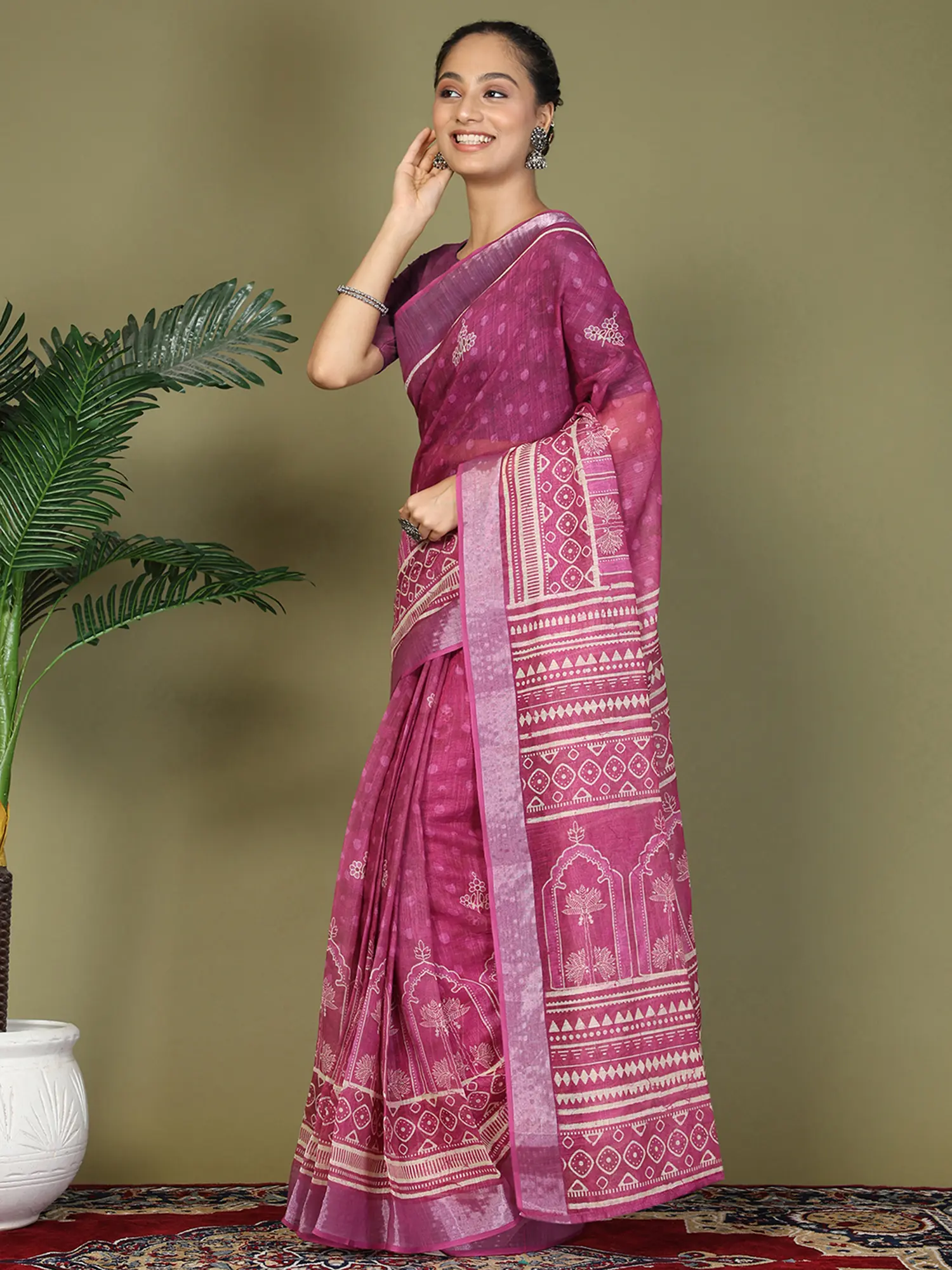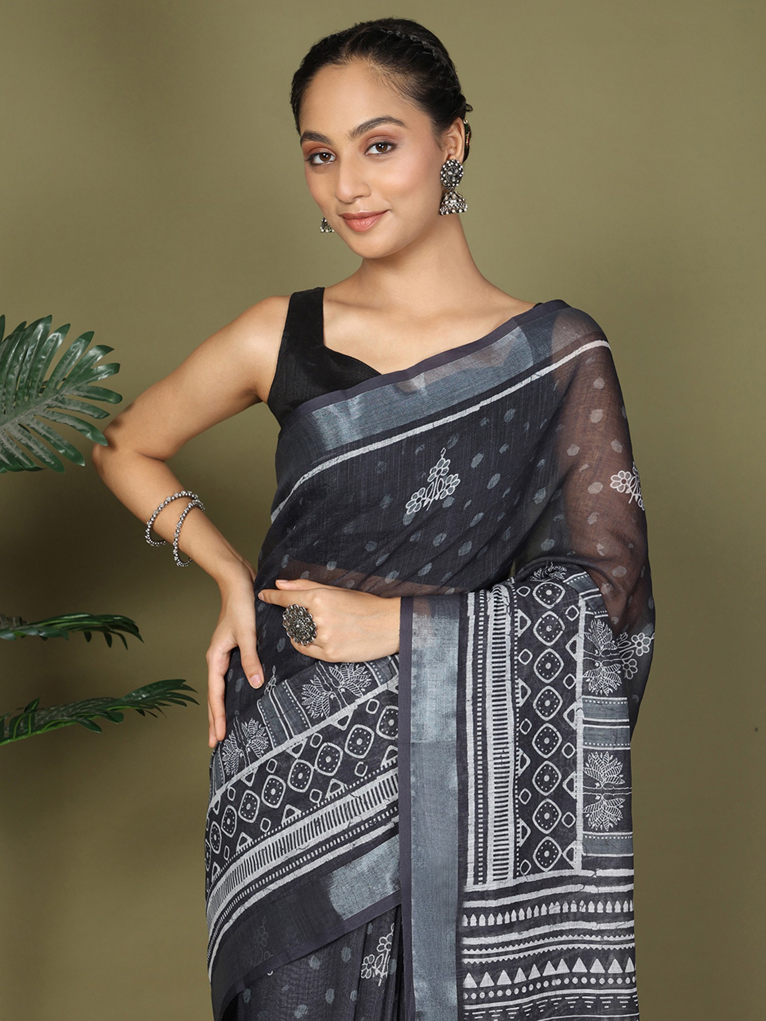 Cotton Saree with Block Printed Floral Motifs and Zari Border from Tamil Nadu