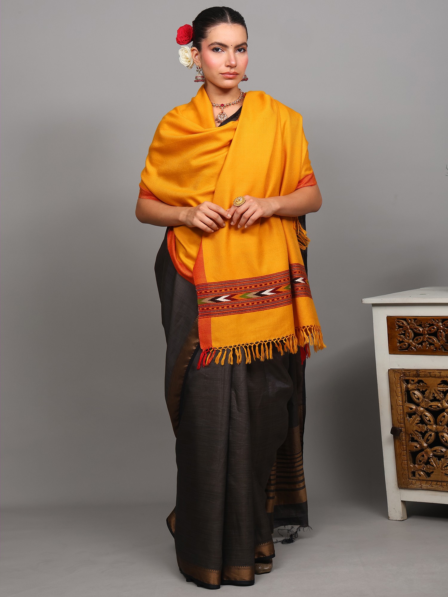Black-Ink Yak Wool Stole from Kullu with Kinnauri Woven Border in Multicolor Thread
