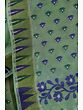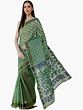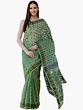 With the feathery feel of pure cotton and an elegant spread of green, this handloom Tangail saree from Bengal is a stylish and comfortable traditional wear, you can try for your everyday alluring looks. The field of the saree is beautified with exotic floral patterns and the pallu is embellished with the temple pallu designs, inspired by the drapes of South India, to bring a rich element. The pallu is covered in large white floral branches laid vertically while two blue floral vines flow horizontally to give a profusion of natural appeal to the drape.