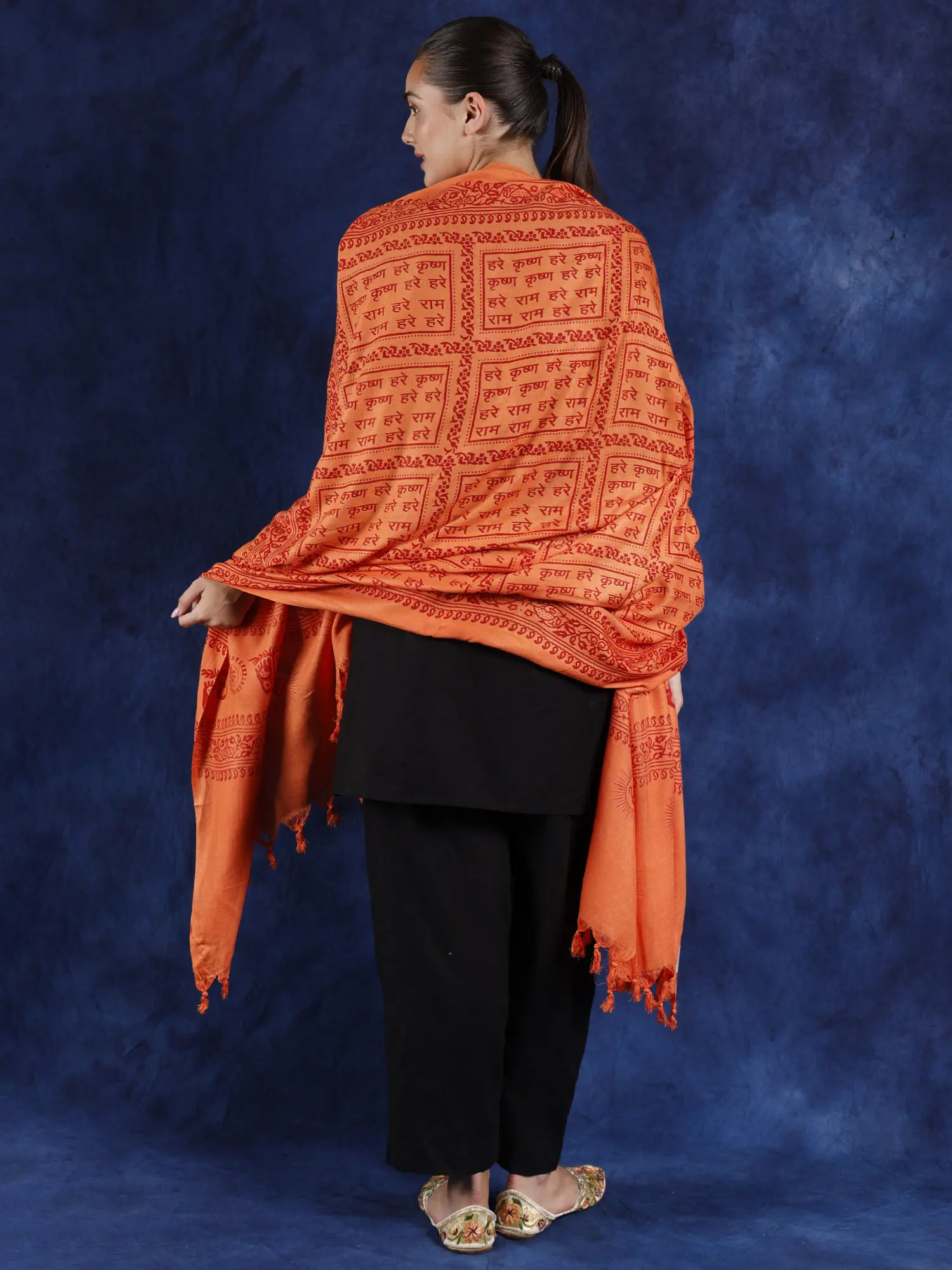 This shawl from Banaras with the sacred mantra “Hare Ram Hare Krishna” unfolds a tapestry of heavenly artistry. This shawl is a tribute to spirituality, intricately embroidered with vivid colors and wonderful designs. Its delicate touch, woven from the finest poly cotton, is a gateway to peace. Feel the warm embrace of tradition and prayer as you drape it.