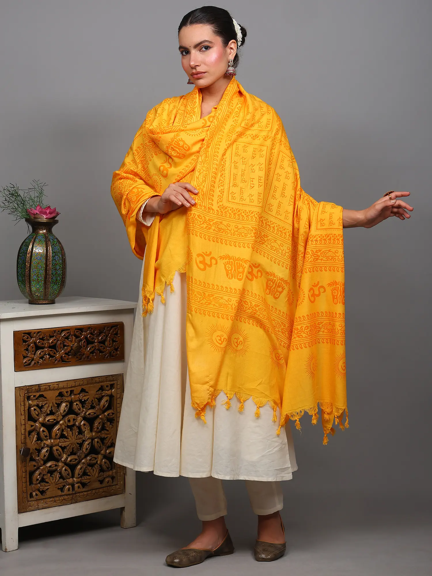 Made from a poly-cotton blend, this shawl offers the best of both worlds: the breathability and softness of cotton combined with the durability and easy care of polyester. This blend ensures that the shawl drapes beautifully, feels comfortable against the skin, and maintains its vibrant color and intricate print through countless uses and washes. The generous dimensions provide ample coverage, allowing you to wear it draped over your shoulders during prayer, meditation, or religious ceremonies. It can also be styled as a graceful addition to your ethnic attire, adding a touch of spiritual elegance to any outfit, whether for daily wear or special occasions. The delicate tassels along the hem add a final touch of artisanal charm, adding a subtle sway and movement to the fabric.