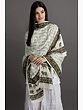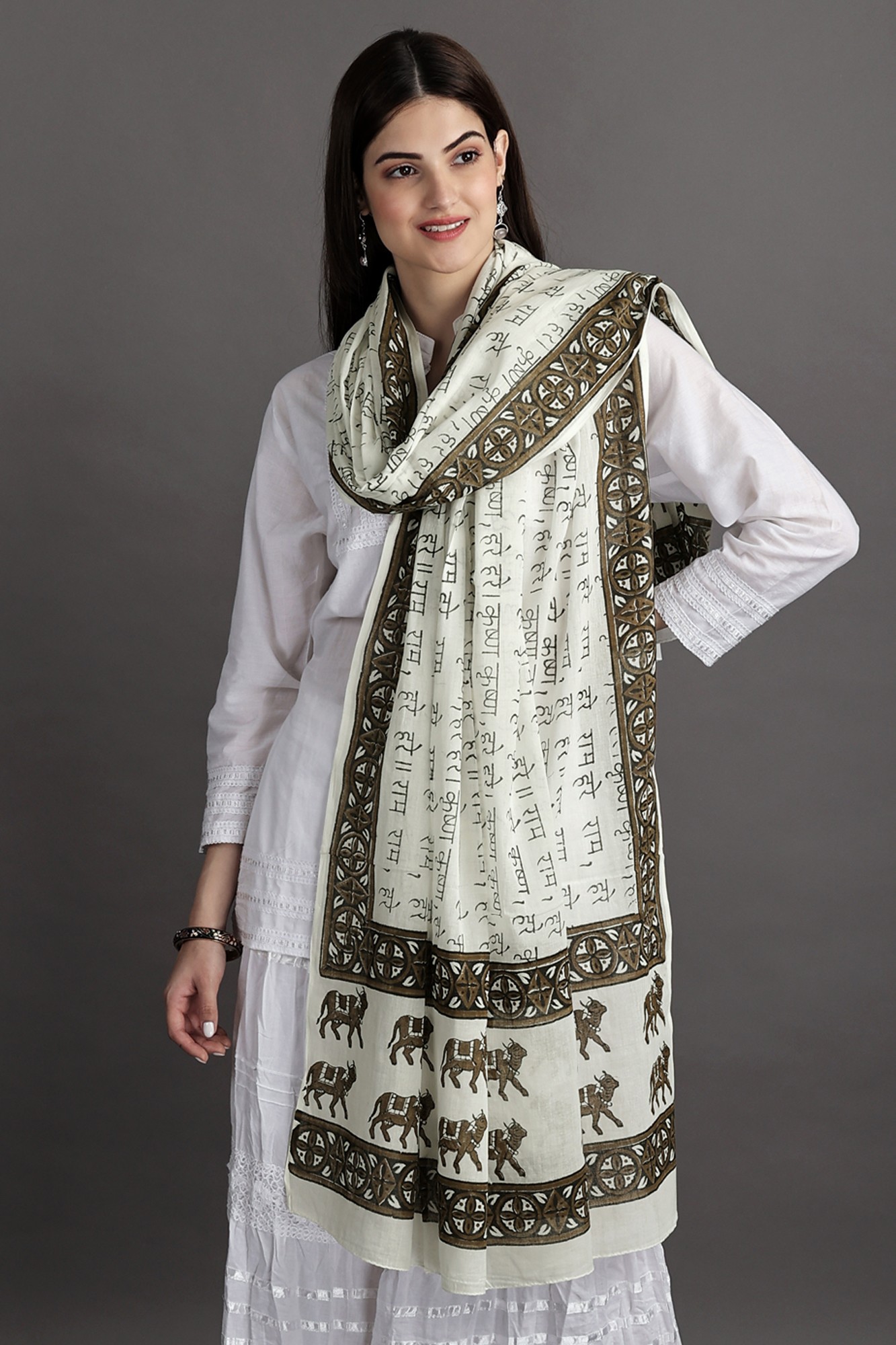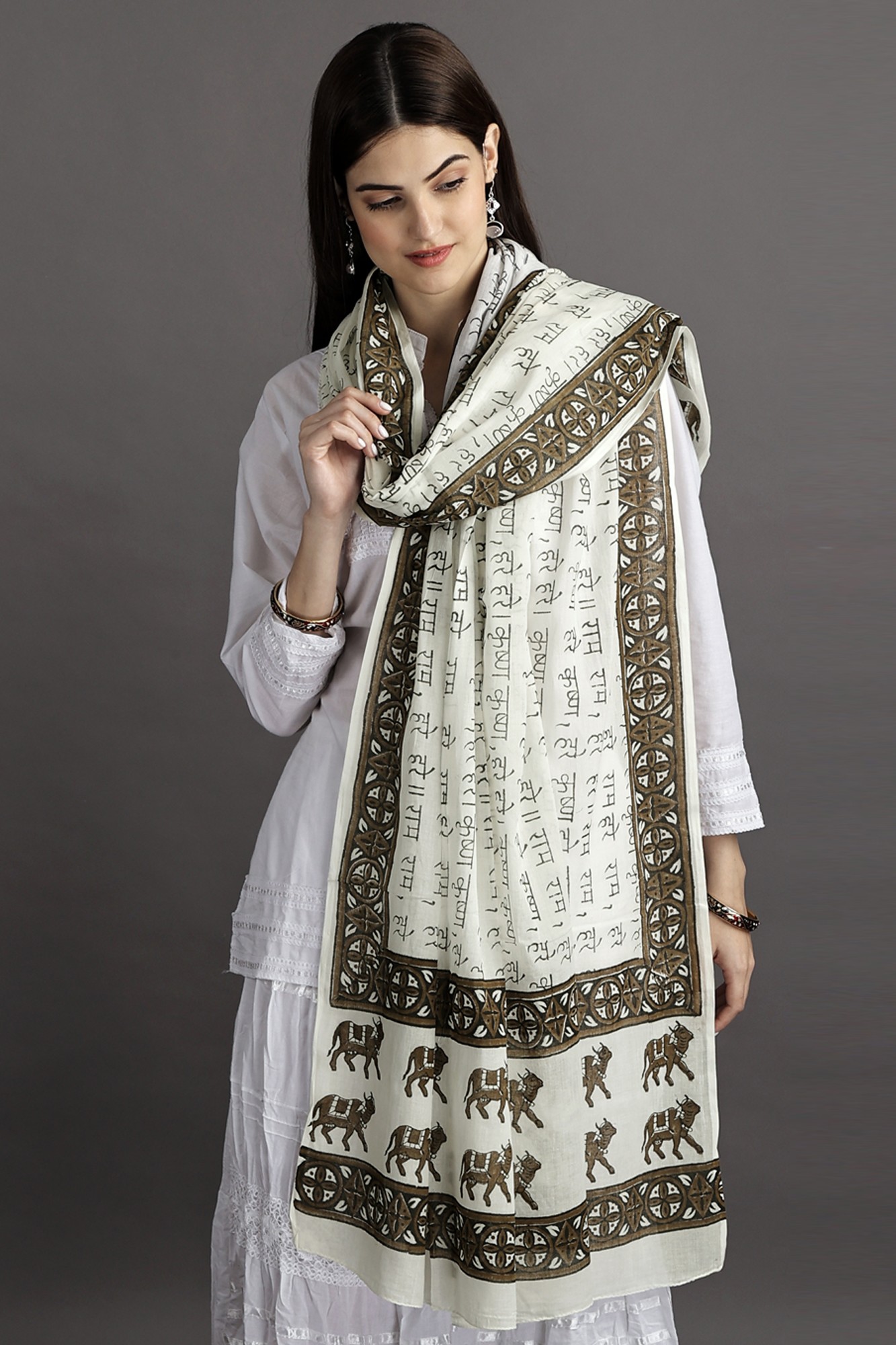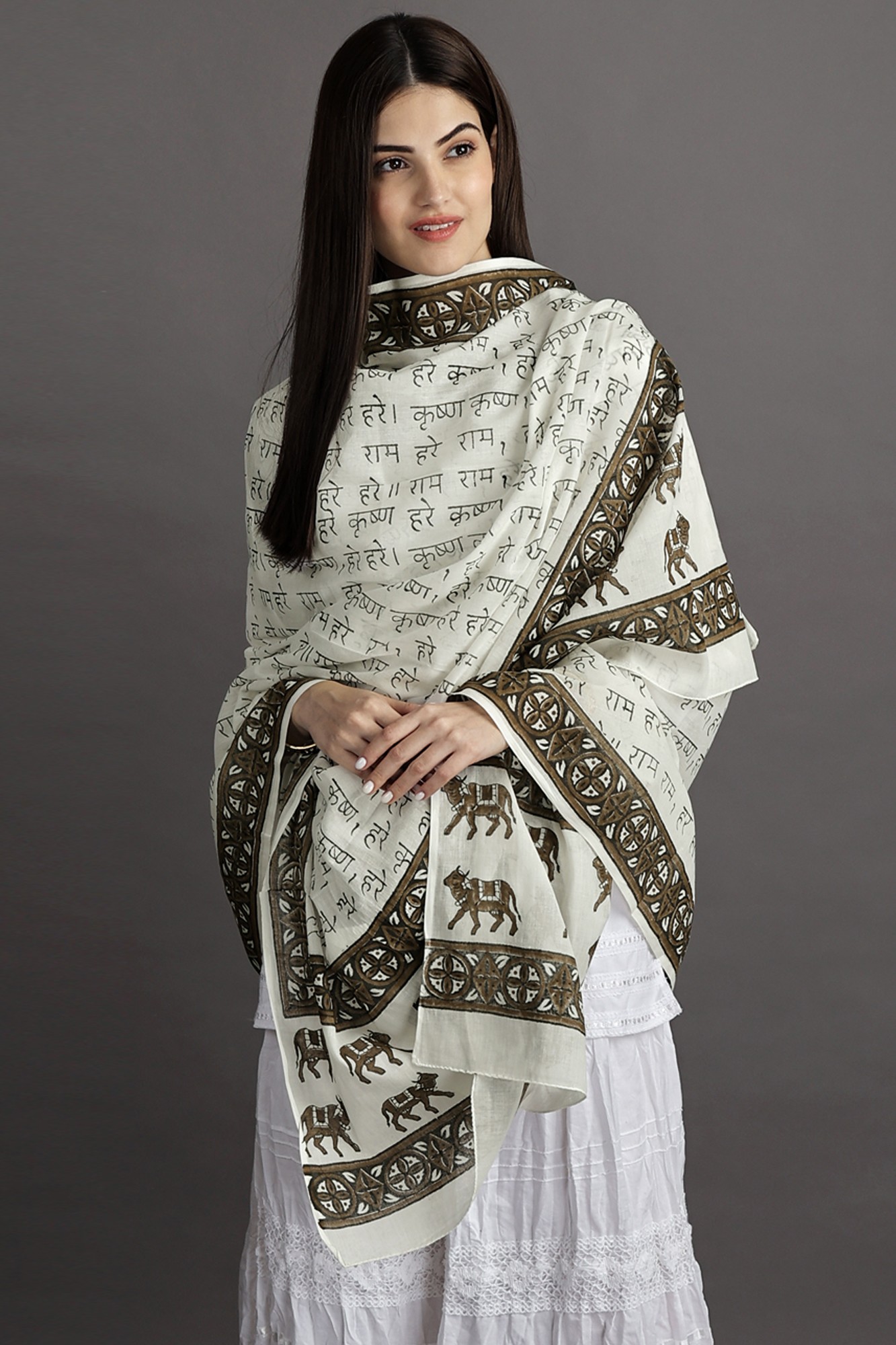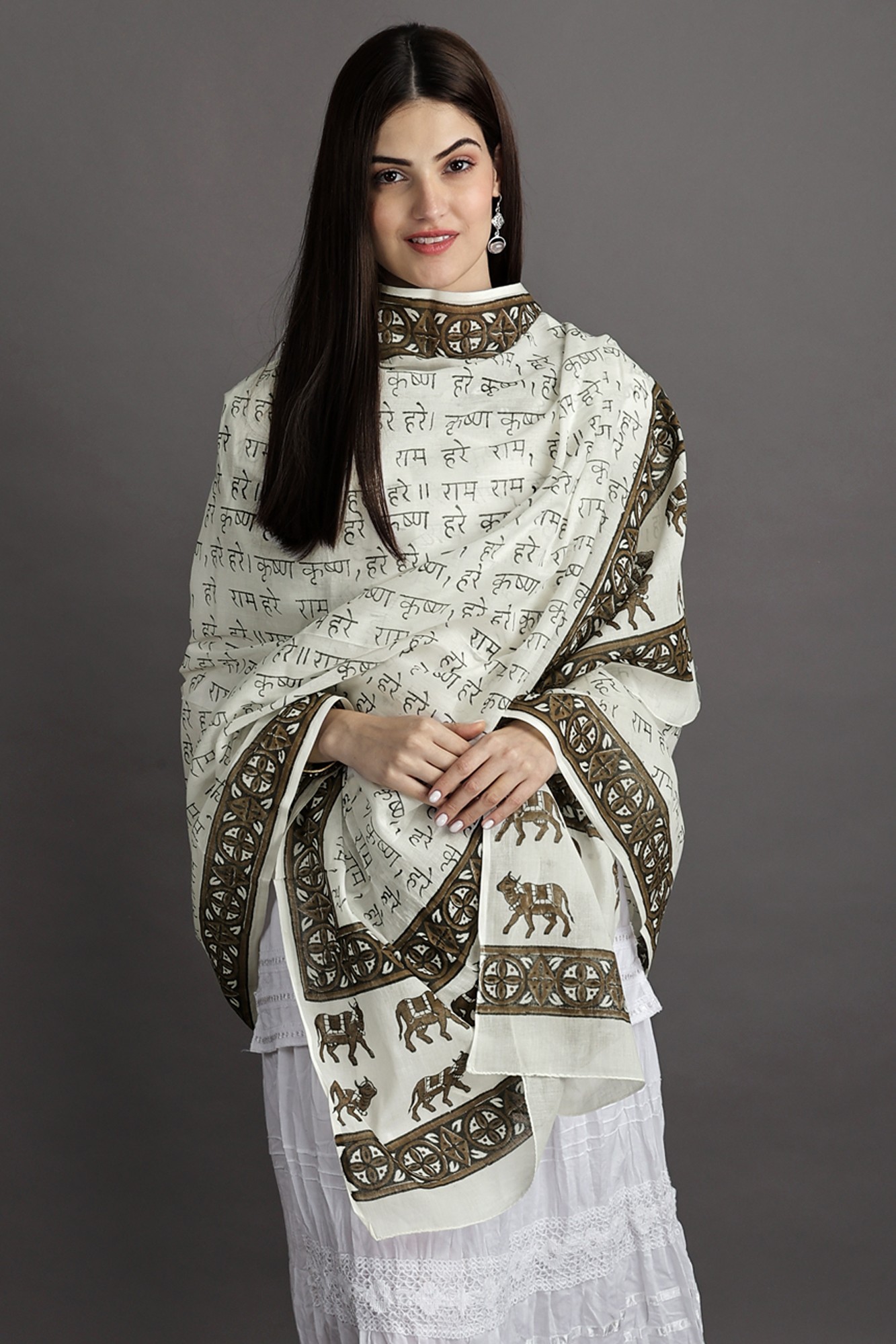 Woven with the sacred mantras of “Hare Ram Hare Krishna” and adorned with the gentle presence of cows on its border, this shawl is more than just a piece of cloth; it is a symbol of spiritual connection and reverence.