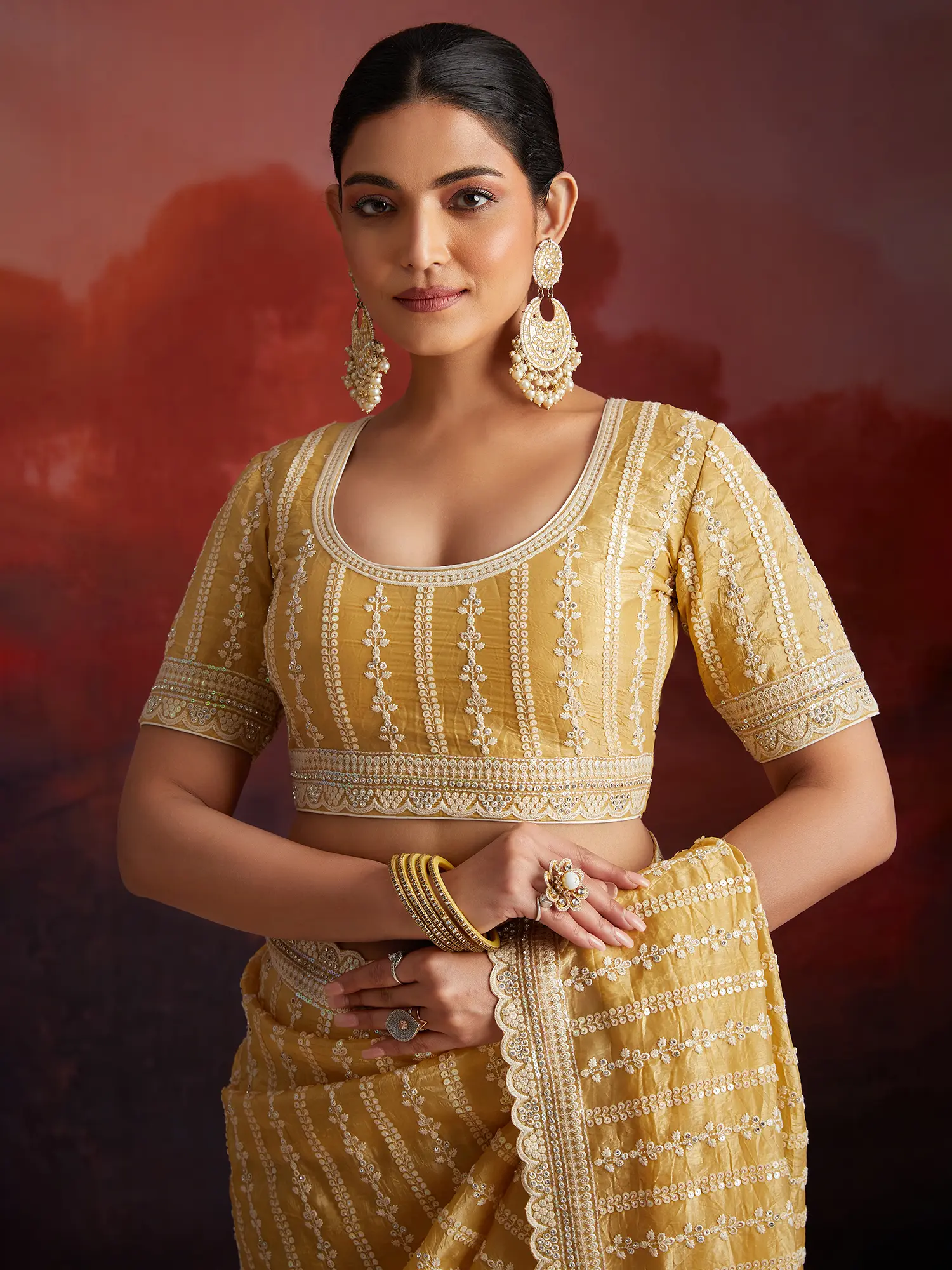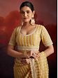 Immerse yourself in the radiant charm of this exquisite organza saree, a masterpiece designed to make you the cynosure of every celebration. The rich, harvest-gold hue evokes the warmth and splendor of autumnal sunsets, creating a captivating canvas for the intricate detailing that adorns its surface. Crafted from sheer, luxurious organza, this saree drapes with an ethereal grace, offering a delicate translucence that adds to its allure.