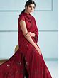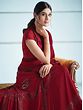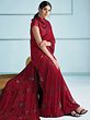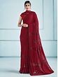 Prepare yourself to walk the red carpet of parties with this haute-red designer saree. Made with a comfortably stretchable lycra fabric, the saree offers ease and elegance with a gorgeous appeal. The deep red base of the drape comes to life with rich sequin work on the border and floral motifs on the body. A luxurious element is added to the ensemble with the taffeta silk blouse, the perfect addition to make you look like a vision in red.