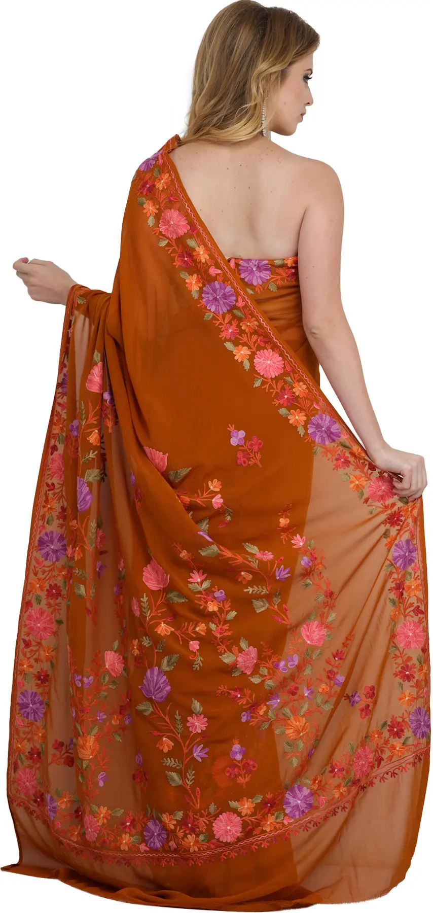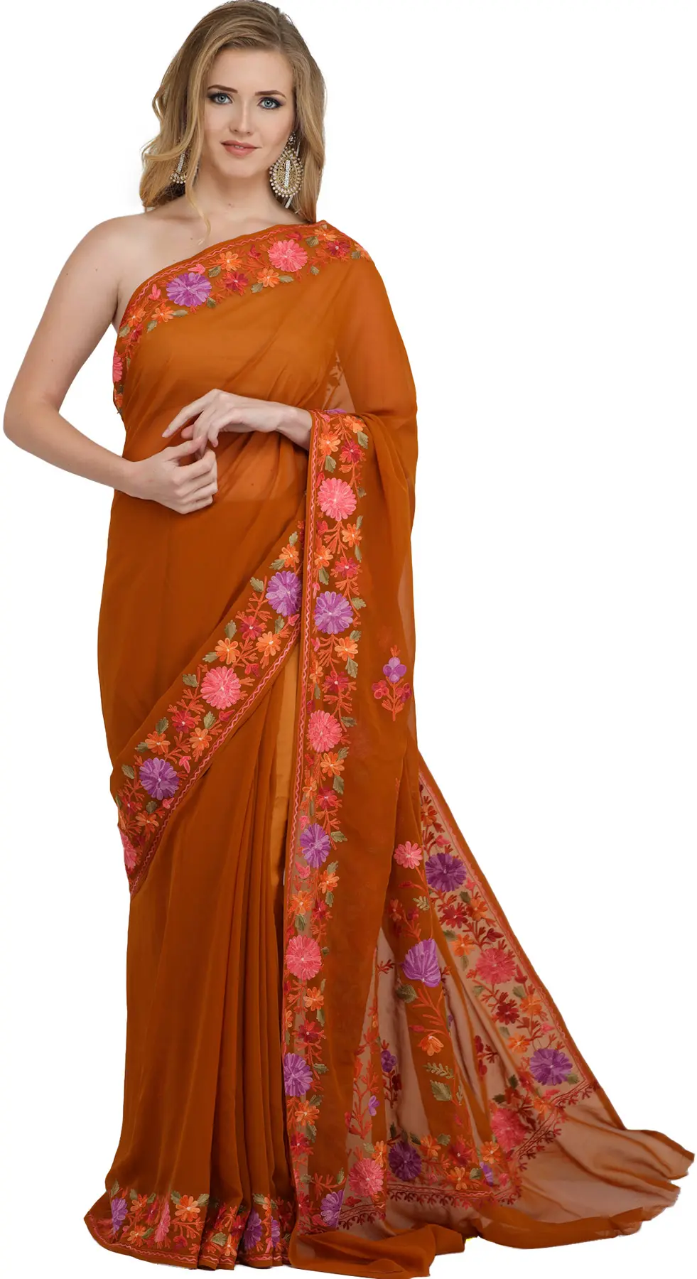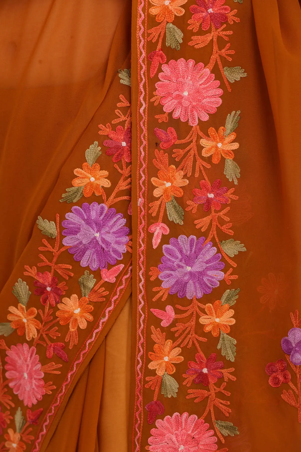 Georgette Saree with Chain Stitch Aari Embroidered Floral Border from Kashmir