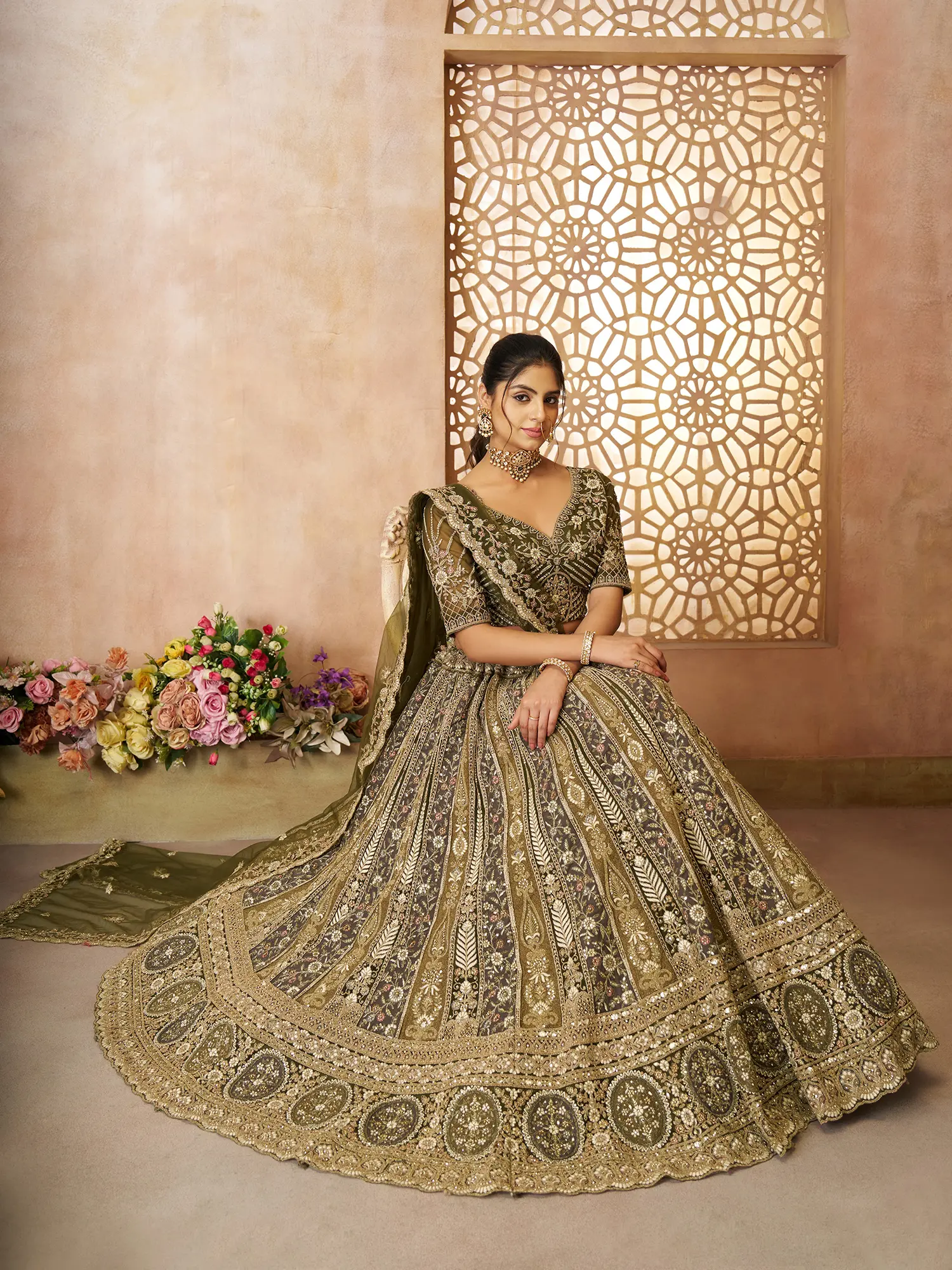 Bottle-Green Net Beads and Golden Thread Embroidery Lehenga Choli with Cutwork Dupatta