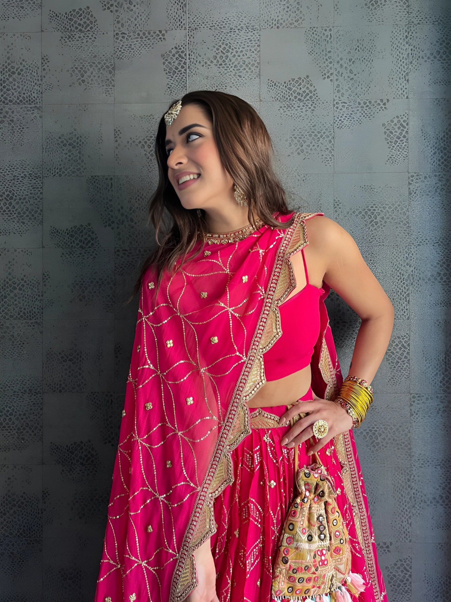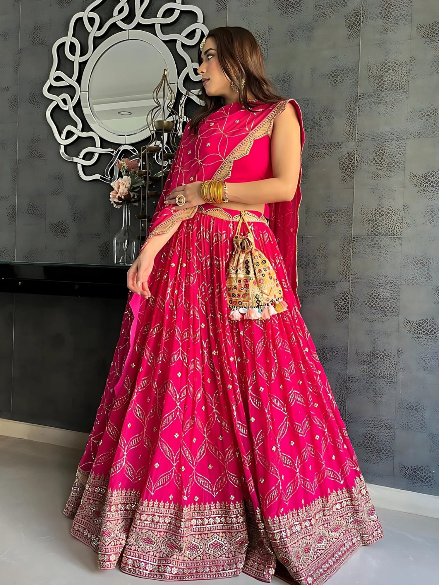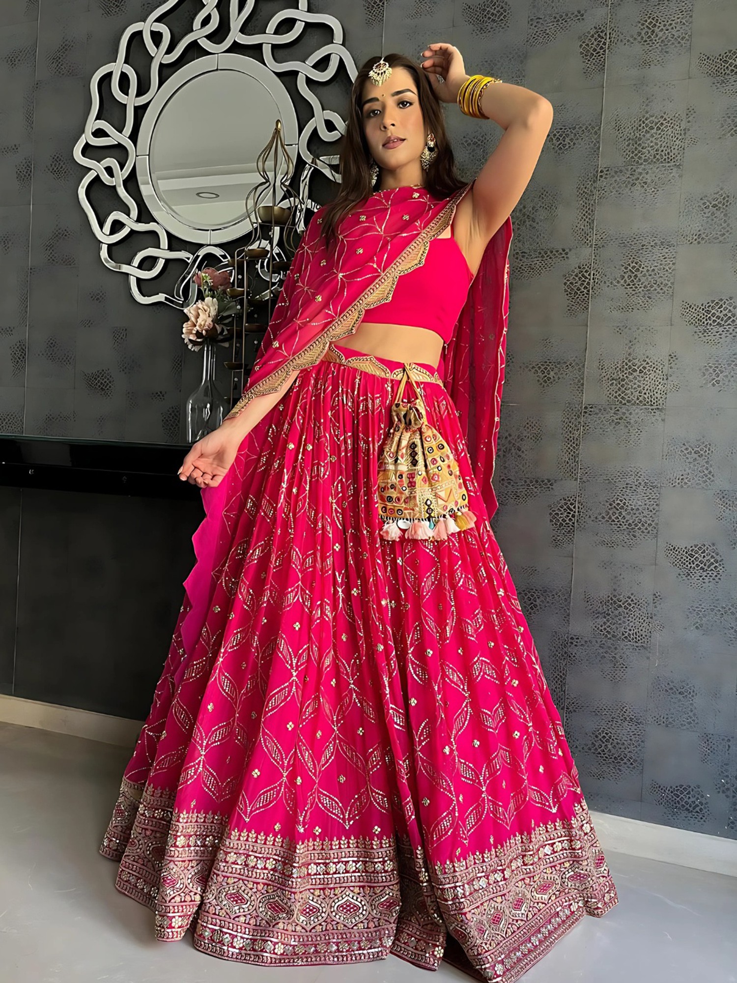 Complementing the magnificent lehenga is a chic choli, designed to flatter your silhouette. The accompanying dupatta is a vision in itself, featuring a graceful fall and coordinating sequin work that ties the entire ensemble together. The border of the lehenga is richly embellished, showcasing a dazzling band of sequins and intricate embroidery that further enhances its grandeur. A charming, decorative potli bag, adorned with colorful tassels, is included, adding a playful yet elegant touch and serving as a practical accessory.