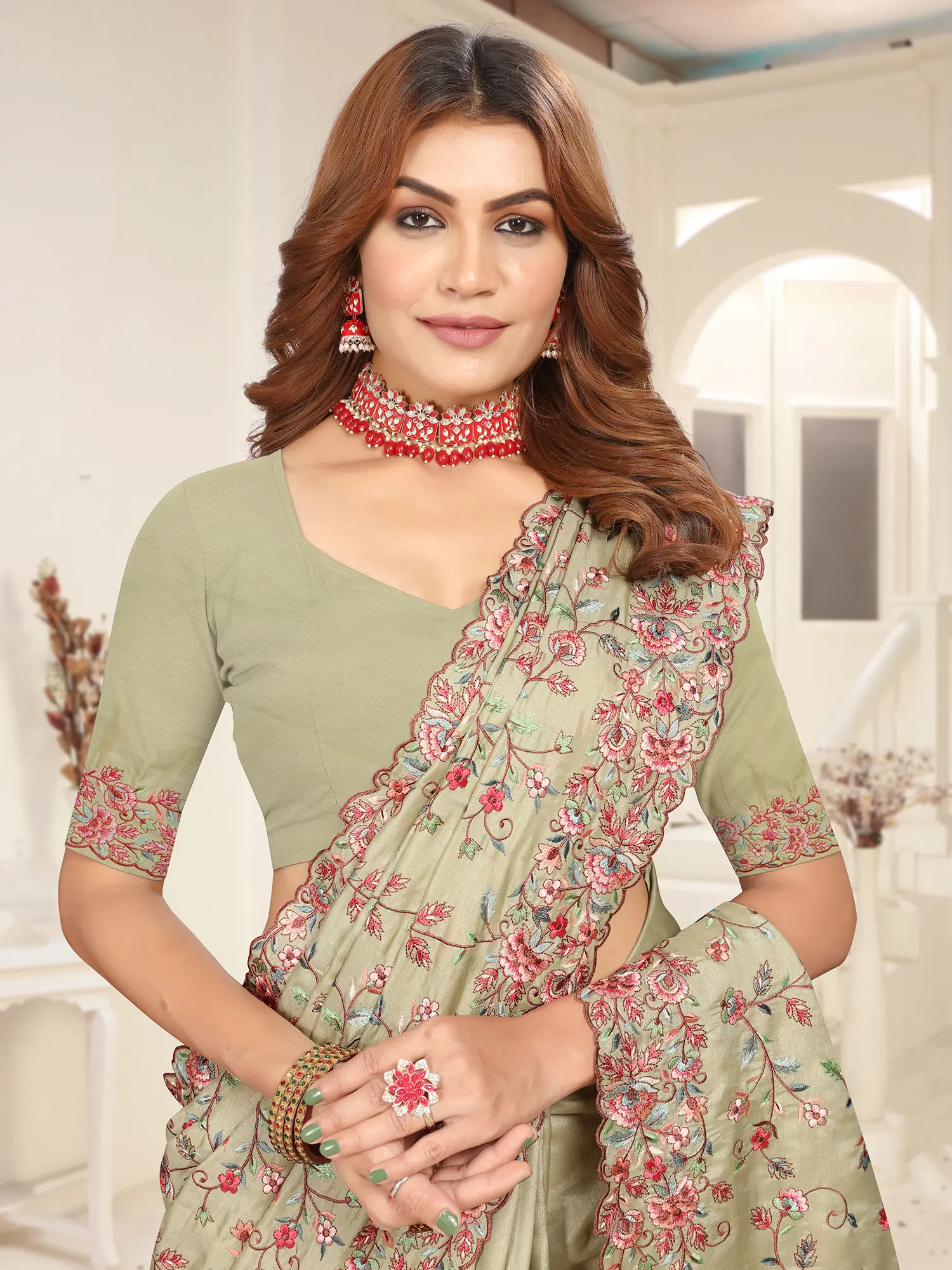 The heavy embroidery work is the undisputed star of this creation. Cascading from the pallu to the border and scattered across the body, the floral designs are a testament to the skill of the artisans. The embroidery is dense and detailed, giving the saree a substantial feel and a truly opulent appearance. It's not just an embellishment; it's a work of art that transforms the fabric into a wearable tapestry. The delicate threadwork captures the essence of blooming flowers and trailing leaves, adding depth and dimension to the visual appeal. This saree is designed to make you stand out at any event, radiating grace and style.