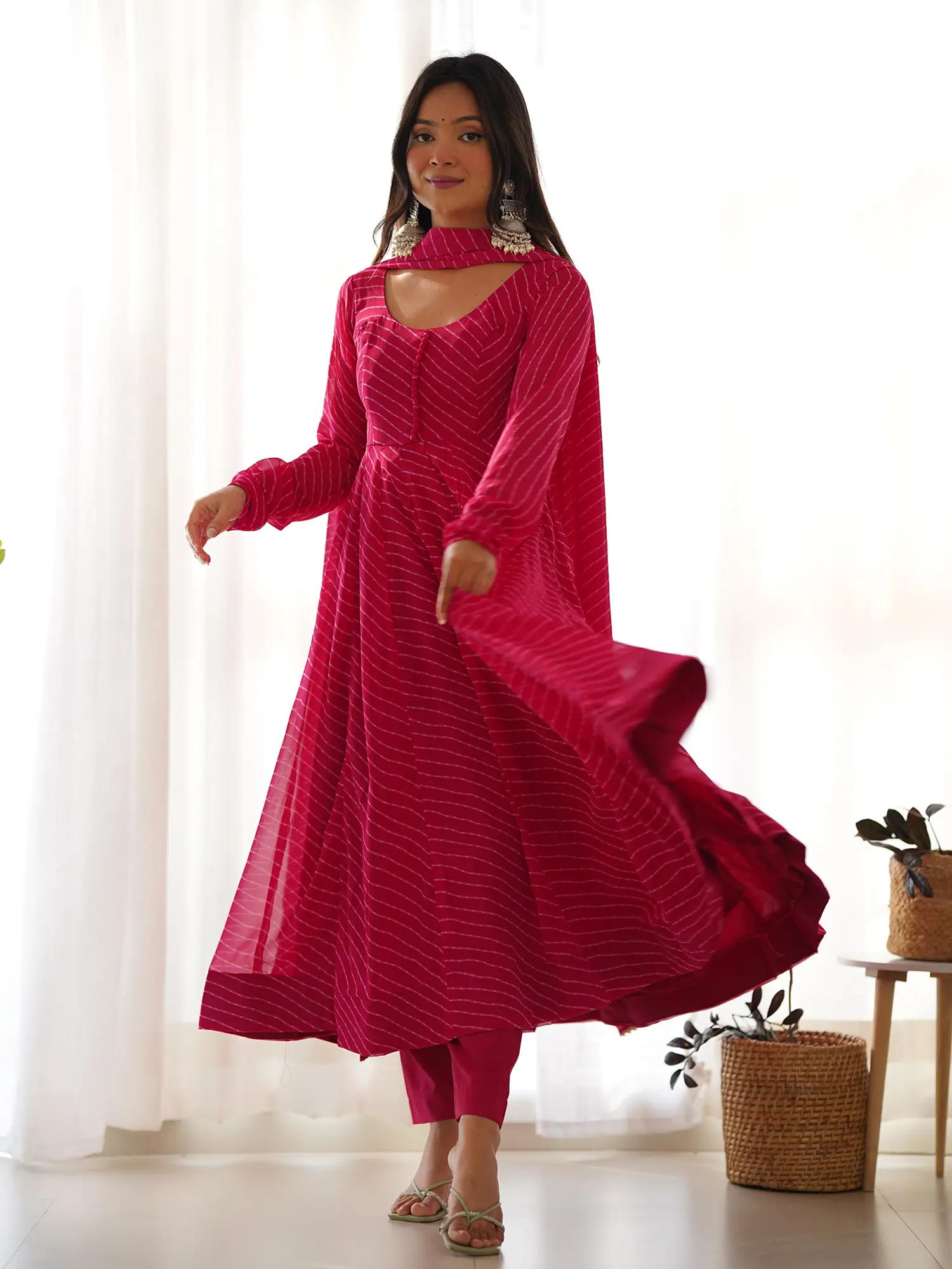 The star of this collection is the Anarkali itself, crafted from a luxurious faux georgette that drapes beautifully, creating a flattering silhouette. The flared cut accentuates the natural grace of movement, making it perfect for twirling on the dance floor or making a grand entrance at a festive gathering. The full-length sleeves add a touch of modesty and elegance, while the subtle detailing around the neckline hints at the artistry involved in its creation. The Leheriya print, a classic tie-dye technique originating from Rajasthan, is rendered here with a modern zig-zag twist, giving it a fresh and vibrant appeal. Each stripe, meticulously placed, contributes to the overall visual rhythm, ensuring all eyes are drawn to your radiant presence.