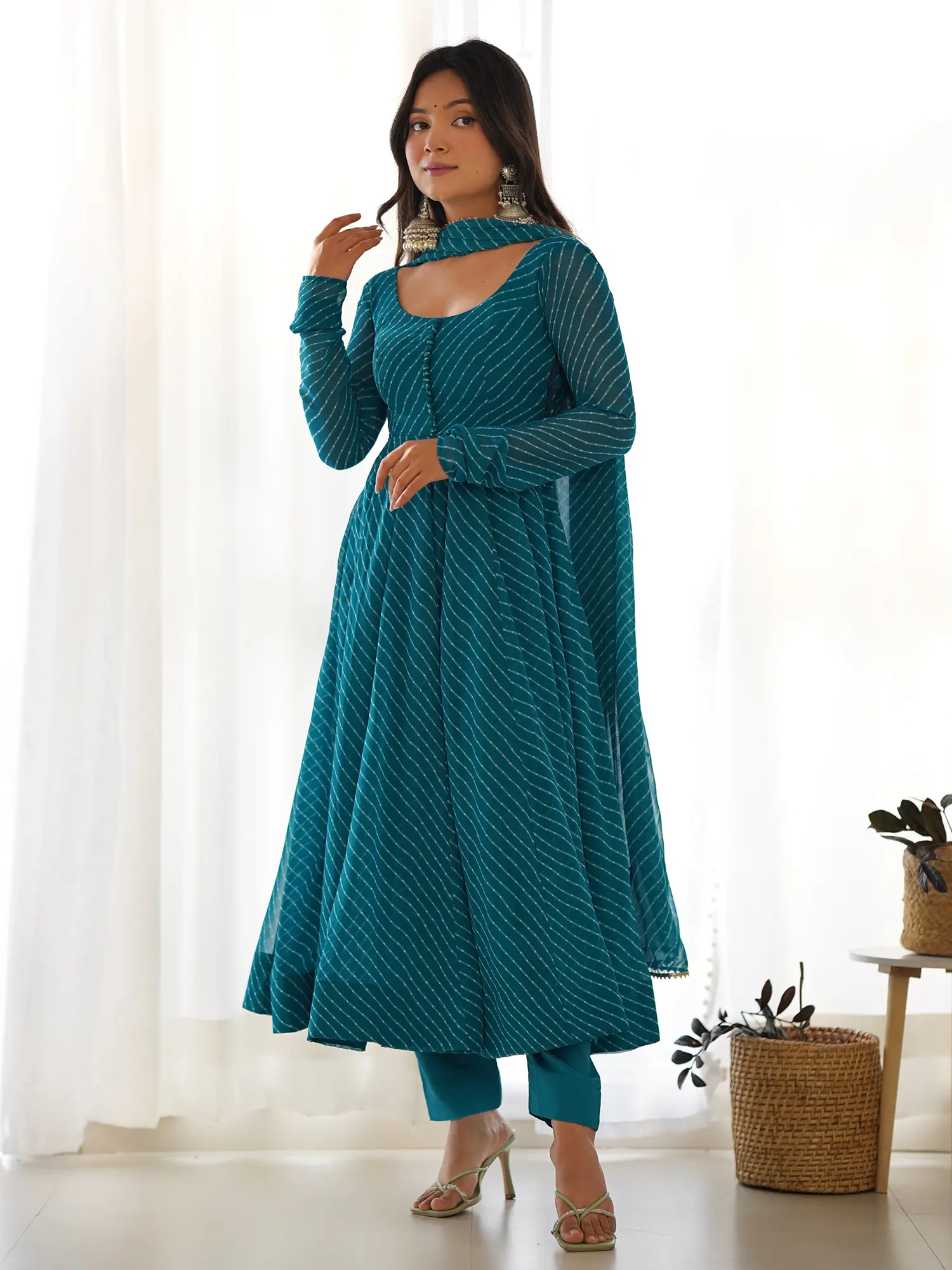Completing this captivating ensemble is a matching dupatta, also fashioned from the same delicate faux georgette. It mirrors the Anarkali's enchanting Leheriya print, creating a harmonious and cohesive look. The dupatta is generously sized, allowing for various styling options – drape it elegantly over your shoulders for a classic touch, or let it flow freely to enhance the overall drama of the outfit. The fine border detailing adds a subtle sparkle, catching the light and adding another layer of refined detail. This dupatta is not merely an accessory; it is an integral part of the story, enhancing the grandeur and elegance of the entire Anarkali suit.