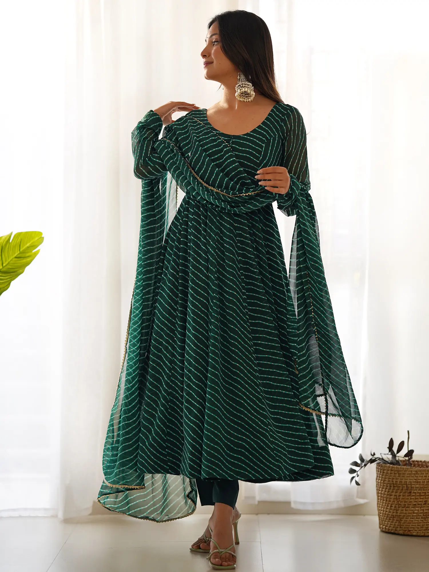 Elegance Redefined: The Forest Green Leheriya Anarkali Ensemble