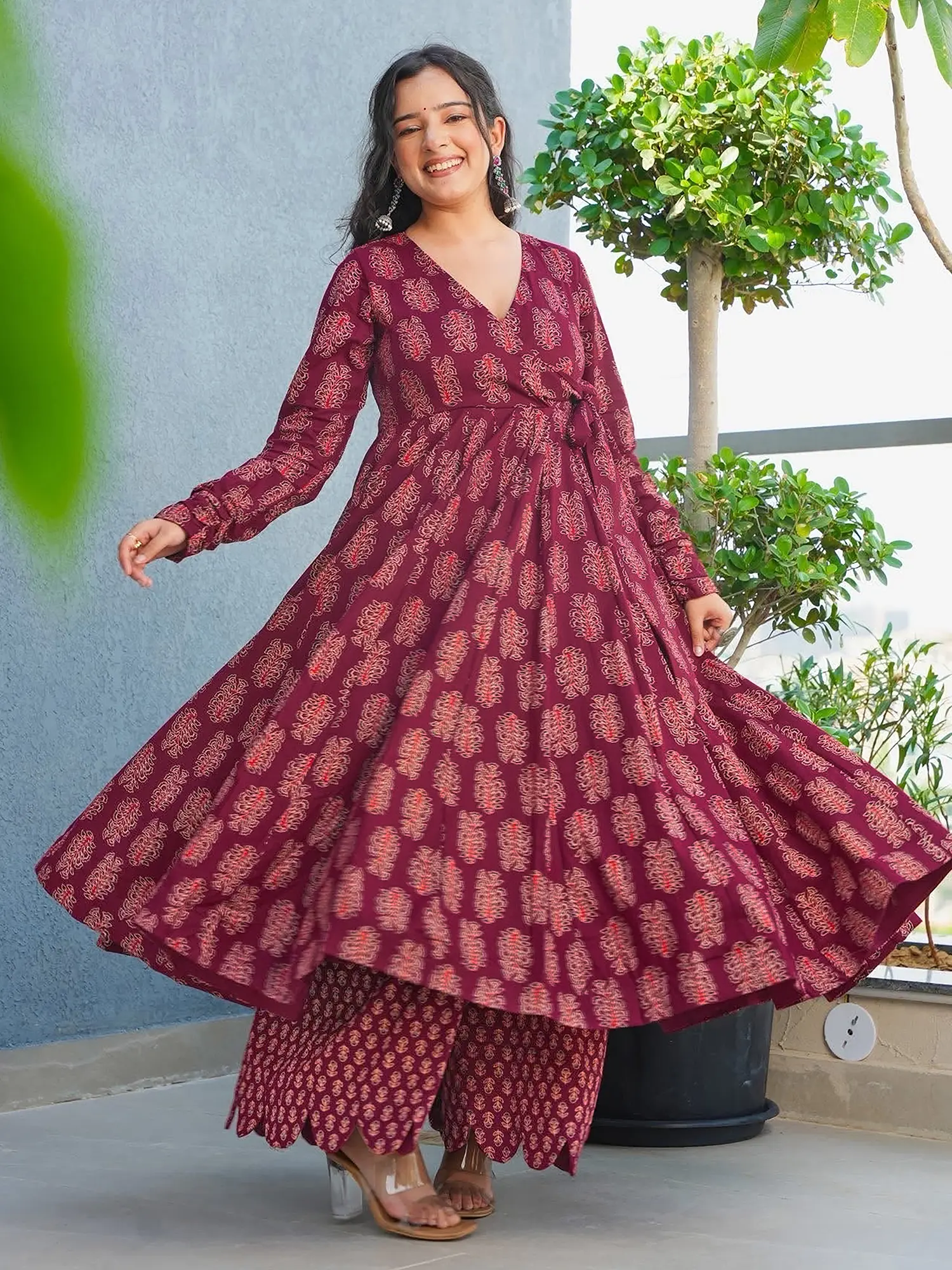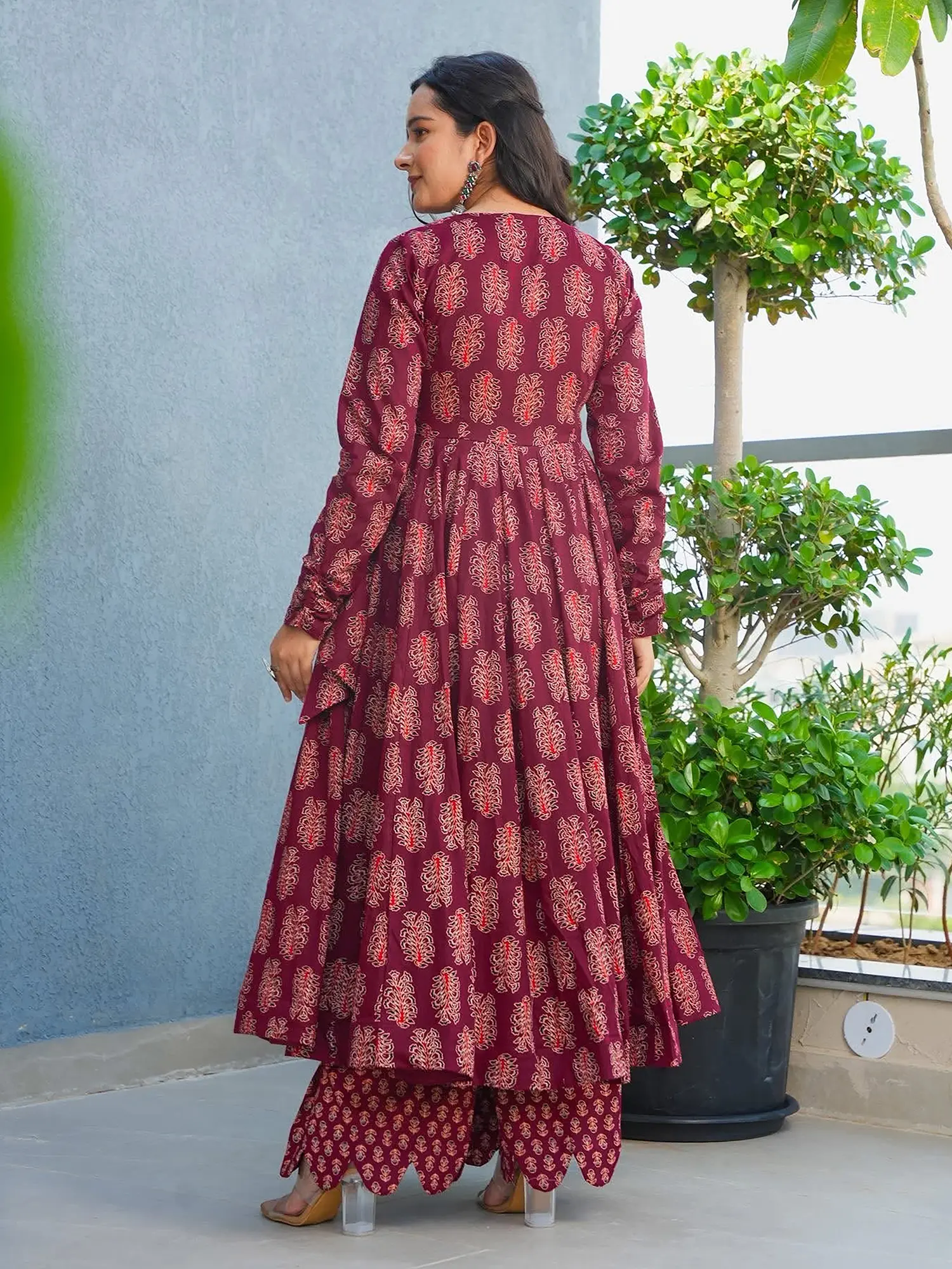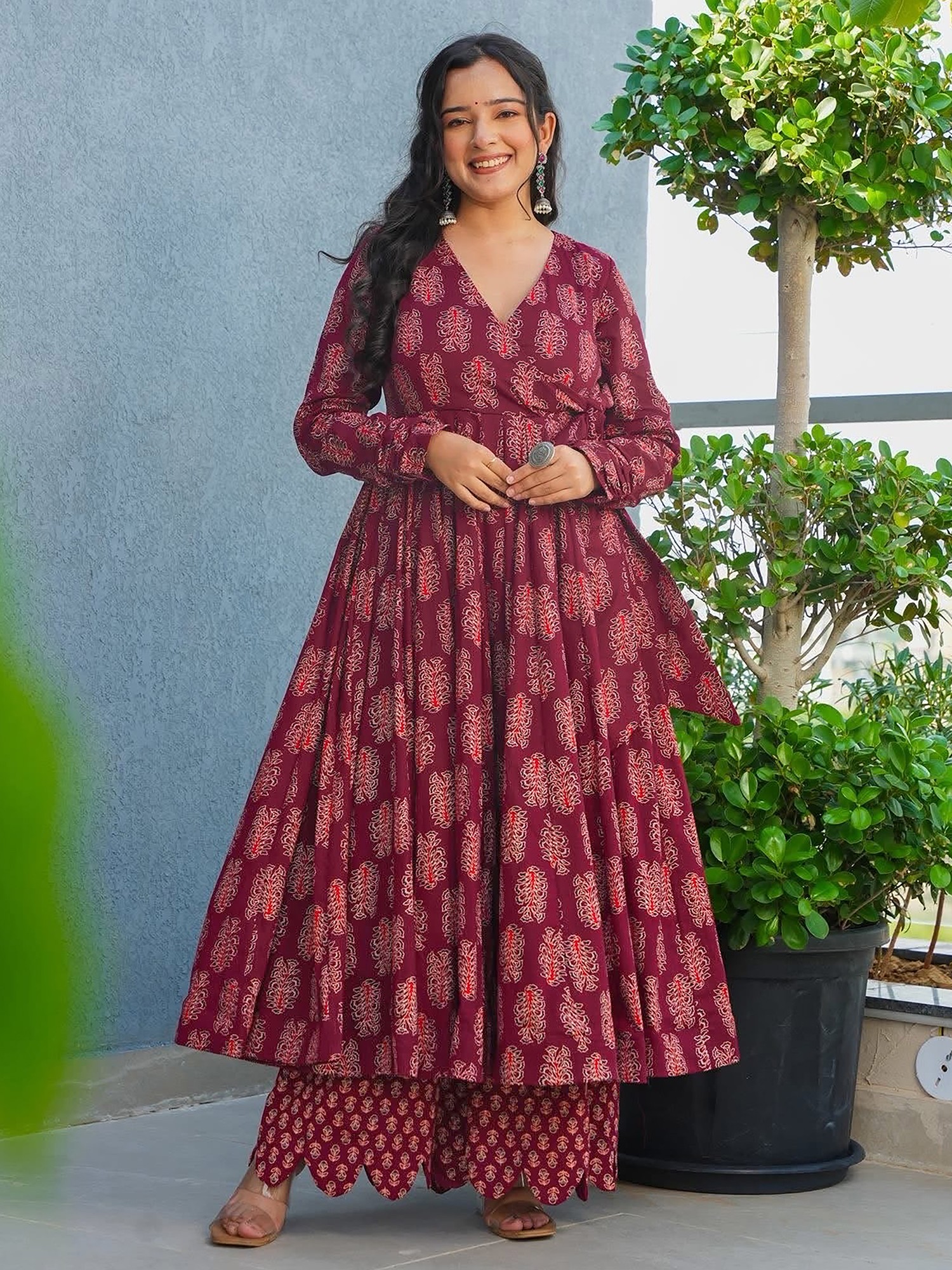 The rich, deep maroon hue serves as a captivating canvas for the intricate, all-over digital print. This design, rendered in contrasting shades of red and cream, evokes a sense of heritage while remaining strikingly contemporary. The flowing Anarkali cut, a style renowned for its flattering empire waist and voluminous flare, creates a regal and feminine profile. Complementing this, the matching bottom set features a delicate, scalloped hem, adding a subtle yet impactful flourish that ties the entire look together.
