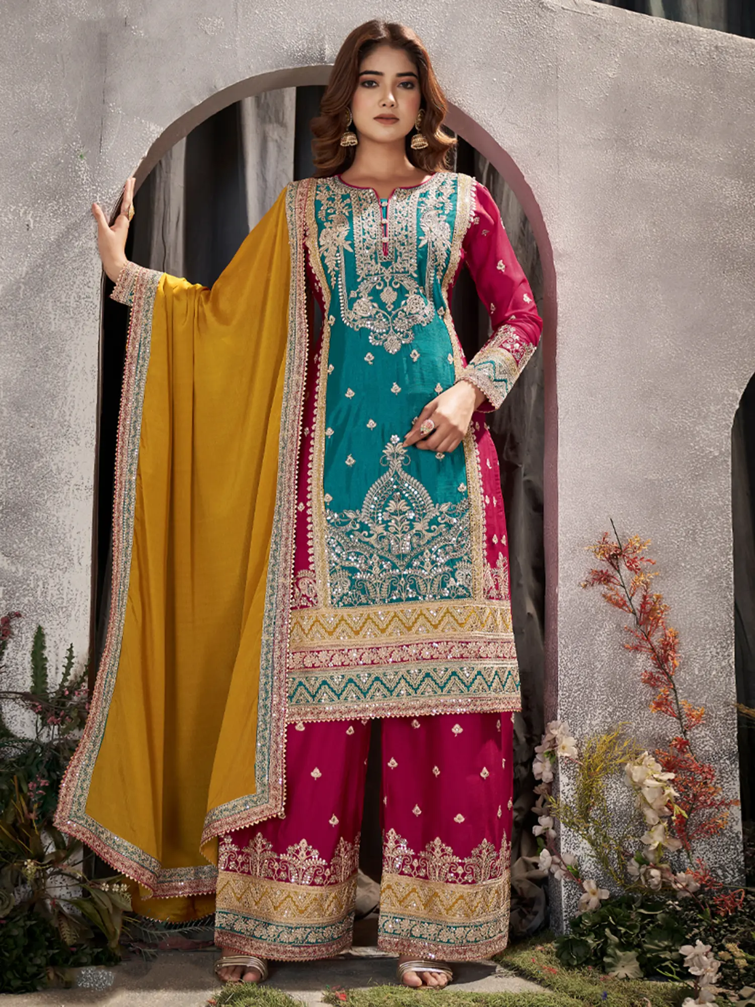 Designer Heavy Thread Embroidery And Sequins Work Chinon Palazzo Suit With Dupatta