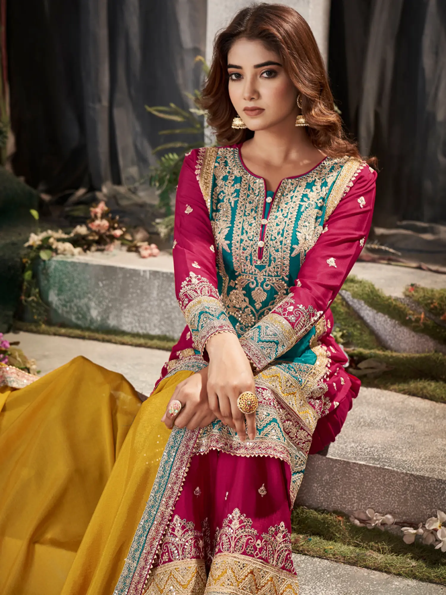 Chinon Palazzo Suit With Multi Thread Sequin Embroidery Work For Festive Wedding And Party Wear For Women And Girls
