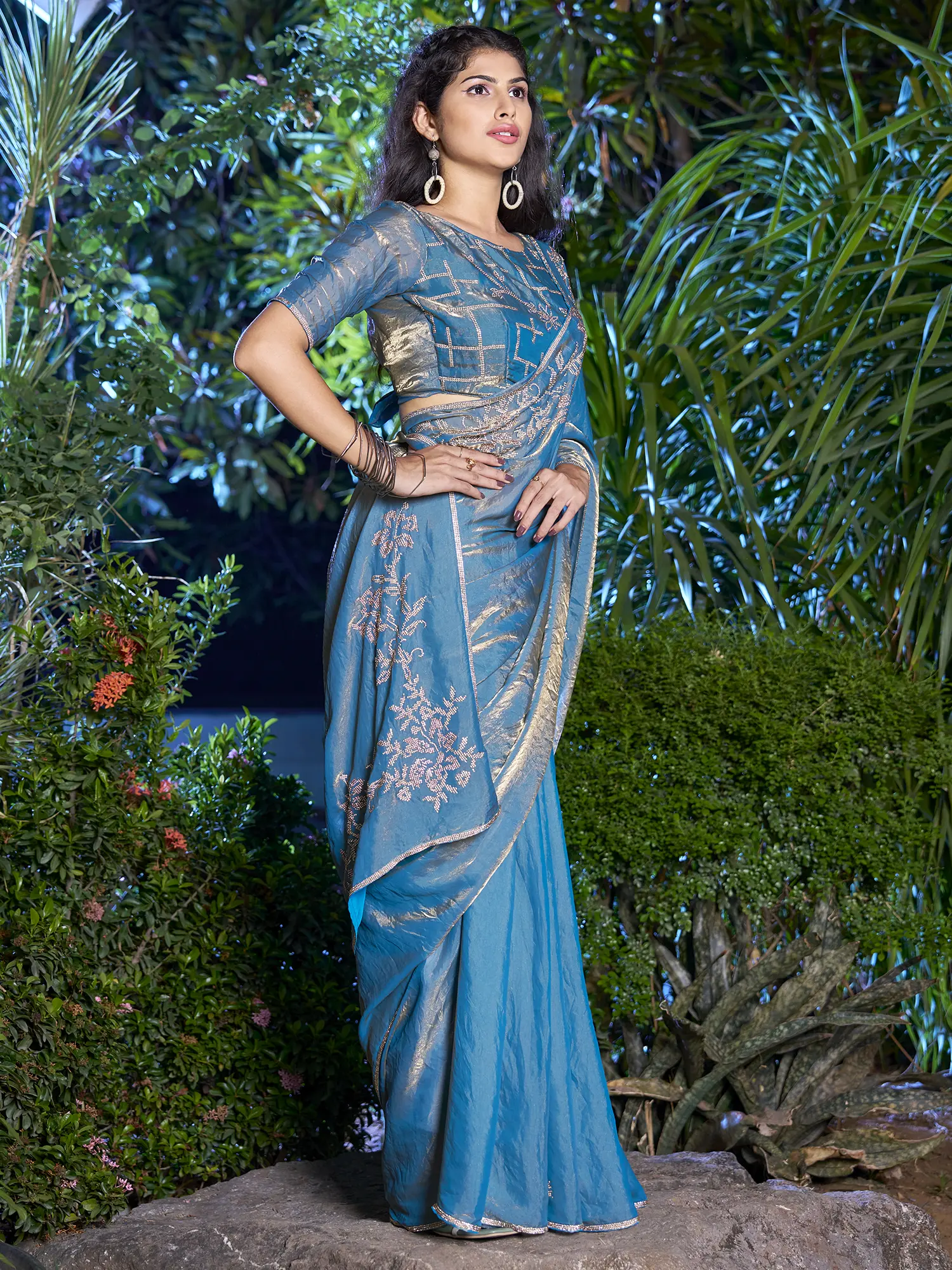 Baltic Blue and Red Designer Sari with All-Over Embroidered Sequins and Patch Border