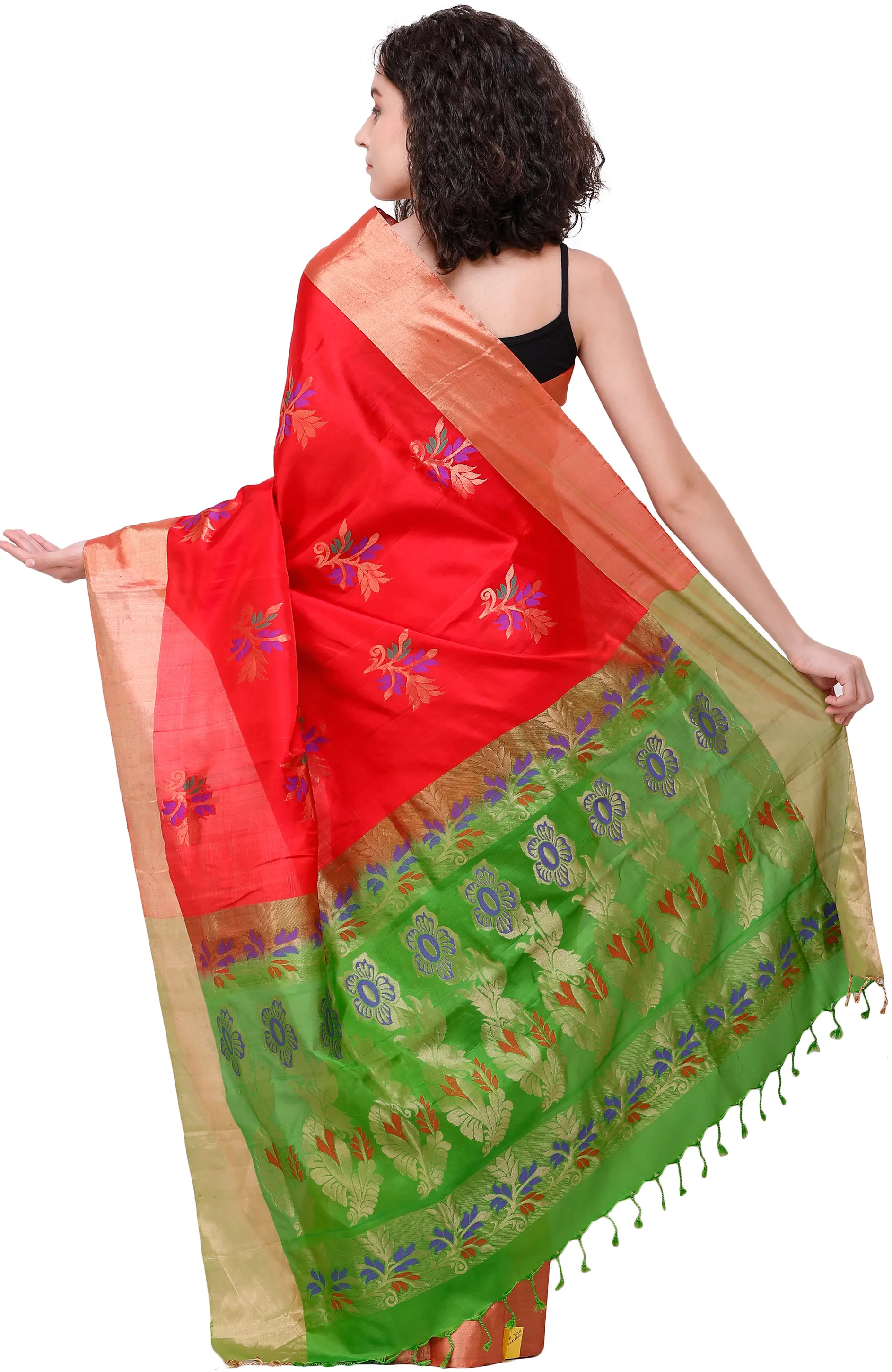 Adding a delightful visual contrast, the pallu of this sari bursts with a fresh, vibrant green. This section is adorned with more elaborate Zari woven patterns, featuring flowing paisley motifs interspersed with floral elements. This bold yet balanced use of color and design ensures that the sari is as captivating from the back as it is from the front. The subtle green tassels at the hem of the pallu add a final touch of playful elegance, completing the sari's enchanting aesthetic.
