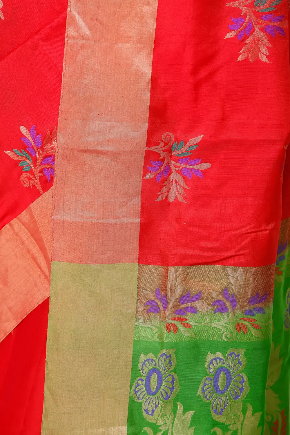 The true magic of this sari lies in its meticulously woven Zari work. Delicate floral motifs, rendered in a captivating blend of purple, blue, and hints of orange and green, are artfully scattered across the lustrous red expanse. These intricately detailed blooms seem to dance on the silk, adding depth and dimension to the design. The Zari threads, known for their shimmering metallic quality, elevate the sari from elegant to truly resplendent, lending a subtle sparkle that is both sophisticated and eye-catching. The border of the sari features a contrasting yet harmonious broad band of gold, further enhancing its opulent feel. ––––––––––
