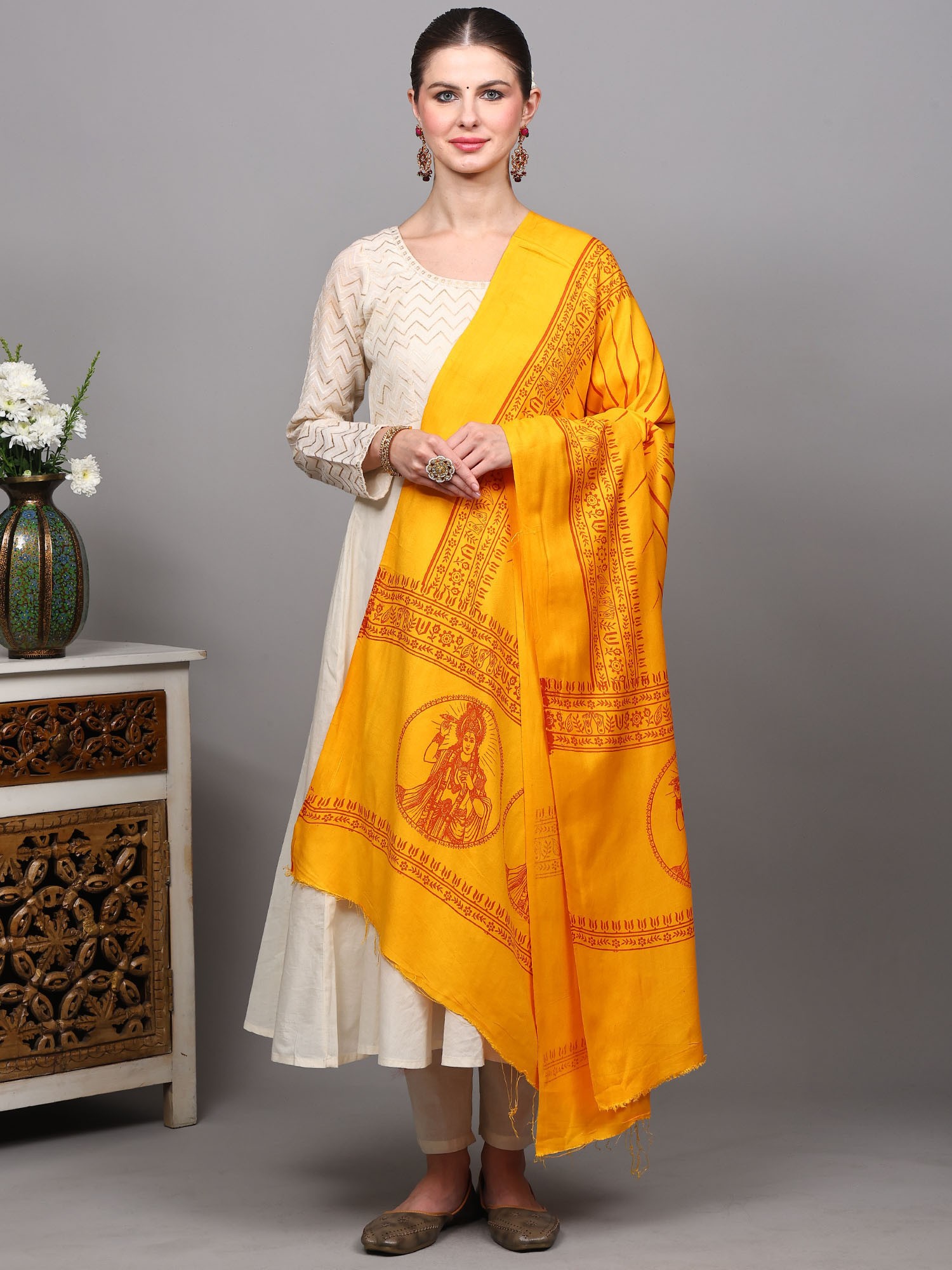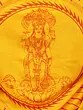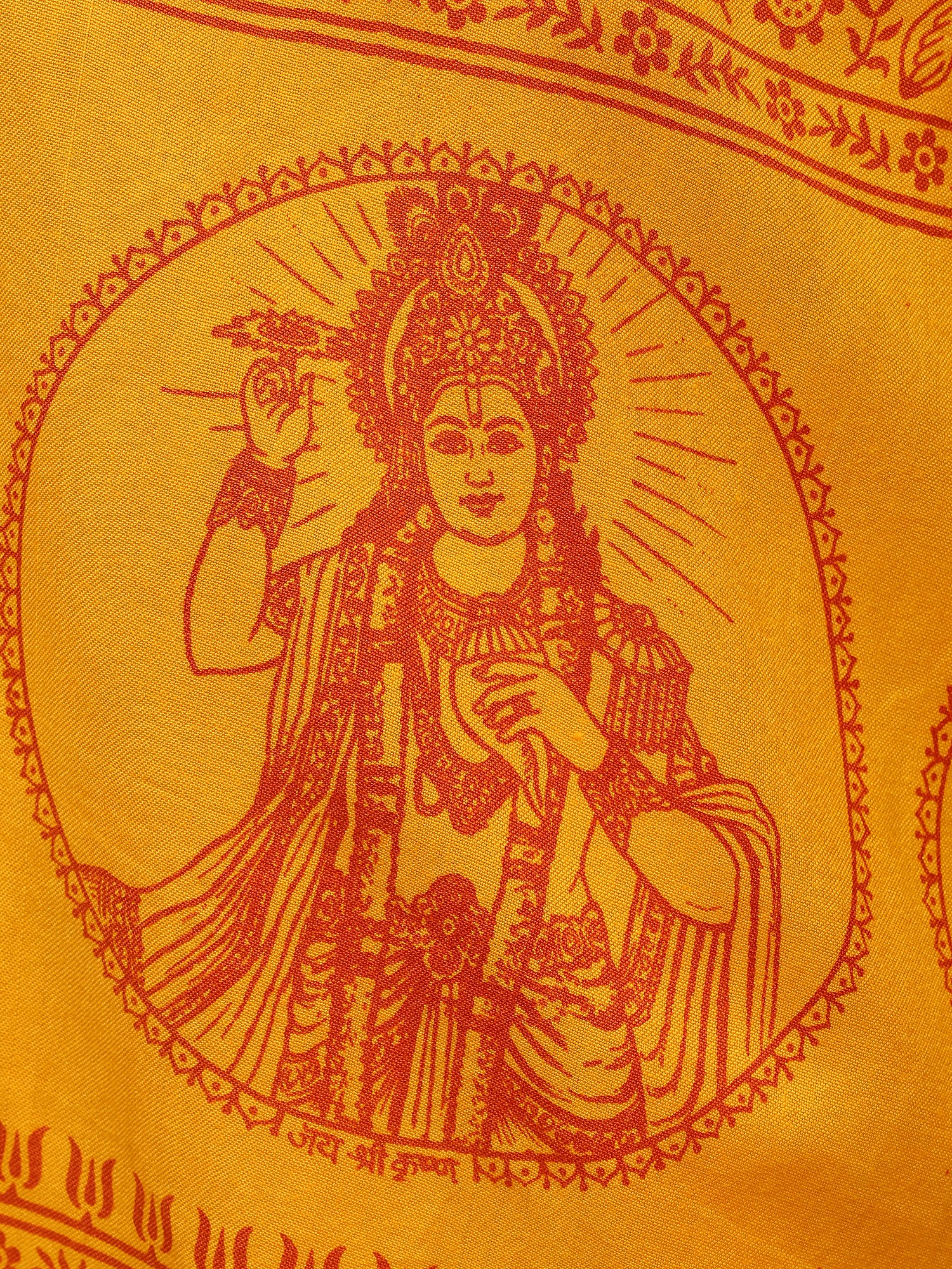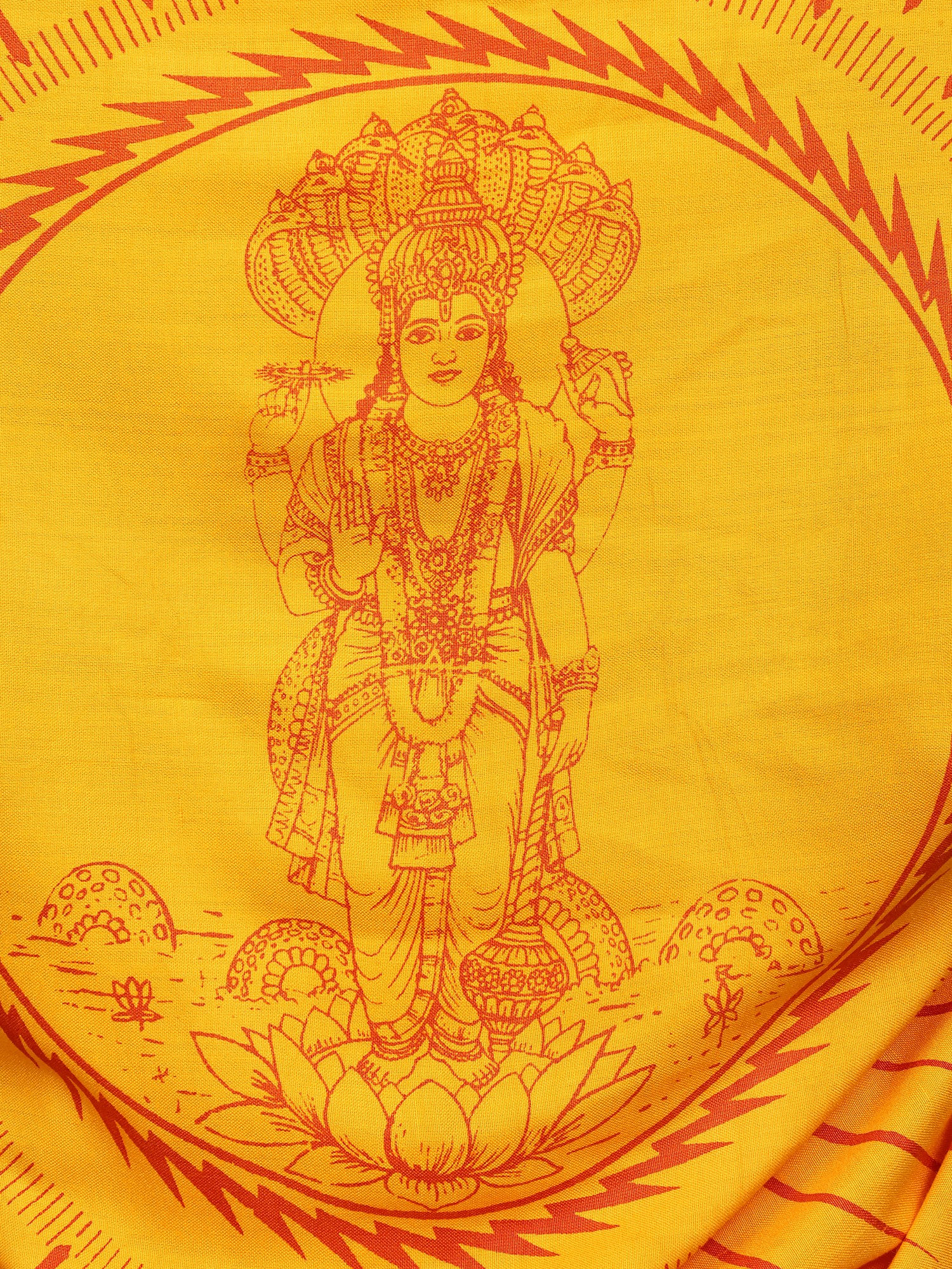 The colour is a delicate, peachy taupe. The base is solid-coloured, the same having been superimposed with crimson-coloured print. Circular panels depicting the upper half of the divine form of Lord Vishnu; a mere outline of His iconographical form, yet replete with ample detail such as the density of shringar and the rays of the luminescent halo. Crisp lines of alternating lengths cover the rest of the field of this prayer shawl. The multiple panels along the border comprise Vaishnavite symbols in succession as well as foliage patterns and the Shaivite trishool (trident).