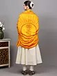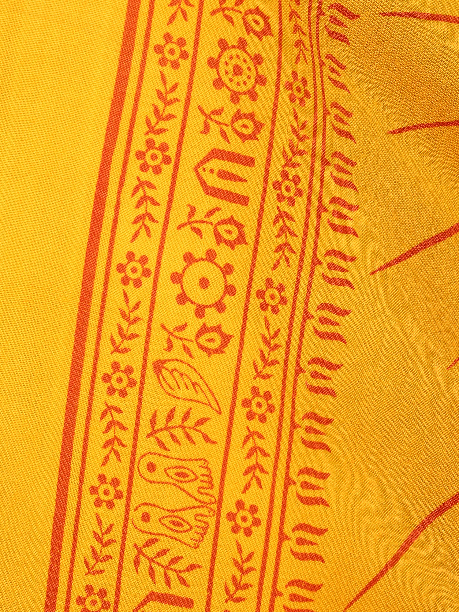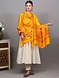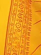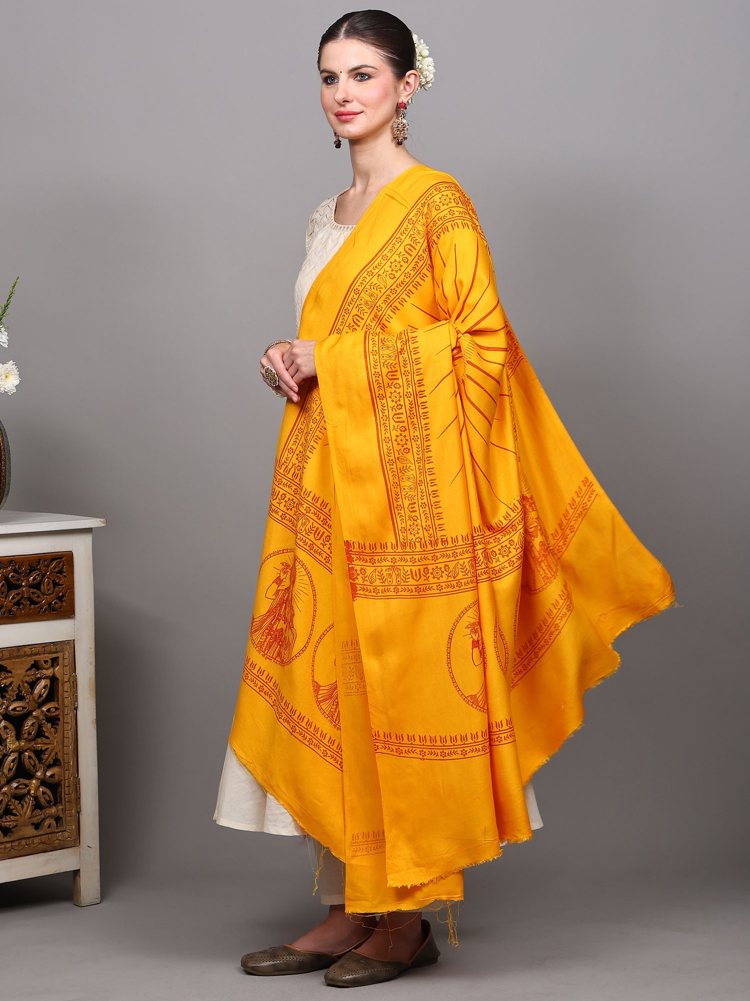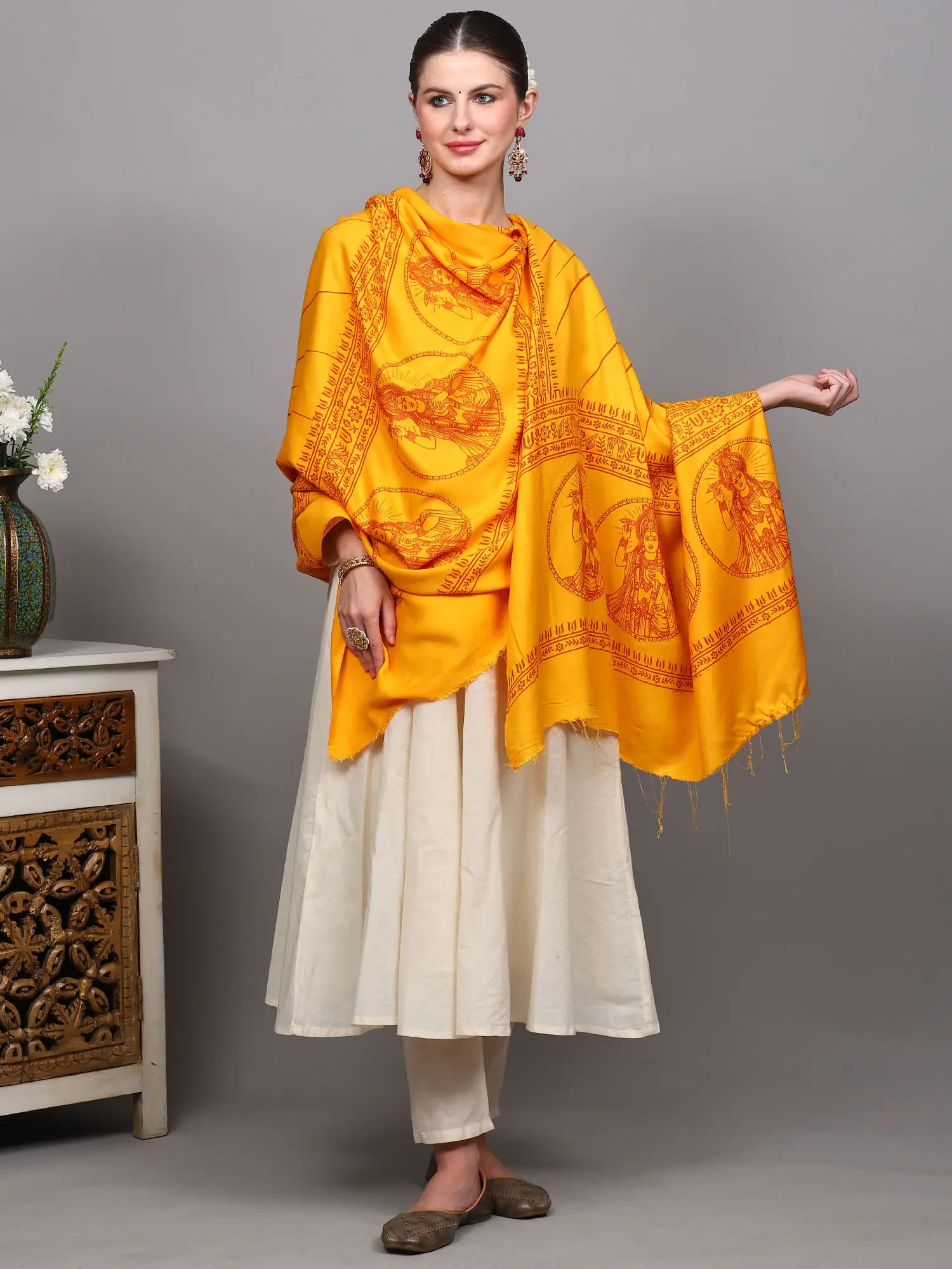 The colour is a delicate, peachy taupe. The base is solid-coloured, the same having been superimposed with crimson-coloured print. Circular panels depicting the upper half of the divine form of Lord Vishnu; a mere outline of His iconographical form, yet replete with ample detail such as the density of shringar and the rays of the luminescent halo. Crisp lines of alternating lengths cover the rest of the field of this prayer shawl. The multiple panels along the border comprise Vaishnavite symbols in succession as well as foliage patterns and the Shaivite trishool (trident).