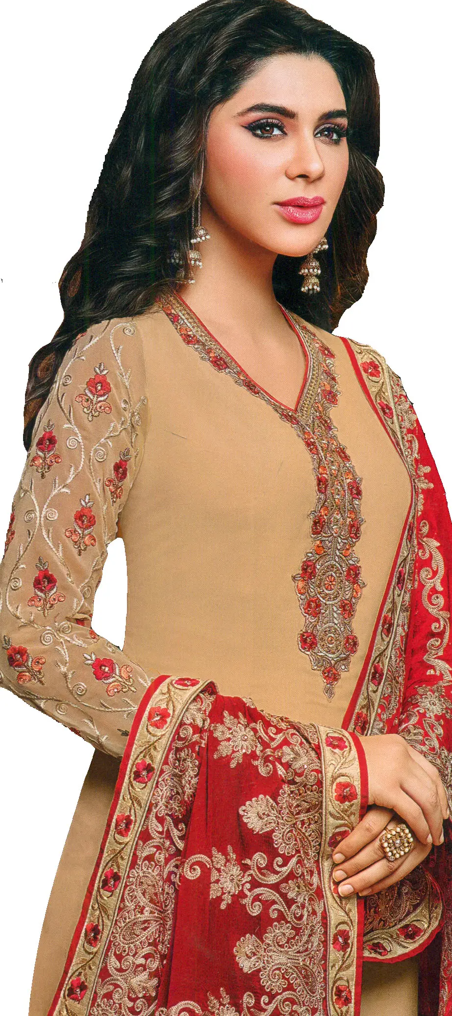 New-Wheat and Red Designer Anarkali Suit with Floral-Embroidery and Crystals