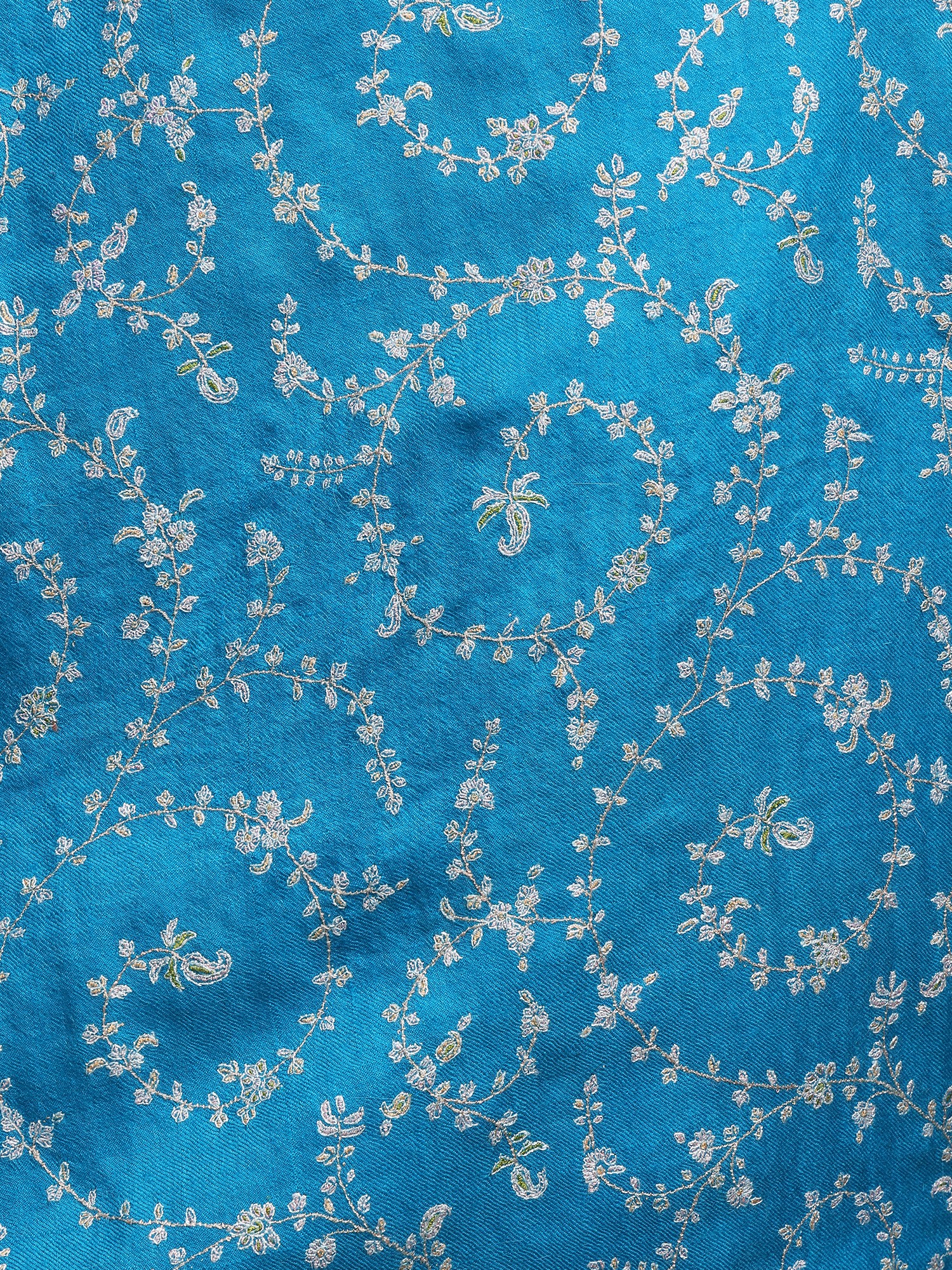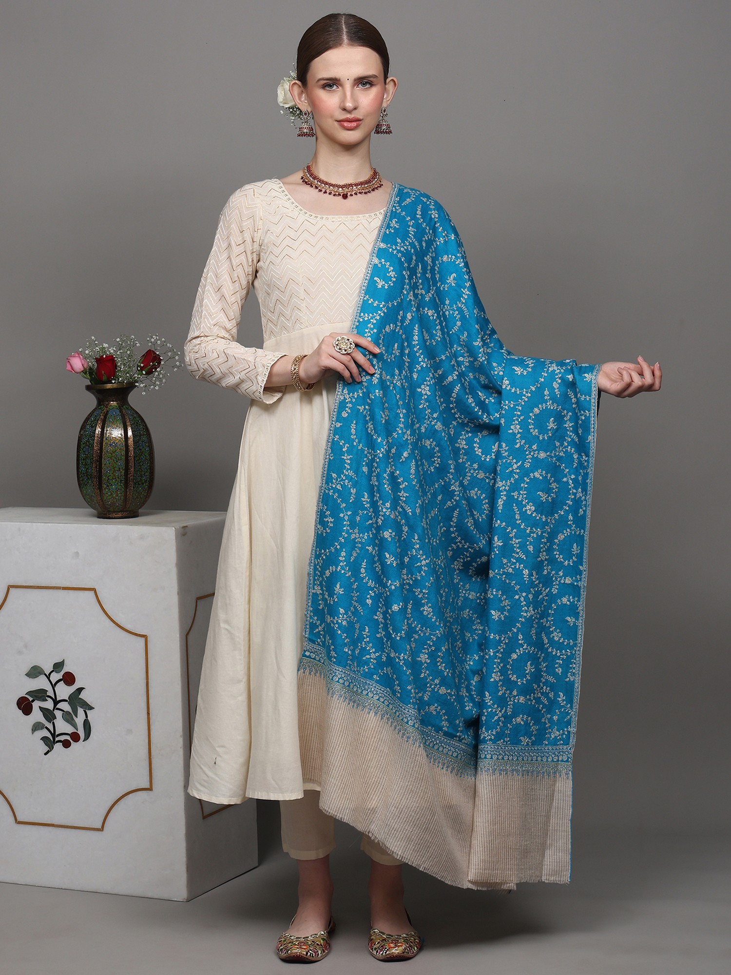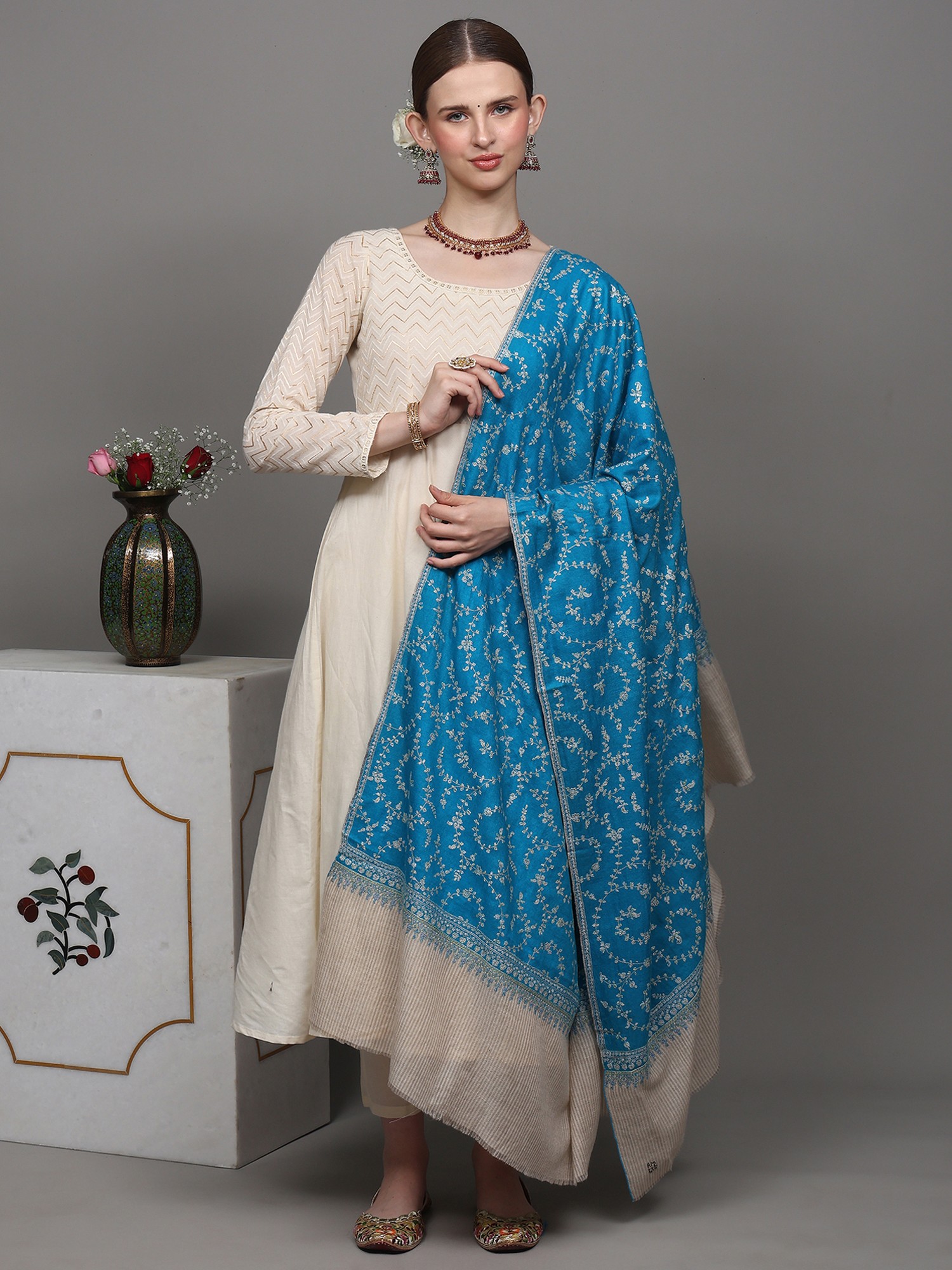 Kashmir, the heaven on earth, has produced many exquisite art forms. The origin of Pashmina is also attributed to this beautiful place. This Pashmina Algiers Blue Shawl is a testament to Kashmir's beauty, heritage, and artistry. Meticulously crafted from the finest Cashmere fabric, it features an exquisite full-body 'bael buta' Sozni work executed by the finest hands in this field. The shawl embodies the warmth of the blue skies that grace the region, paying tribute to the unadulterated beauty of Kashmir. With its rich history and breathtaking craftsmanship, this shawl encapsulates the essence of a timeless tradition and the allure of the mesmerizing Kashmiri landscape. Wrap yourself in its elegance and experience the artistry and warmth it brings to your every moment.