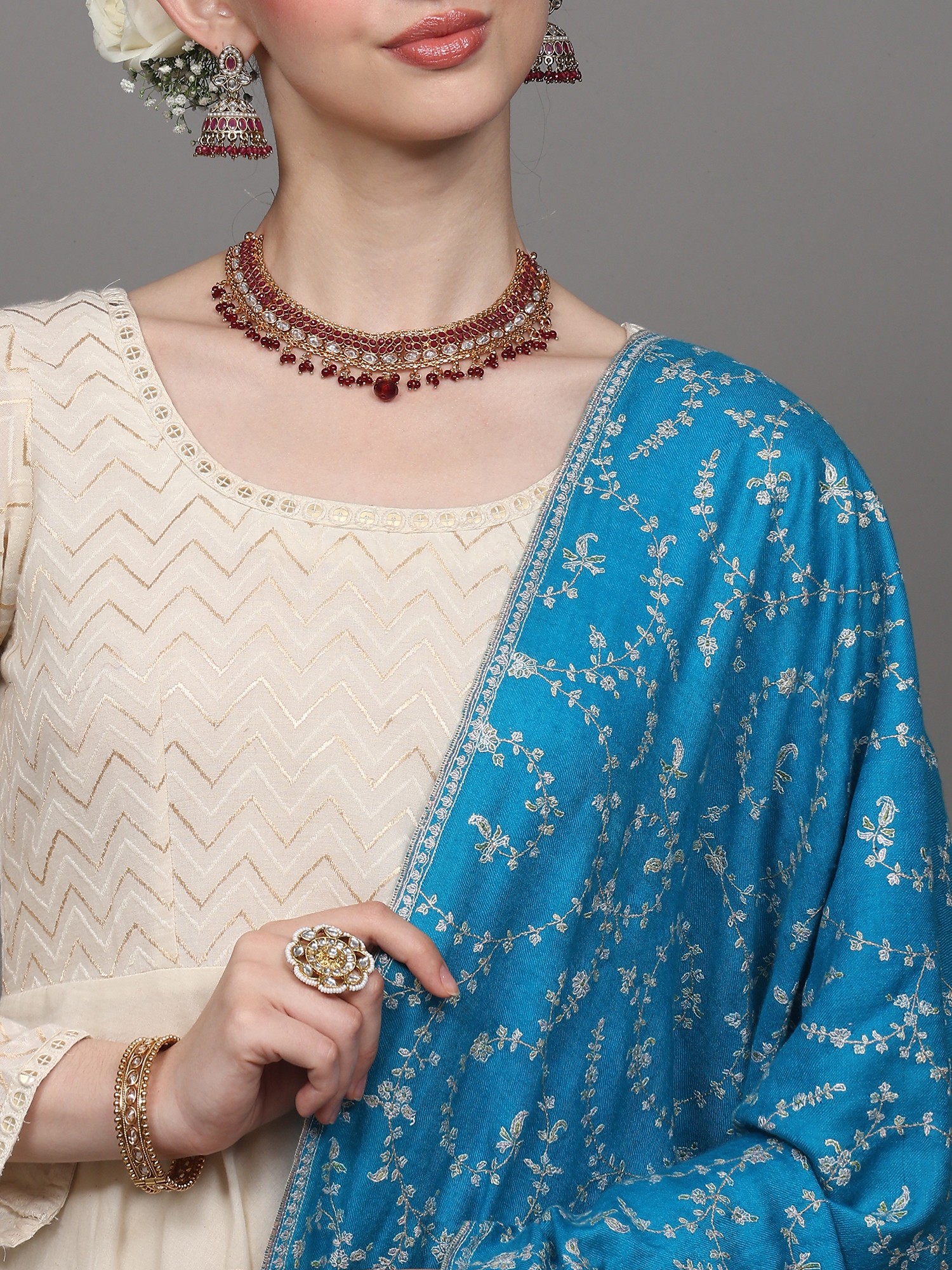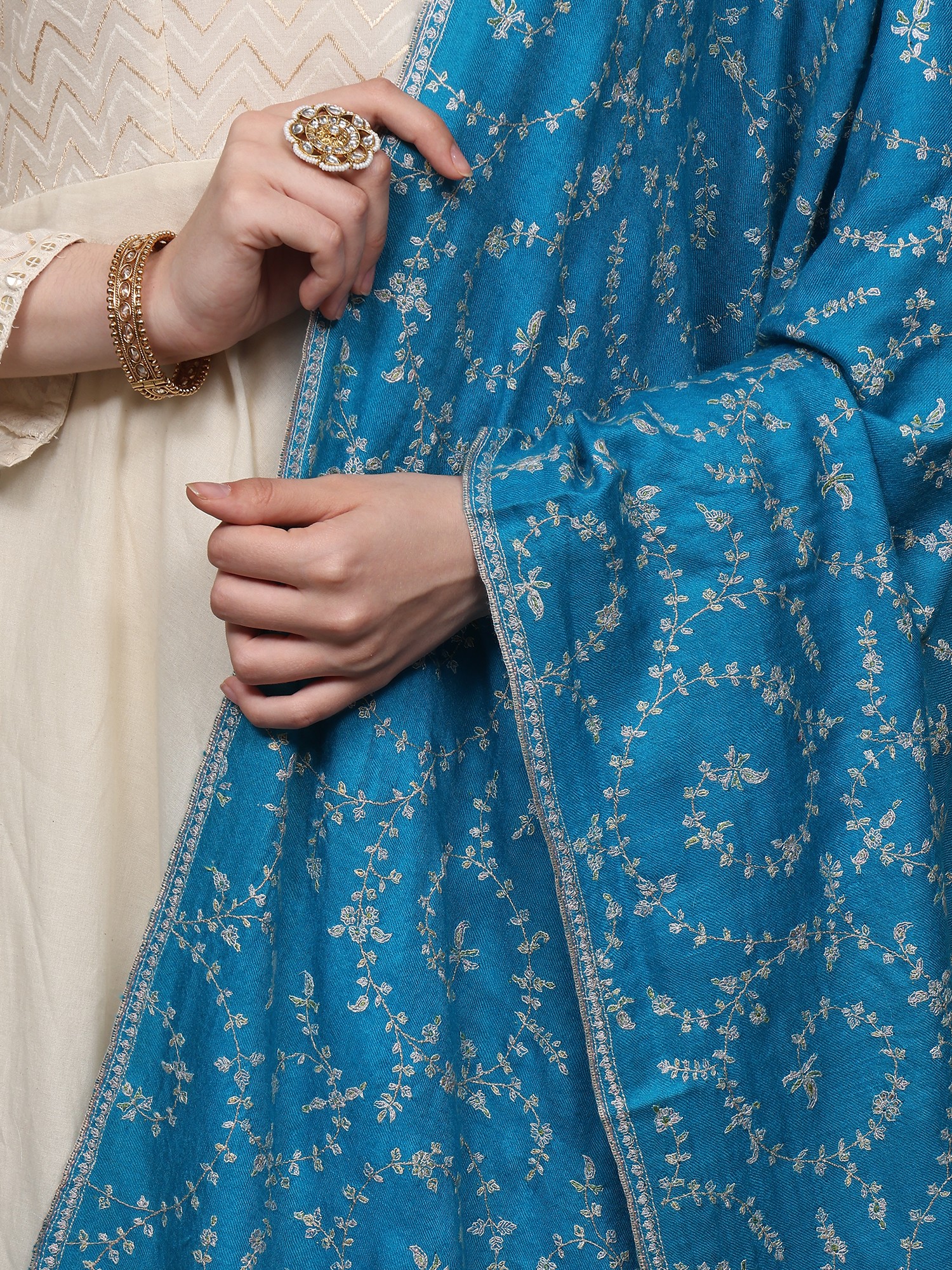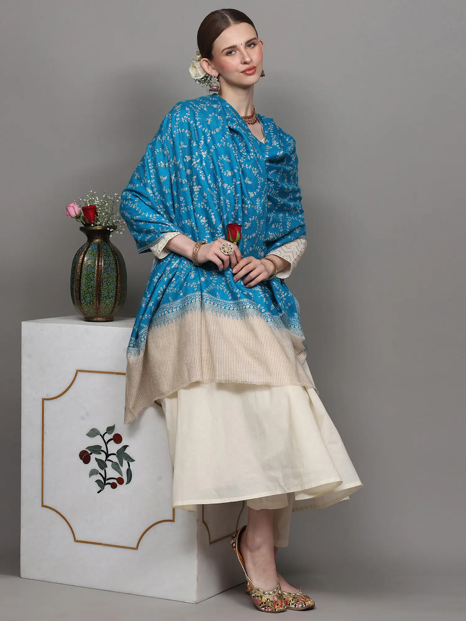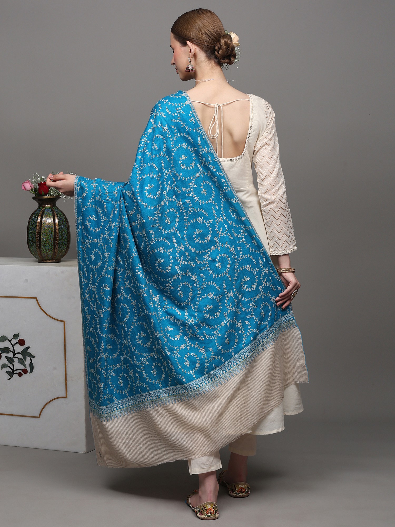 Kashmir, the heaven on earth, has produced many exquisite art forms. The origin of Pashmina is also attributed to this beautiful place. This Pashmina Algiers Blue Shawl is a testament to Kashmir's beauty, heritage, and artistry. Meticulously crafted from the finest Cashmere fabric, it features an exquisite full-body 'bael buta' Sozni work executed by the finest hands in this field. The shawl embodies the warmth of the blue skies that grace the region, paying tribute to the unadulterated beauty of Kashmir. With its rich history and breathtaking craftsmanship, this shawl encapsulates the essence of a timeless tradition and the allure of the mesmerizing Kashmiri landscape. Wrap yourself in its elegance and experience the artistry and warmth it brings to your every moment.