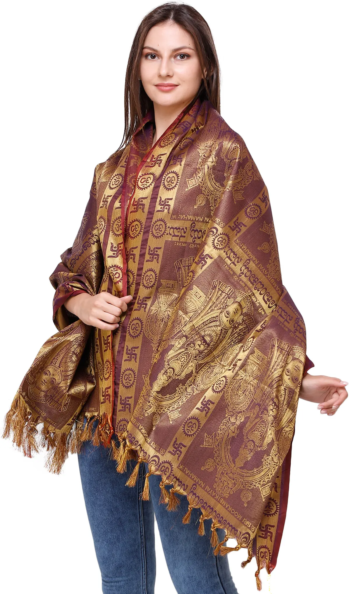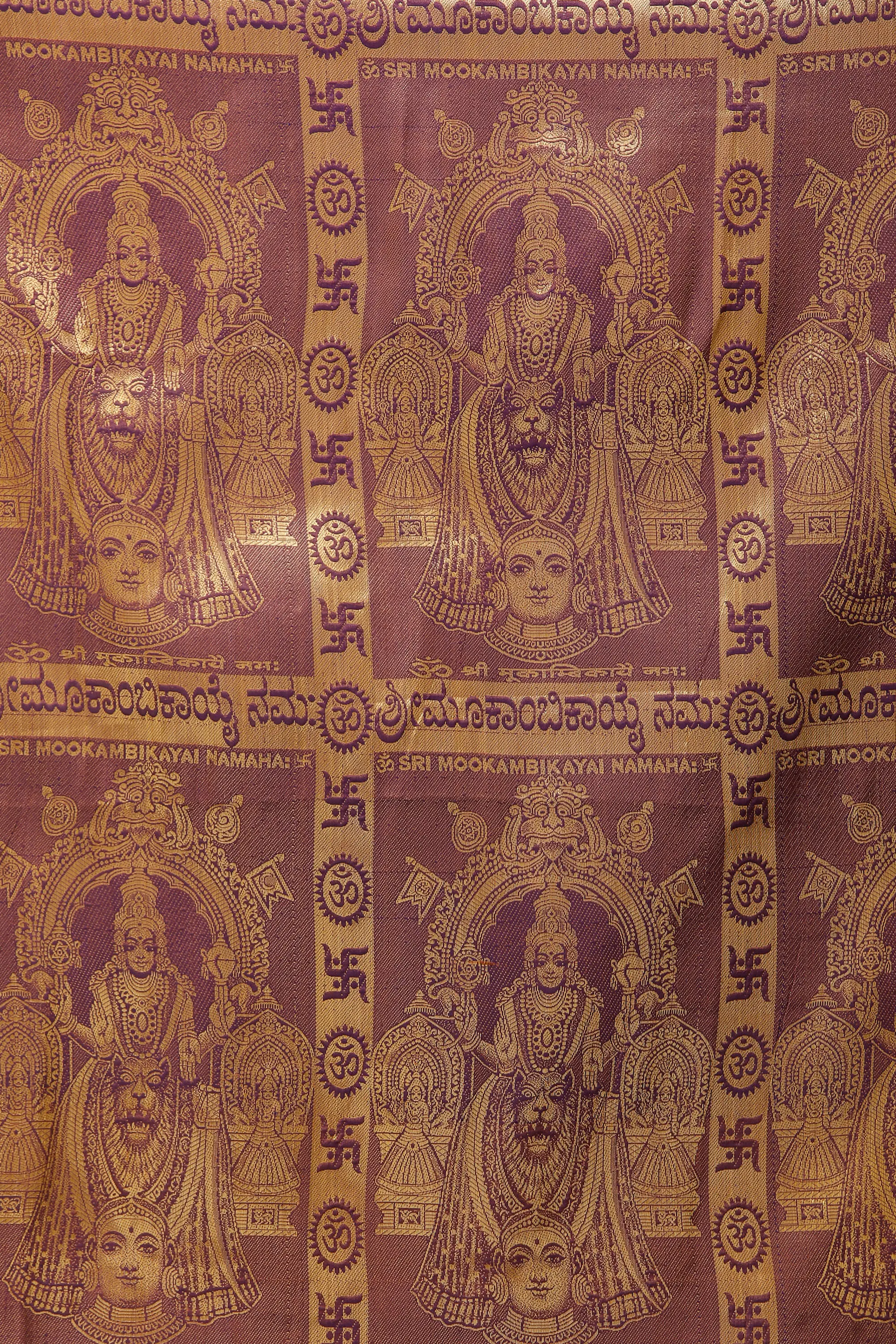 Immerse yourself in the spiritual elegance of this exquisite brocaded prayer shawl, a testament to the rich cultural heritage of Tamil Nadu. Crafted from lustrous art silk, this shawl is more than just an accessory; it's a wearable piece of devotion, designed to enhance your sacred rituals and add a touch of divine grace to your attire. The deep, regal hues of purple and gold intertwine to create a captivating visual tapestry, reflecting centuries of artisanal skill and spiritual significance. The intricate brocade work showcases a series of auspicious symbols and sacred imagery. Prominently featured are the Om symbol, a primordial sound and the representation of the ultimate reality in Hinduism, and the Swastika, an ancient symbol of well-being and good fortune. Interspersed are depictions of Goddess Mookambika, the powerful deity known for her strength, protection, and ability to bestow blessings. Each motif is woven with meticulous detail, creating a rich, textured surface that gleams under light, drawing the eye and inviting contemplation. The vibrant gold threads stand out against the deep purple, lending an air of opulence and sacredness to the entire piece.