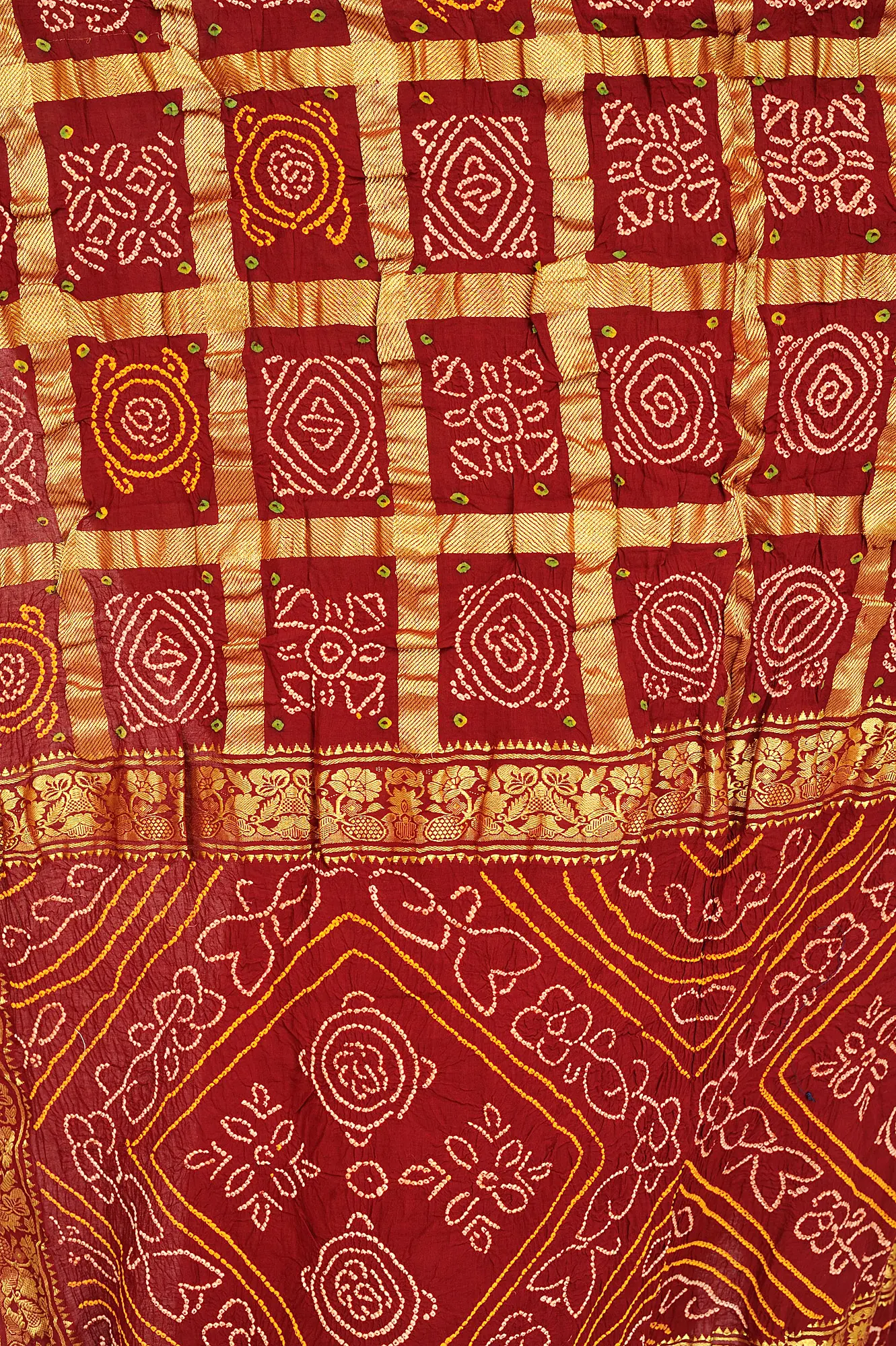Green and Red Bandhani Tie-Dye Gharchola Dupatta from Gujarat with Zari Weave