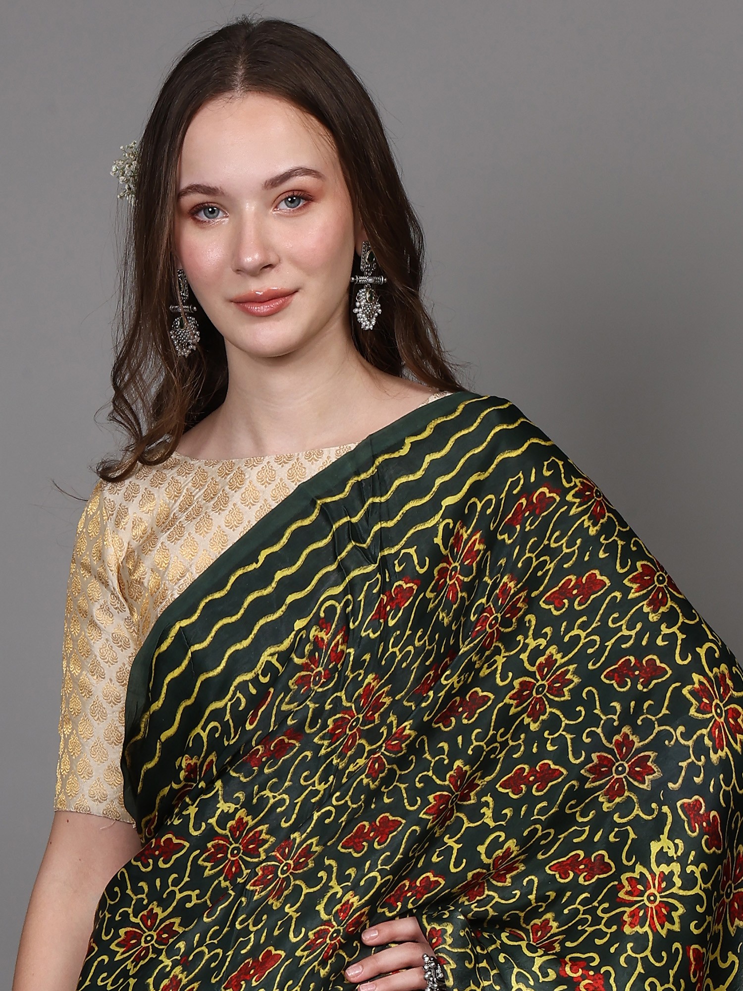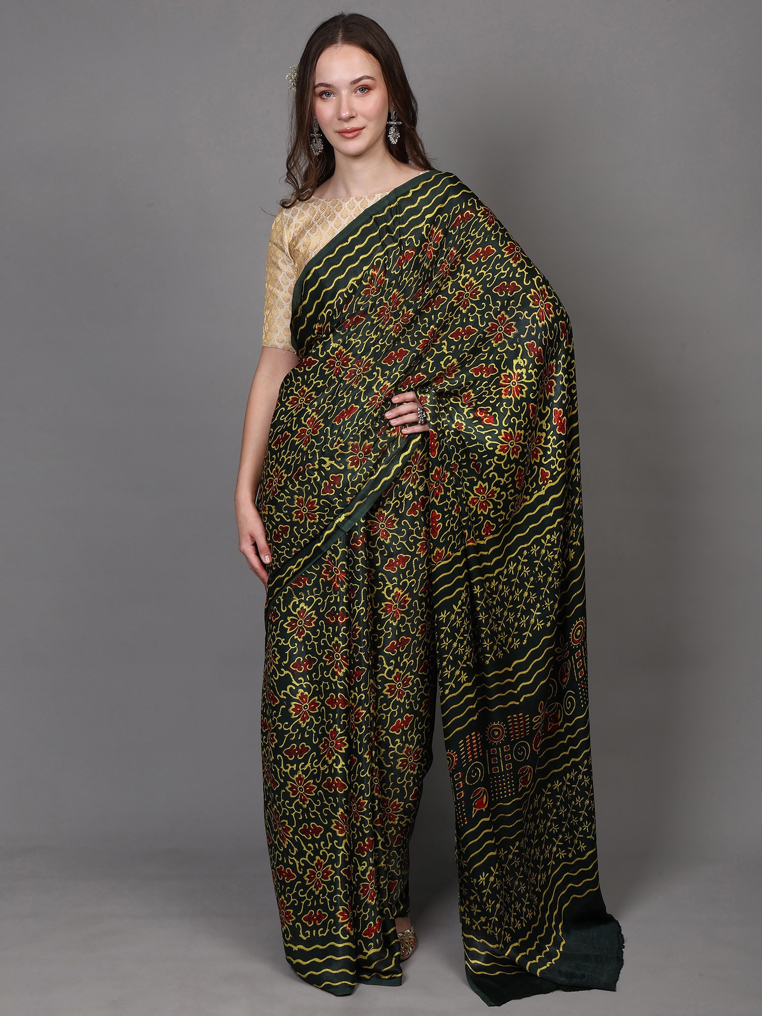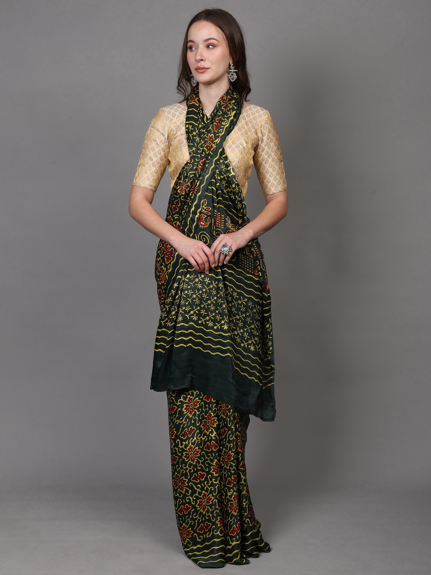 Hunter-Green Silk Saree with Bagru Block Printed Floral Motifs from Madhya Pradesh