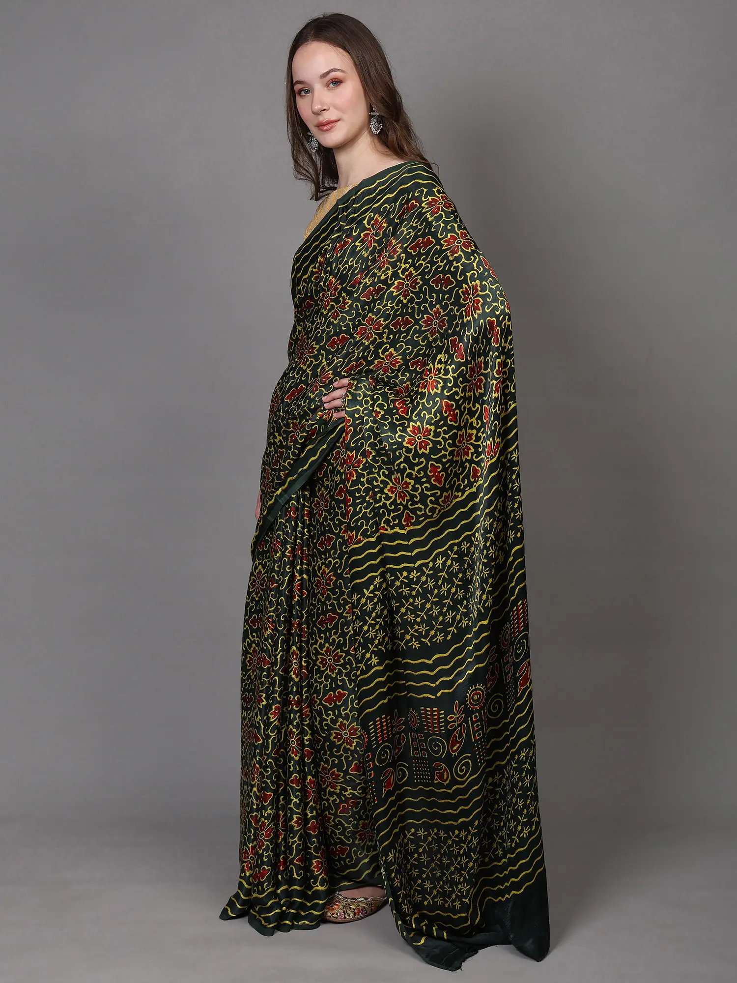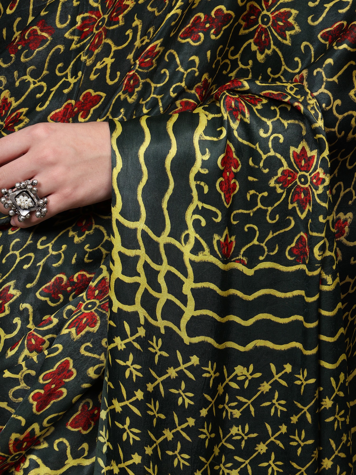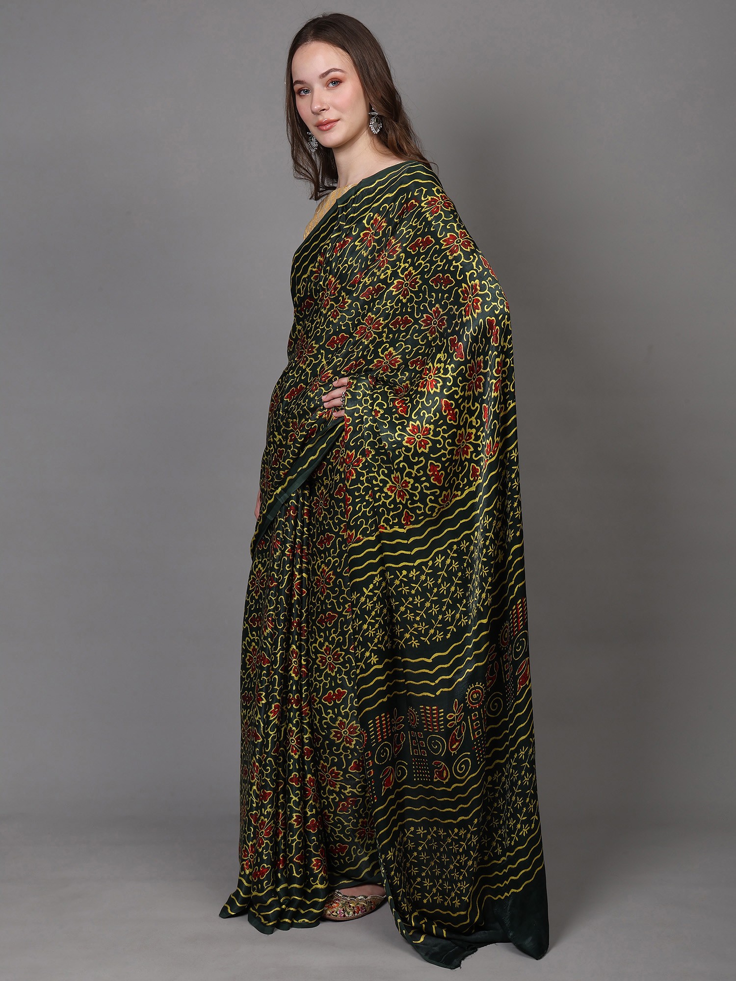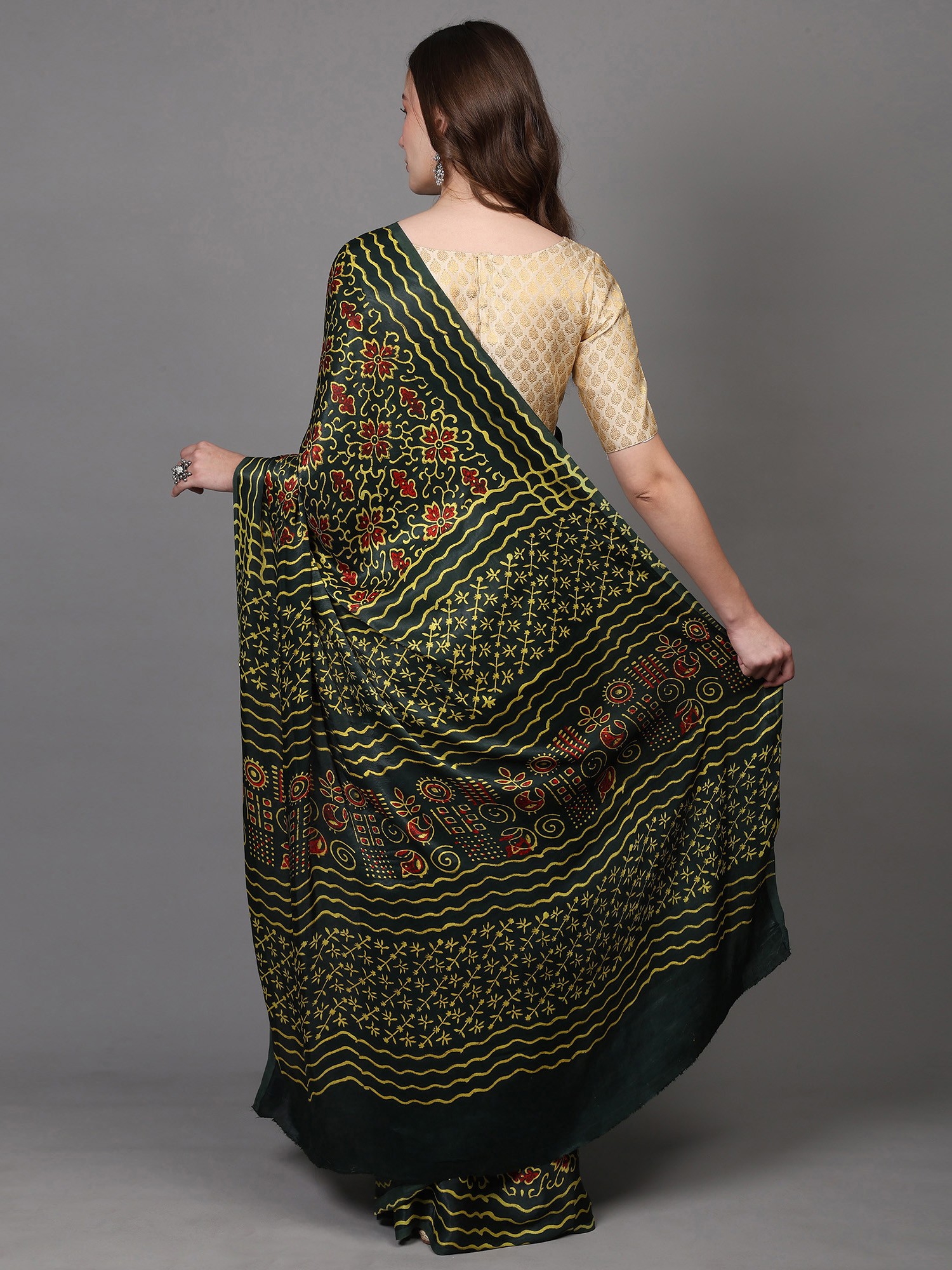 Hunter-Green Silk Saree with Bagru Block Printed Floral Motifs from Madhya Pradesh