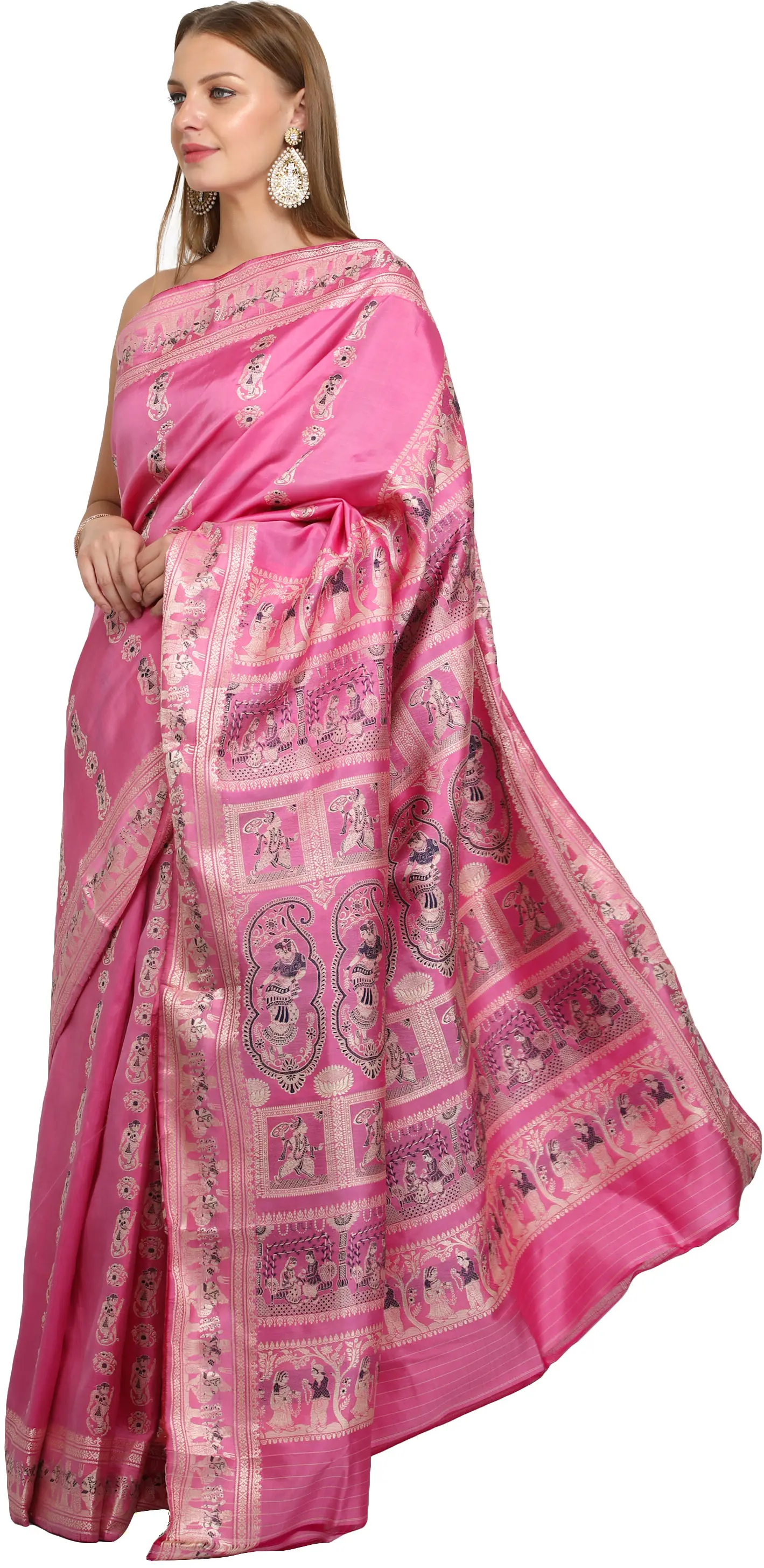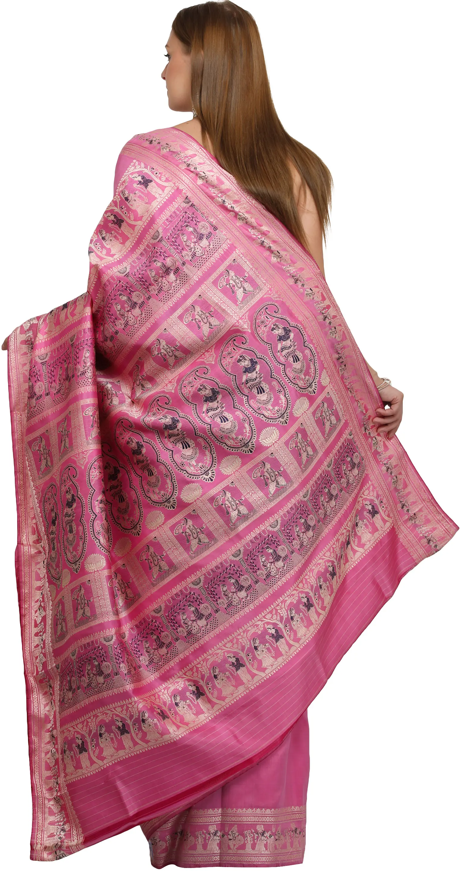 Ibis-Rose Baluchari Sari from Bengal with Woven Stories from life of krishna
