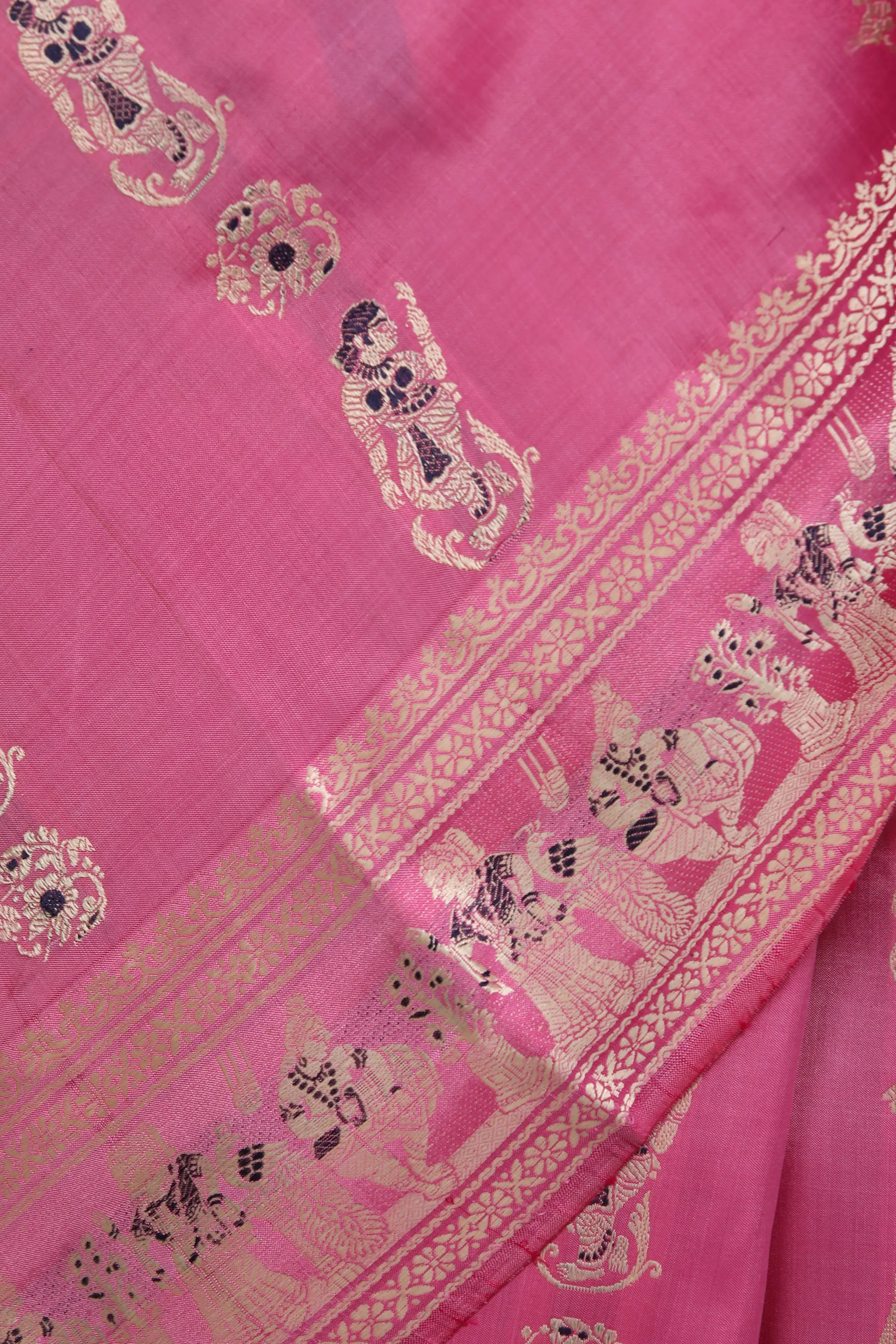 The pure silk fabric lends this sari a lustrous sheen and a fluid drape that is both graceful and luxurious. Silk is celebrated for its natural beauty, its soft touch, and its ability to hold intricate weaves with remarkable clarity. The vibrant rose color is a testament to the beauty of natural dyes, offering a rich and enduring hue that complements the detailed silver and gold threads used in the weaving. When draped, the sari cascades elegantly, highlighting the beauty of the wearer while the woven tales unfold with every movement. This sari is designed to make a statement, whether for a special occasion, a festive celebration, or a formal gathering.