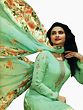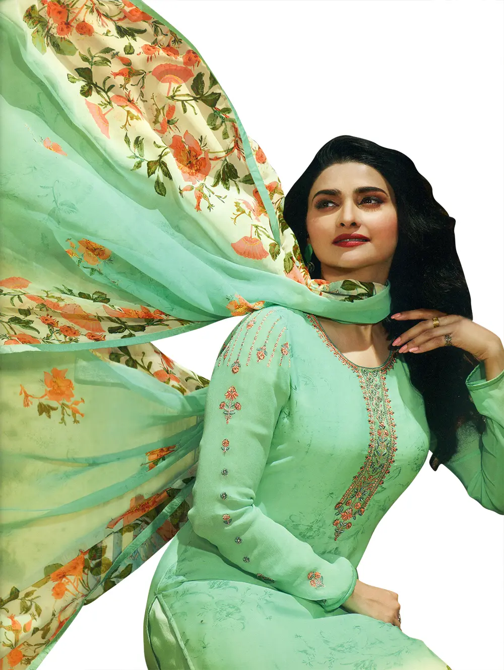 The lovely ice-green hue represents calmness and refinement, resulting in a perfect balance of style and substance. The flower-patterned dupatta gives a whimsical touch to the outfit, completing the ensemble with grace.
