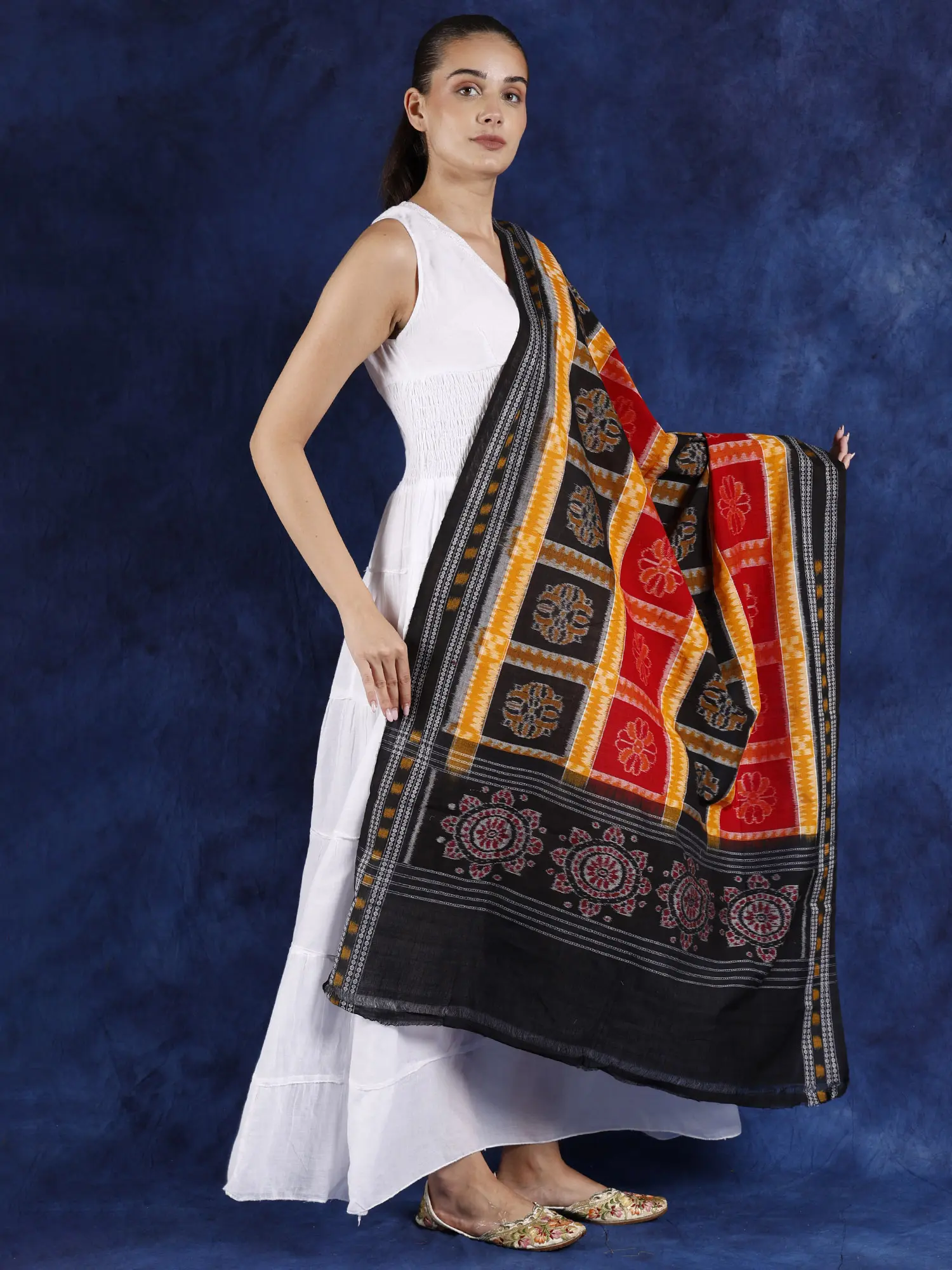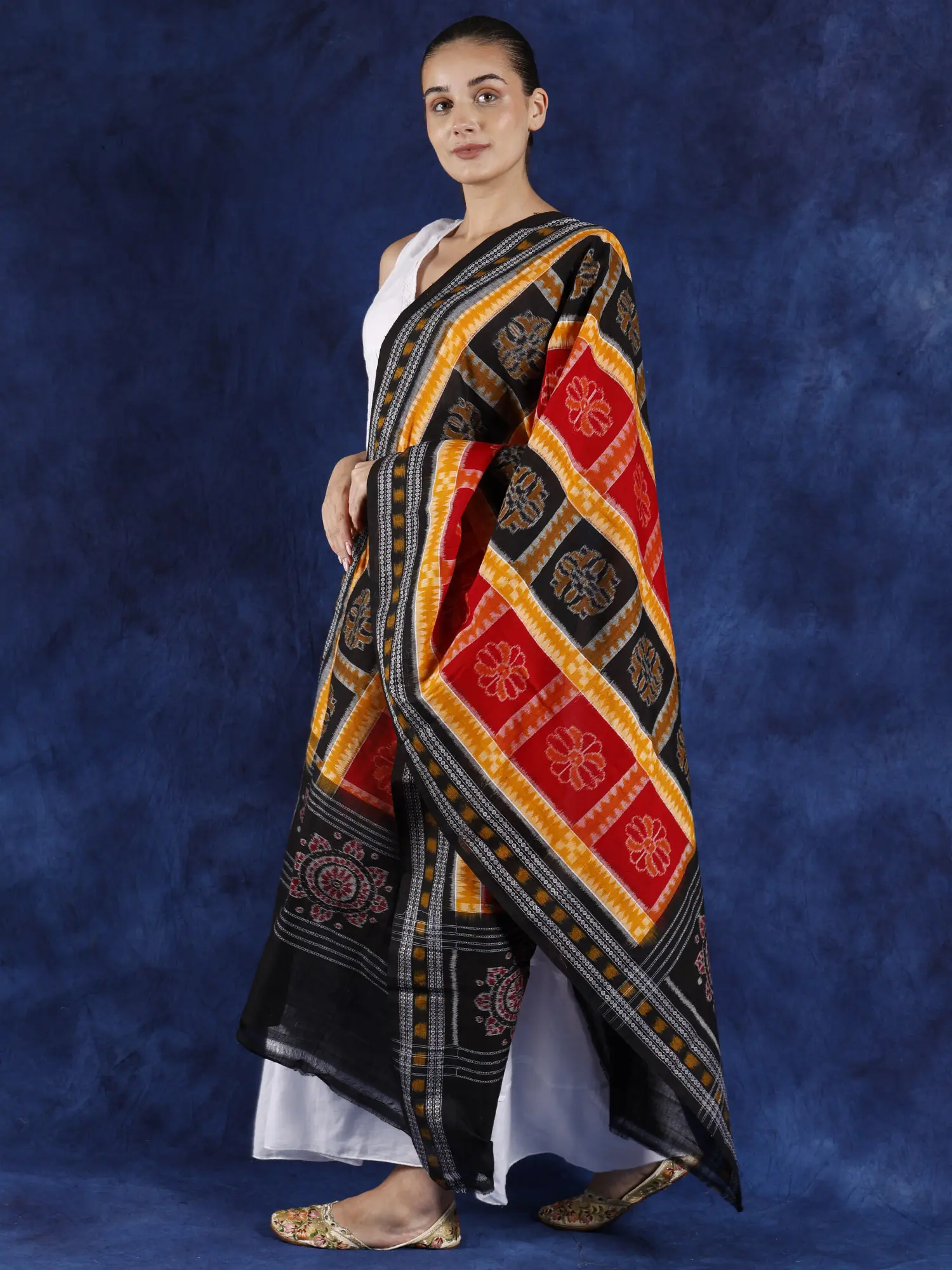 Cactus-Flower Pure Cotton Ikat Handloom Saree with Woven Fish Wide Border and Lady Figure Motifs from Sambhalpur