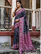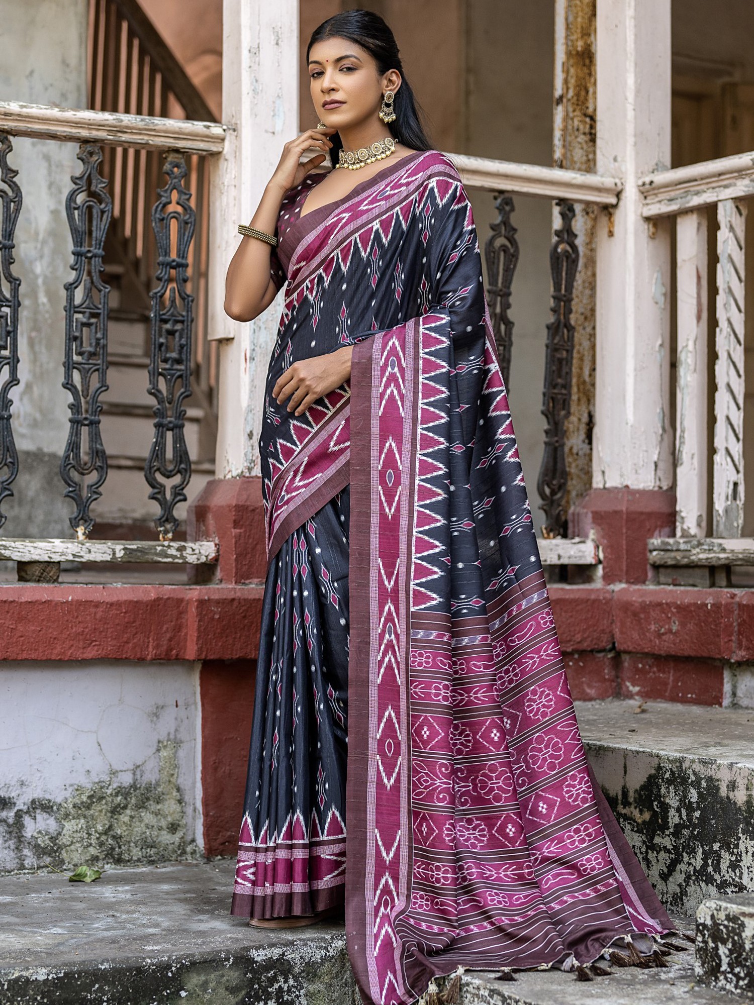 Let the union of silk and cotton give you a regal formal wear with this printed formal-casual saree. The comfort and elegance of cotton silk are taken a level higher with lovely Ikat patterns, printed all over the field of the saree in complementing colors that add a vibrant beauty to the drape. With a matching blouse, this cotton silk saree can be paired with statement oxidized silver jewelry to give you classic Indian workwear.
