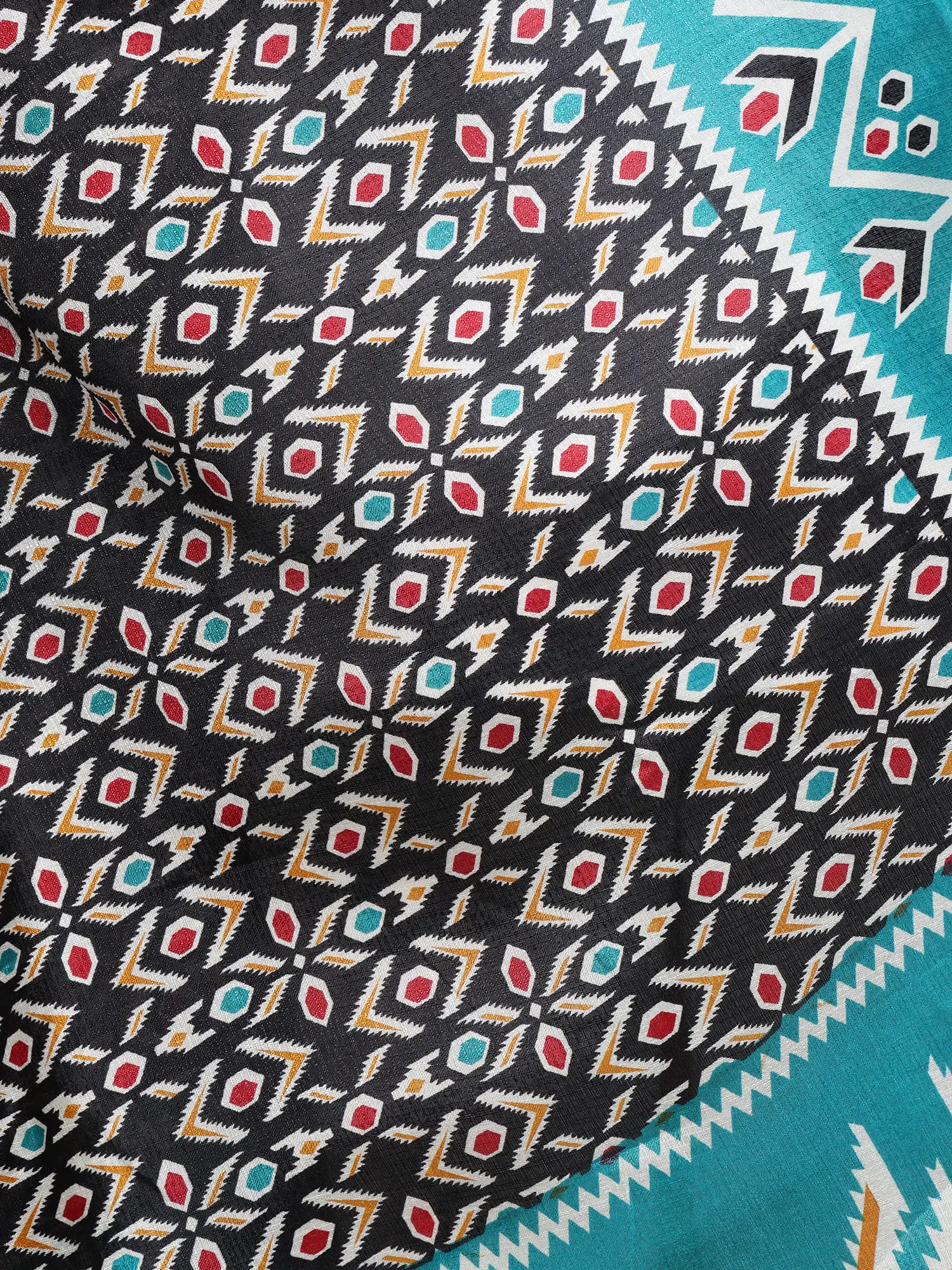 Drape yourself in the rich artistry of our Ikat Print Art Silk Dupatta, a stunning piece that effortlessly blends traditional craftsmanship with modern flair. This exquisite dupatta is crafted from luxurious art silk, offering a soft, smooth, and subtly lustrous drape that feels delightful against your skin. The vibrant Ikat print, featuring a captivating interplay of black, teal, white, and pops of red and gold, adds a touch of sophisticated bohemian charm to any ensemble. The intricate geometric patterns tell a story of heritage and style, making this dupatta a true statement piece. The teal border, framed by a captivating Ikat design, adds a striking contrast to the black center, further enhancing the visual appeal. This beautiful dupatta is perfect for adding a touch of elegance to your ethnic wear, whether it's a kurta, salwar kameez, or even a simple gown.
