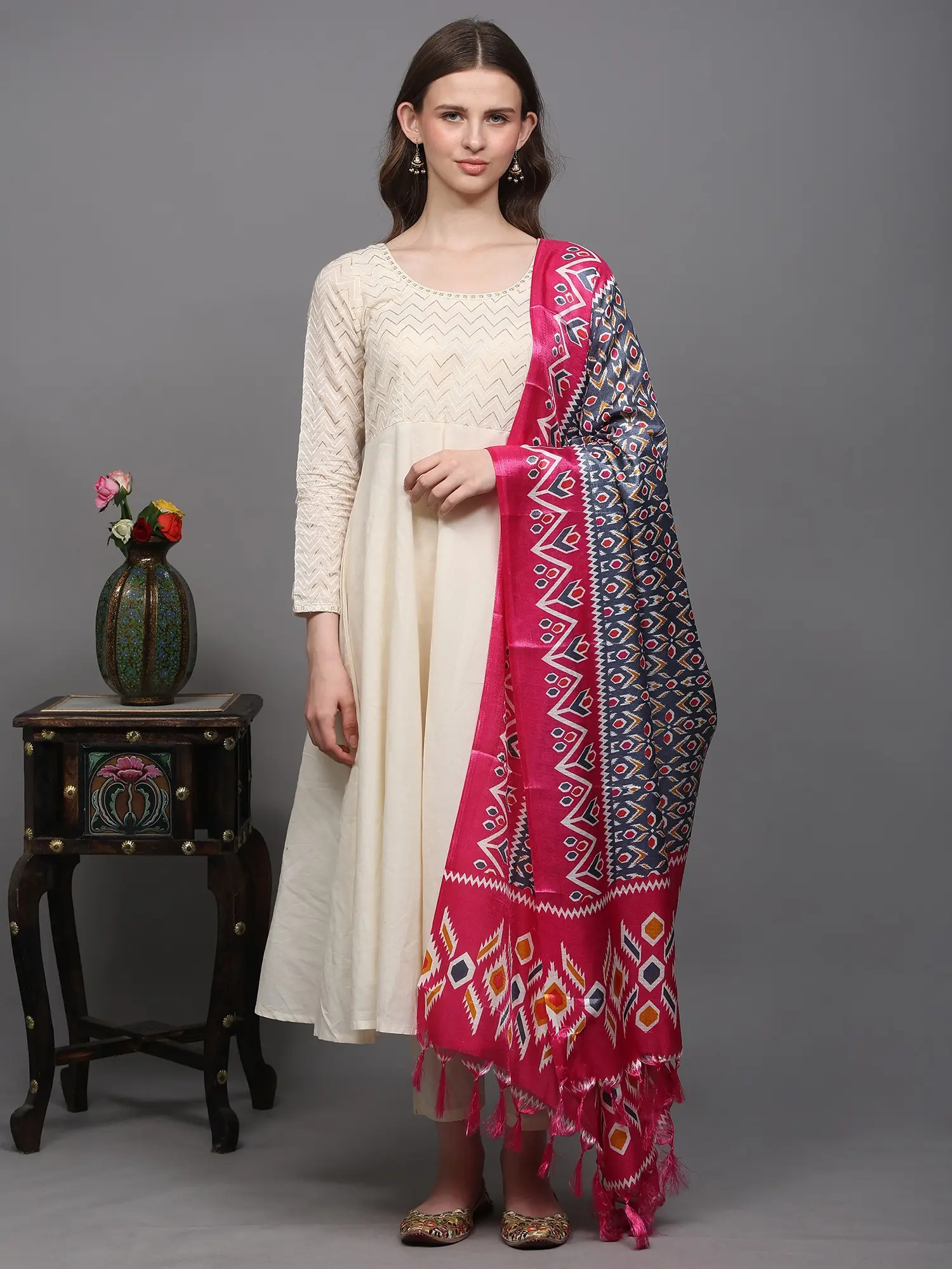 To ensure your Ikat Print Art Silk Dupatta retains its beauty for years to come, we recommend gentle hand washing with cold water and mild detergent. Avoid harsh chemicals, bleach, or machine washing. Air dry flat in the shade away from direct sunlight to prevent color fading. With proper care, this stunning dupatta will remain a cherished part of your wardrobe, a timeless reminder of exquisite style and impeccable quality. Its durable nature and the resilience of its vibrant colors make this a worthy investment for the discerning fashion enthusiast. It’s an effortless way to elevate your ethnic wardrobe, adding personality and a touch of sophisticated artistry to your style.