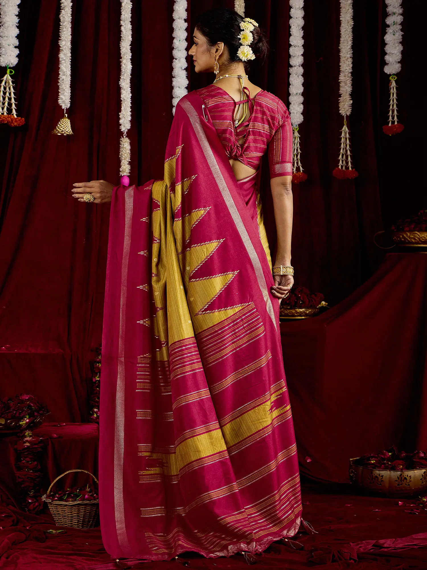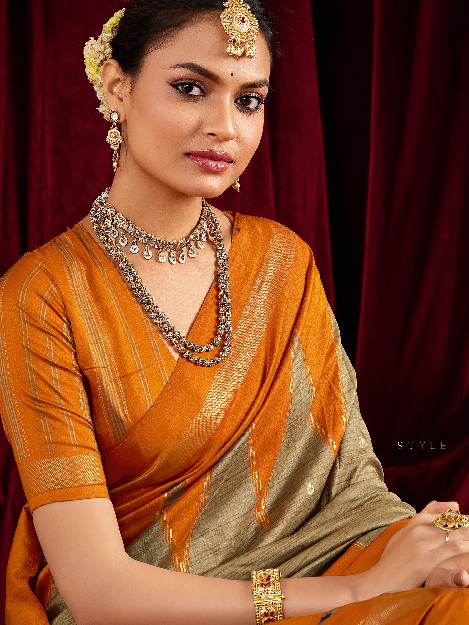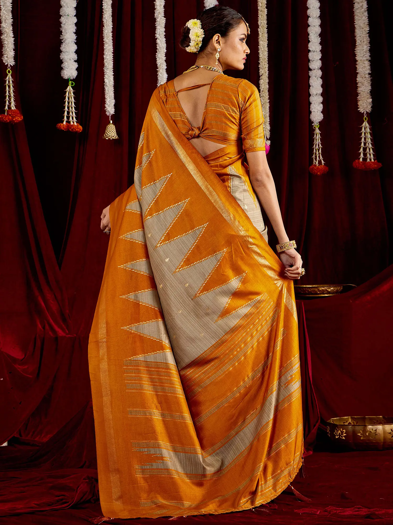 You'll be captivated by the striking zig-zag print, a modern interpretation of a classic motif that adds a dynamic visual appeal. The rich, warm hues of the silk create a sophisticated contrast, highlighted by subtle metallic threads that shimmer with every movement. The generous length allows for graceful draping, while the accompanying blouse fabric can be tailored precisely to your measurements for a perfect, personalized fit.