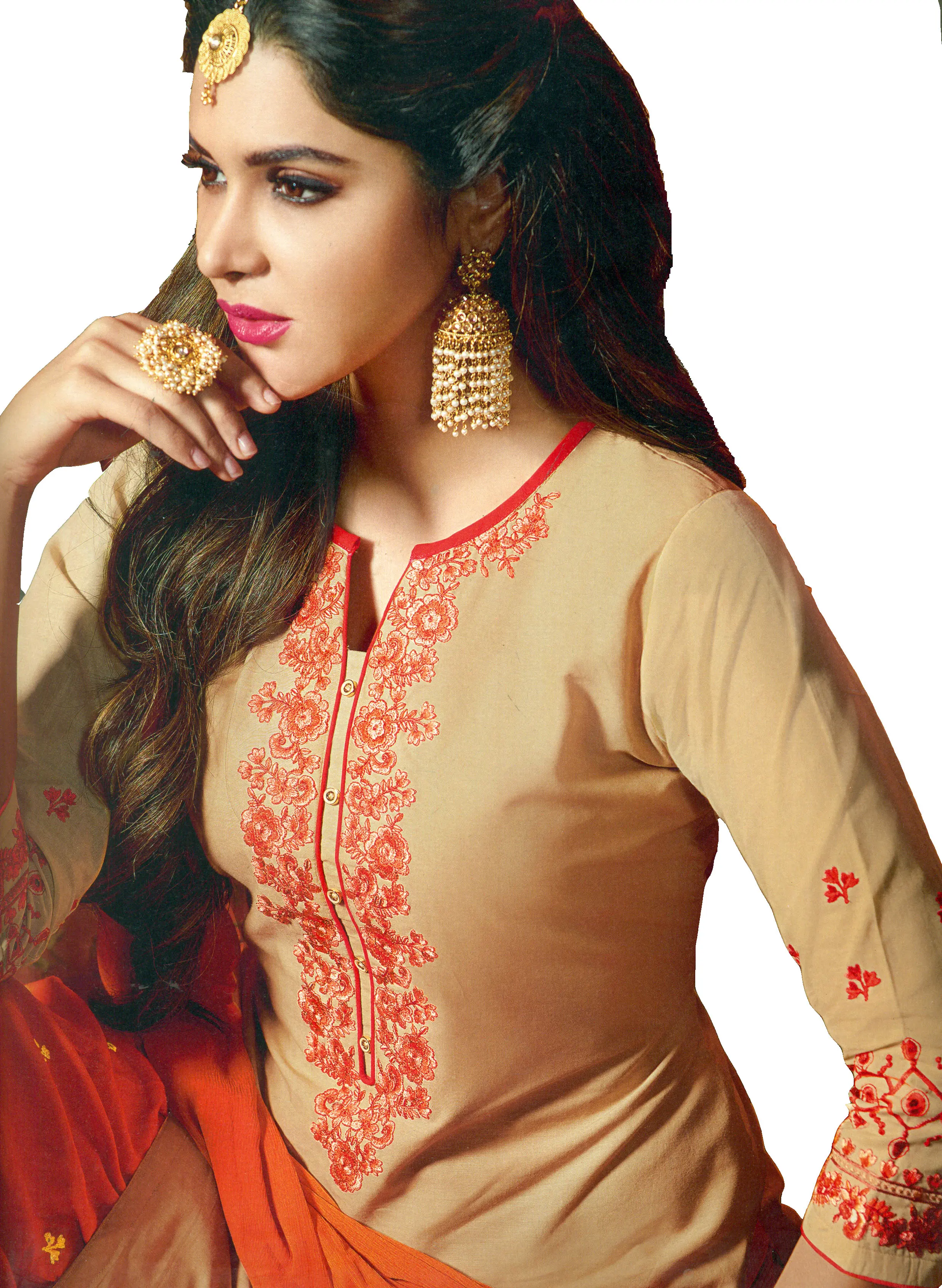 Linen Cotton Embroidery Work And V-Neck Salwar Suit With Floral Dupatta For Festival Occasion